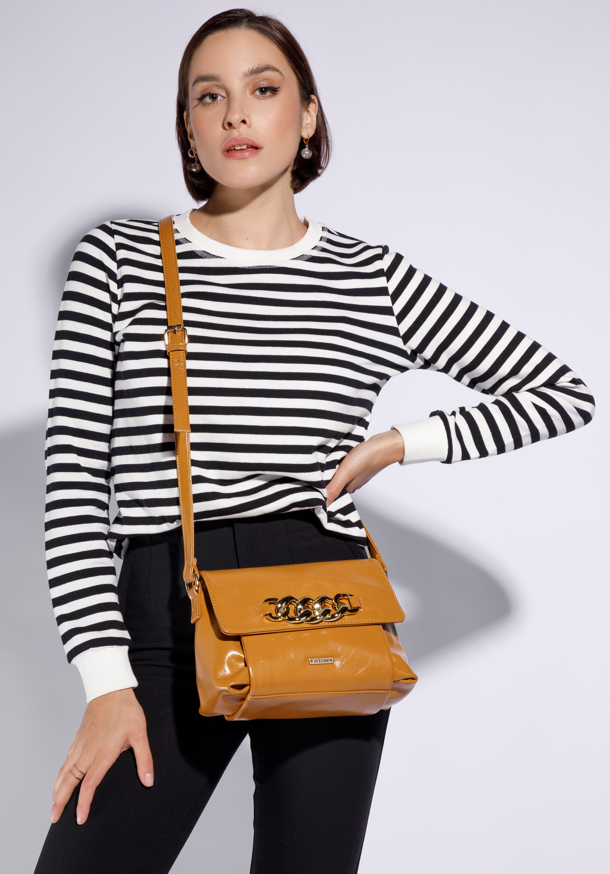 Ця жіноча сумка - чудовий вибір не тільки для особливих випадків. Блискуча лакована шкіра додає нотку стилю цієї сумці, а товстий пластиковий ланцюжок доповнює стильно. Дана модель має оригінальну трапецієподібну форму з посиленою передньою частиною та м''якими боками. Всередині можна помістити телефон, гаманець, сонцезахисні окуляри, невеликий календар і кілька дрібниць - ідеально підійде для прогулянки, кінотеатру або вишуканої вечері. Ця сумка стильно доповнить класичні образи, а комплекту з чінос і сорочкою додасть шику. Жіноча сумка з лакованої екошкіри з ланцюжком на клапані - елегантний аксесуар, який підкреслить будь-який, навіть найпростіший, стиль.