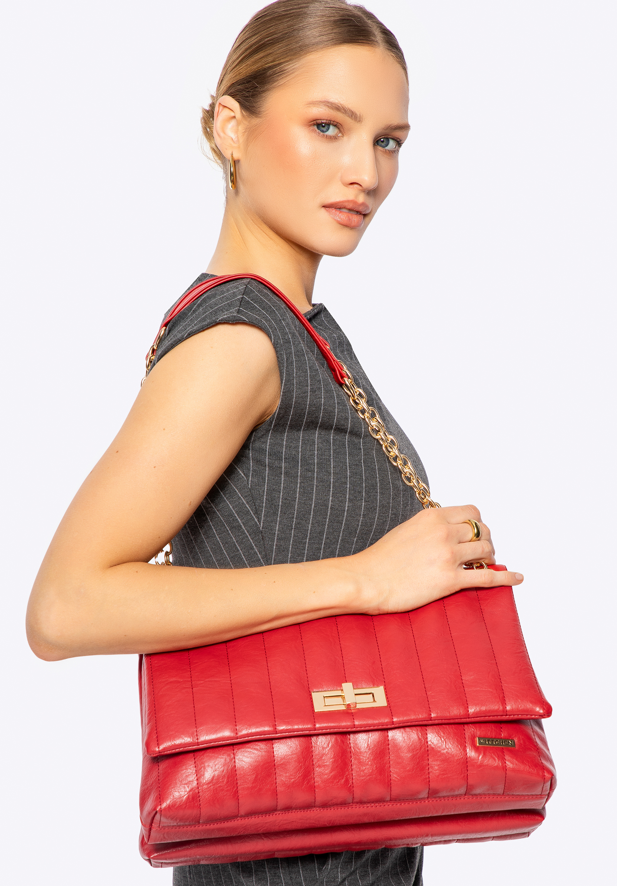 Стильна та надзвичайно функціональна – ця сумка через плече поєднує позачасовий дизайн із сучасними деталями. Виготовлена з екошкіри, вона привертає увагу декоративними швами та металевим ланцюжком, що додає витонченості. Клапан із декоративною пряжкою підкреслює її елегантний стиль, а тонкий логотип бренду на передній частині надає ексклюзивного відчуття. Завдяки просторому внутрішньому простору з трьома кишенями, включно з однією на блискавці, вона легко вміщає всі необхідні речі. Її розмір також дозволяє зручно зберігати документи формату A4.