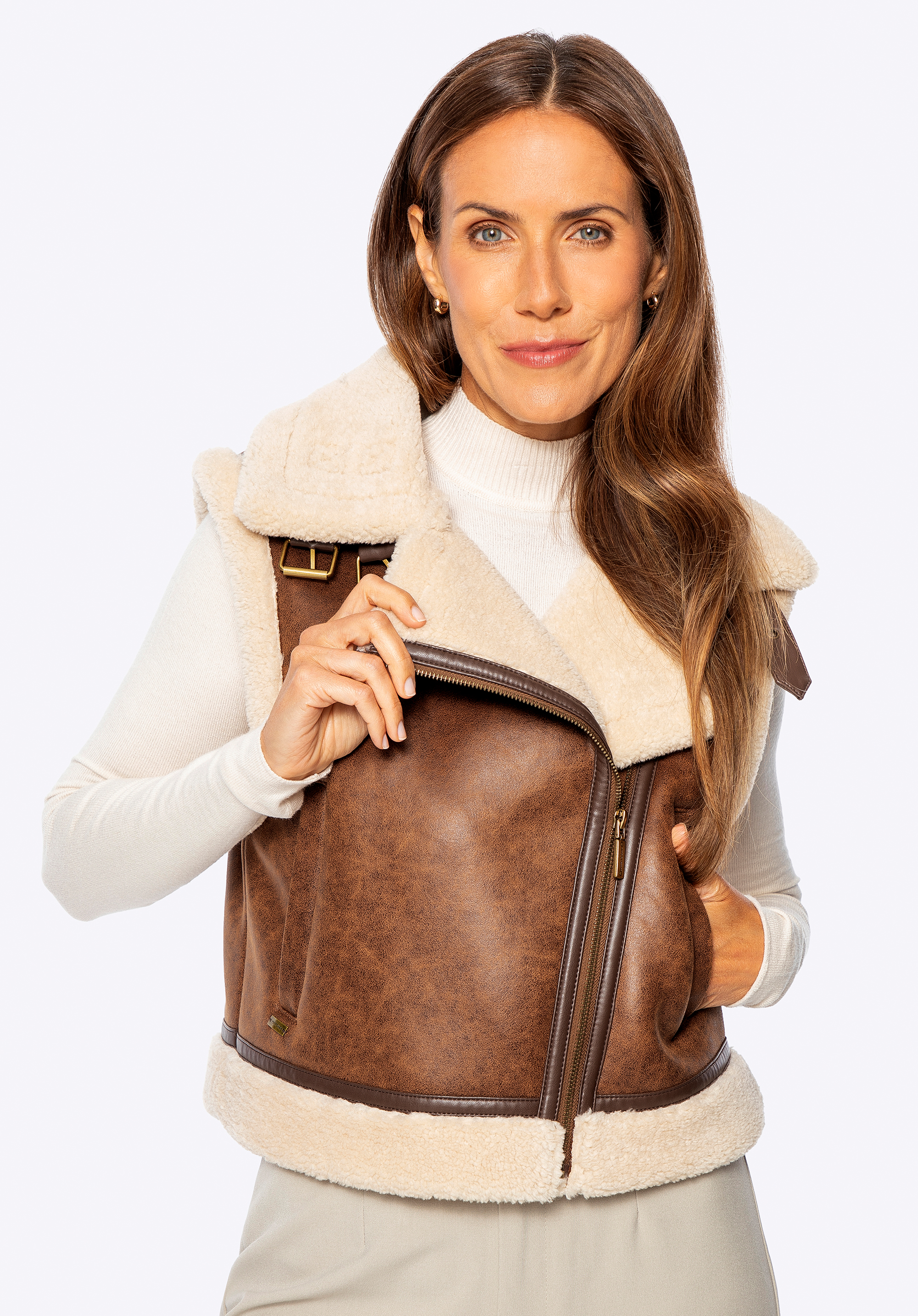 Шукаєте багатошаровий одяг, який поєднує моду та функціональність? Ця жіноча жилетка з м''якого штучного хутра — стильний варіант для прохолодних днів. Регулярний крій та модель без рукавів забезпечують свободу рухів, а асиметрична блискавка додає сучасного характеру. Хутряний комір і окантовка привертають увагу, підкреслюючи зимовий стиль. Дві ремінця з екошкіри дозволяють ефектно стилізувати комір і захищають шию від холоду. Утеплена підкладка забезпечує комфорт навіть при низьких температурах.