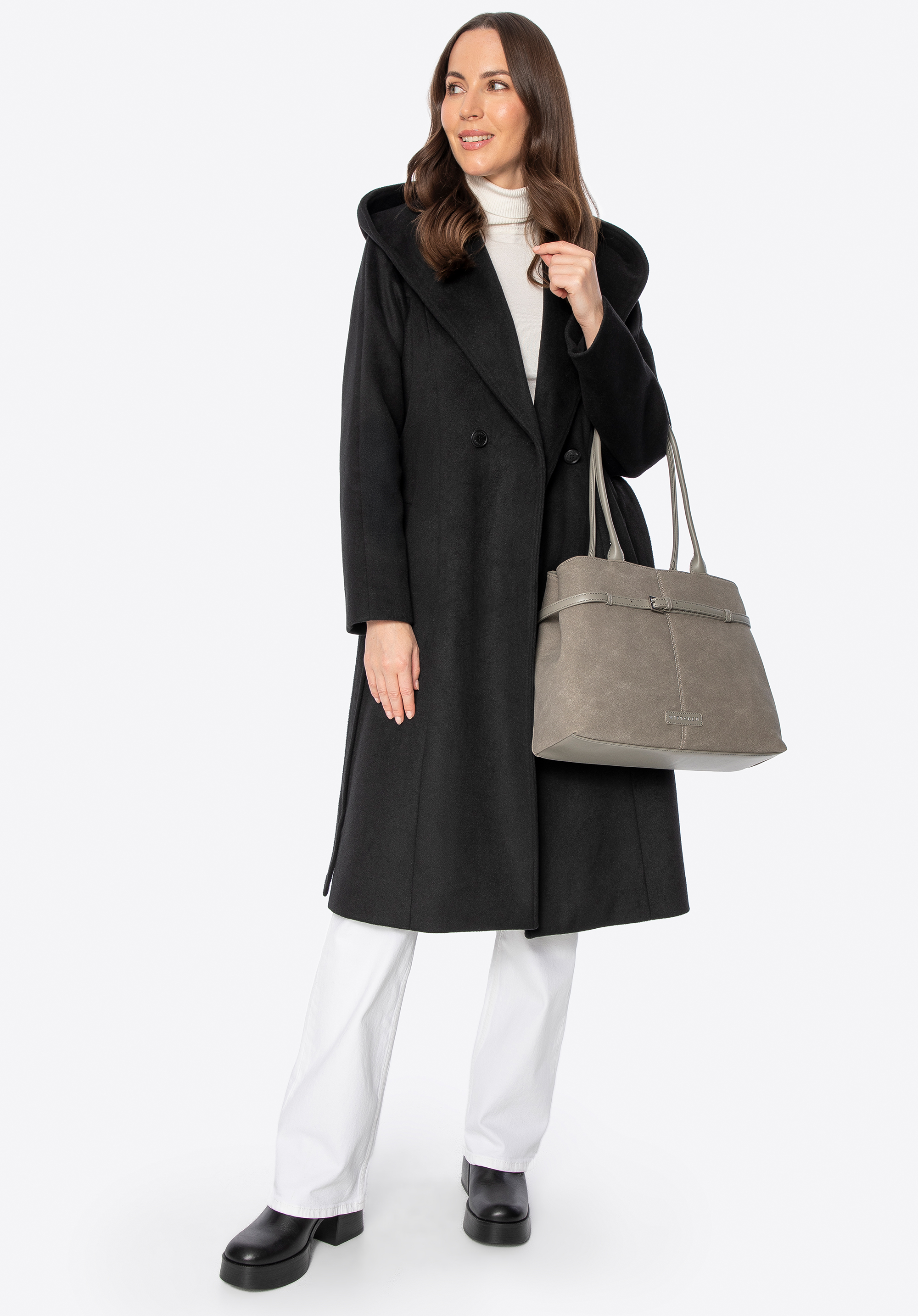 Це довге, двобортне жіноче пальто з капюшоном — поєднання елегантності та функціональності, яке стане чудовим вибором як для міського повсякдення, так і для більш формальних виходів. Створене з увагою до деталей, воно зачаровує класичним кроєм, доповненим сучасними рішеннями: застібкою на гудзики, регульованим поясом на талії та делікатним розрізом ззаду. Капюшон додає образу невимушеного, кежуального характеру, водночас захищаючи від холоду та вітру. Дві бокові кишені забезпечують зручність, а підкладка з віскози гарантує комфорт навіть у поєднанні з теплішими образами.