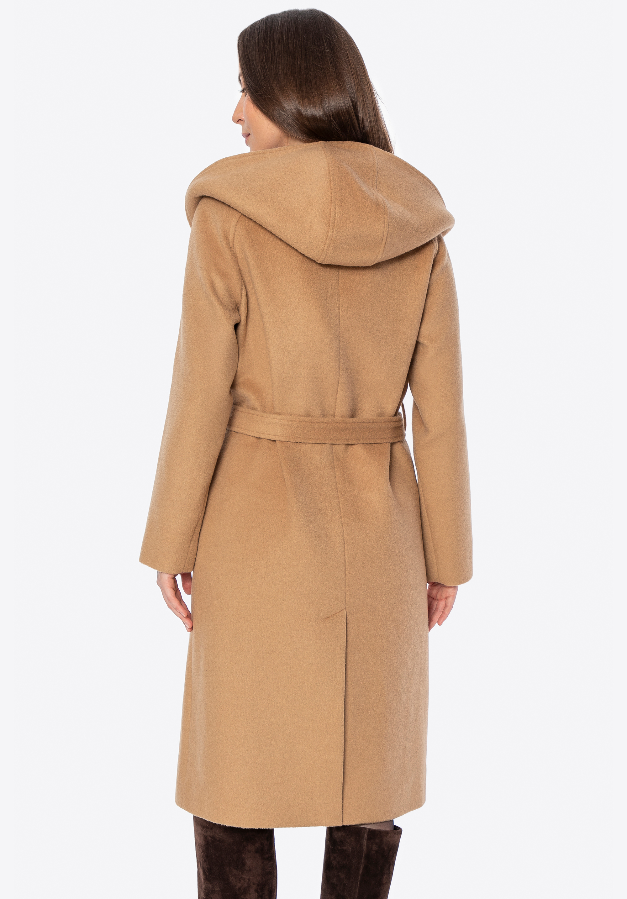 Класика з сучасним відтінком – довге жіноче пальто з капюшоном та поясом