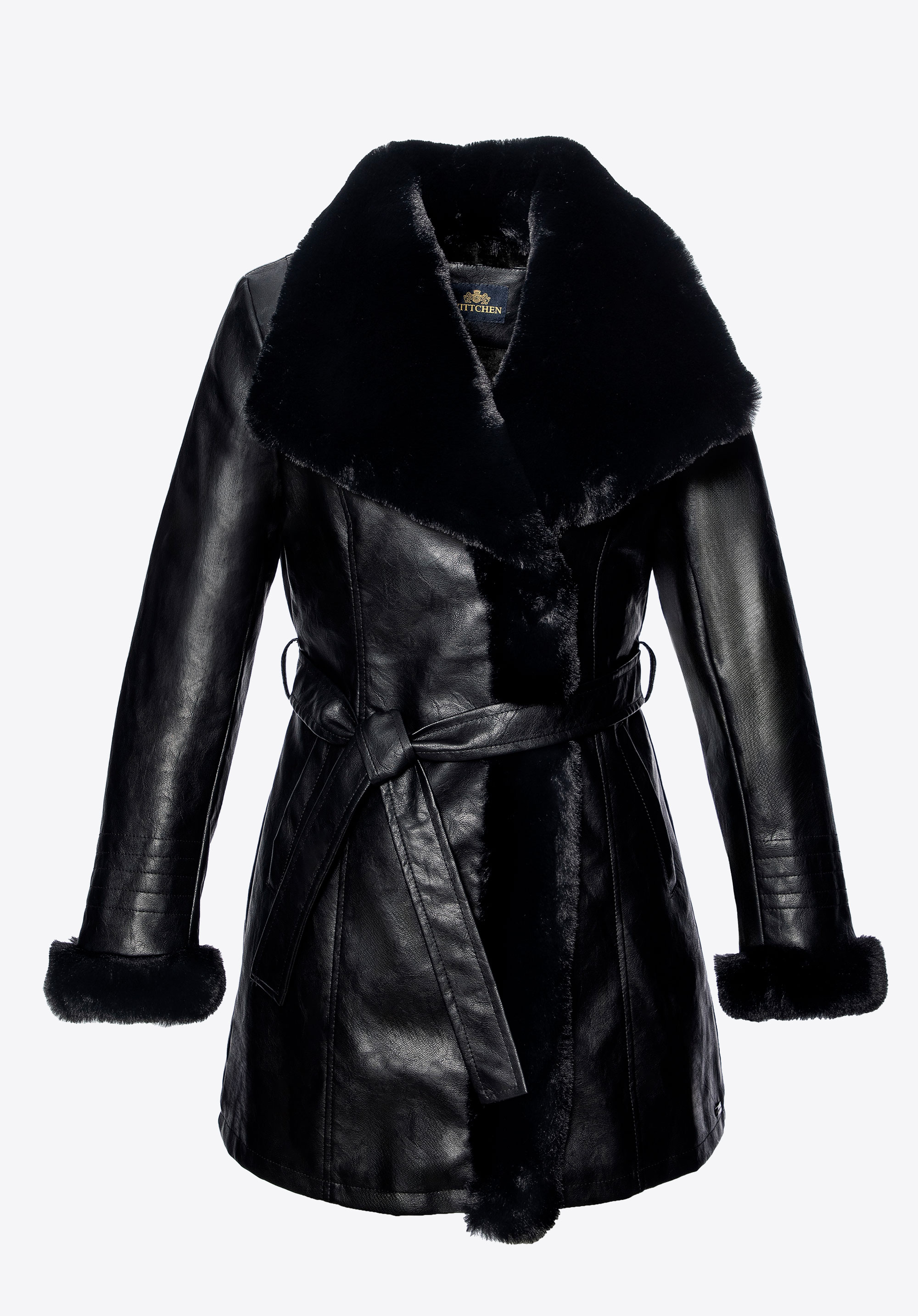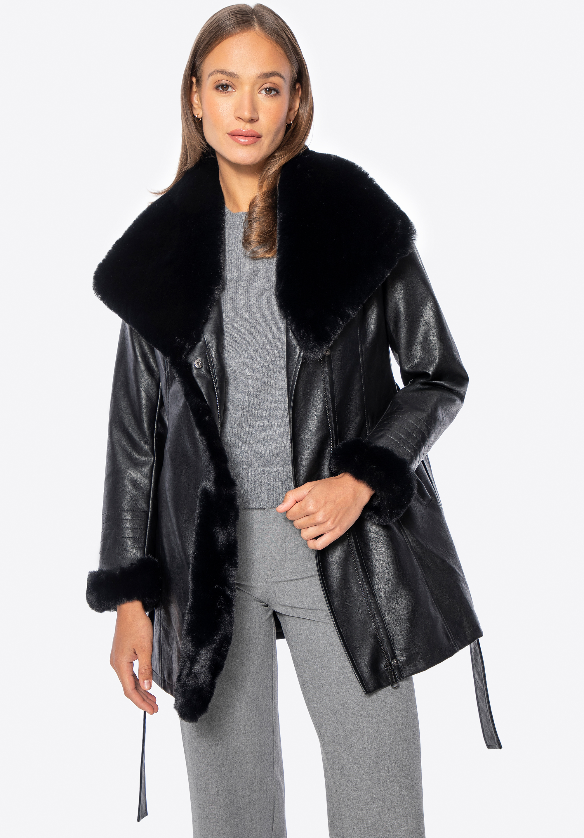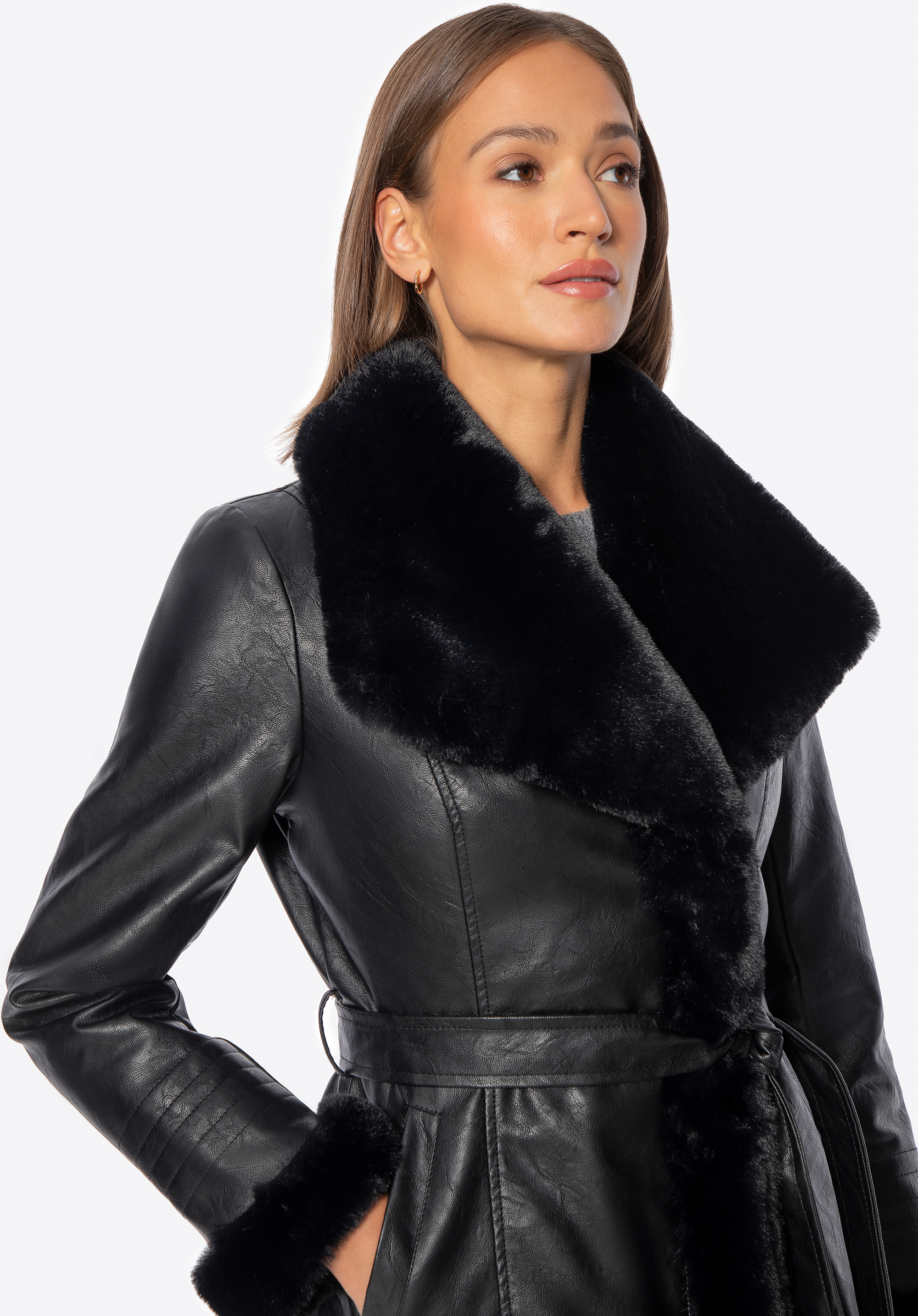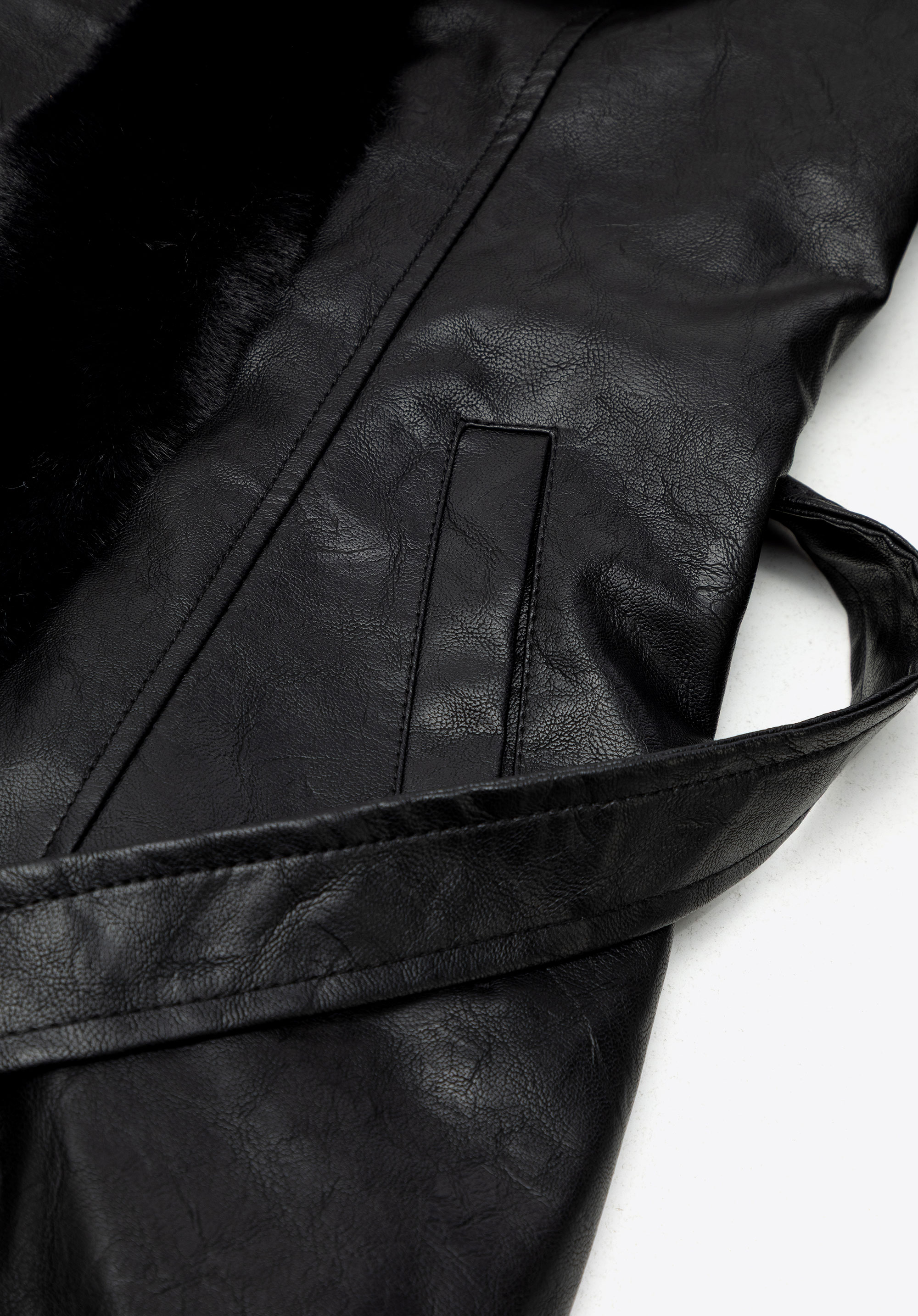 Ця жіноча куртка зі штучної шкіри з м'яким штучним хутром – ідеальне поєднання позачасової елегантності та практичності. Приталений крій та пояс на талії чудово підкреслюють жіночний силует, додаючи легкості та сучасного характеру. Делікатна строчка на рукавах надає куртці витонченої текстури та особливого стилю. Похилі кишені не тільки чудово виглядають, але й практичні – ідеально підходять для зберігання дрібних предметів першої необхідності або швидкого зігрівання рук. Додаткові внутрішні застібки-кнопки вздовж блискавки забезпечують кращу посадку та надійний захист від холоду.