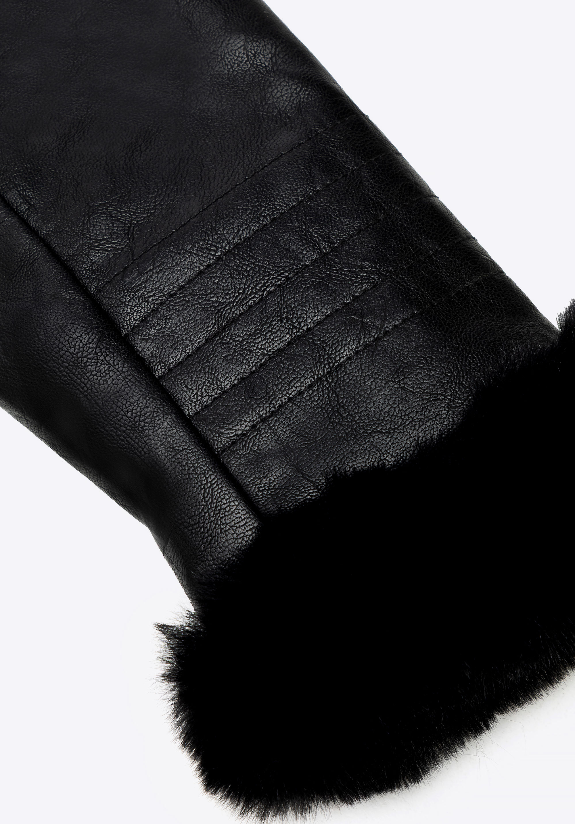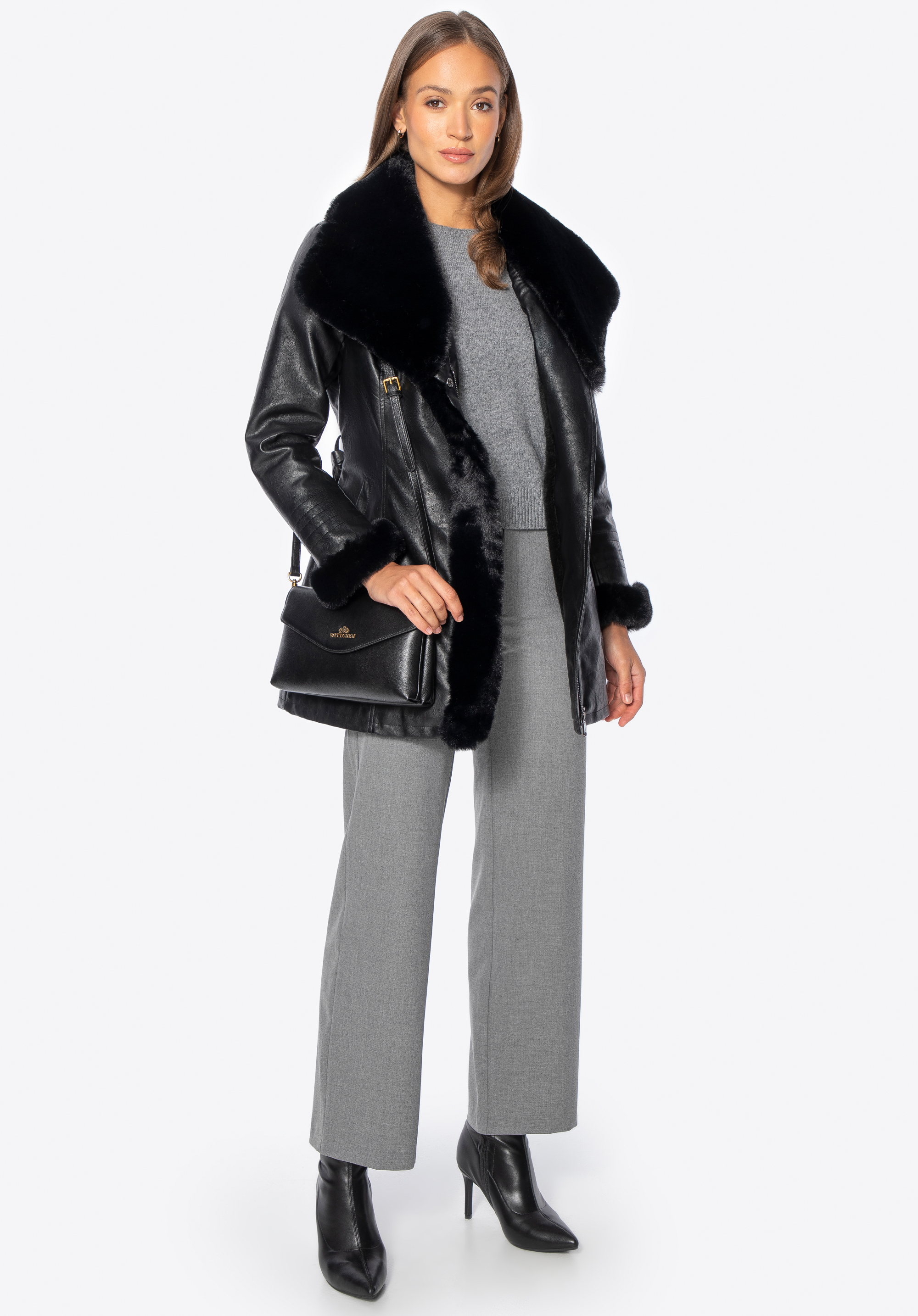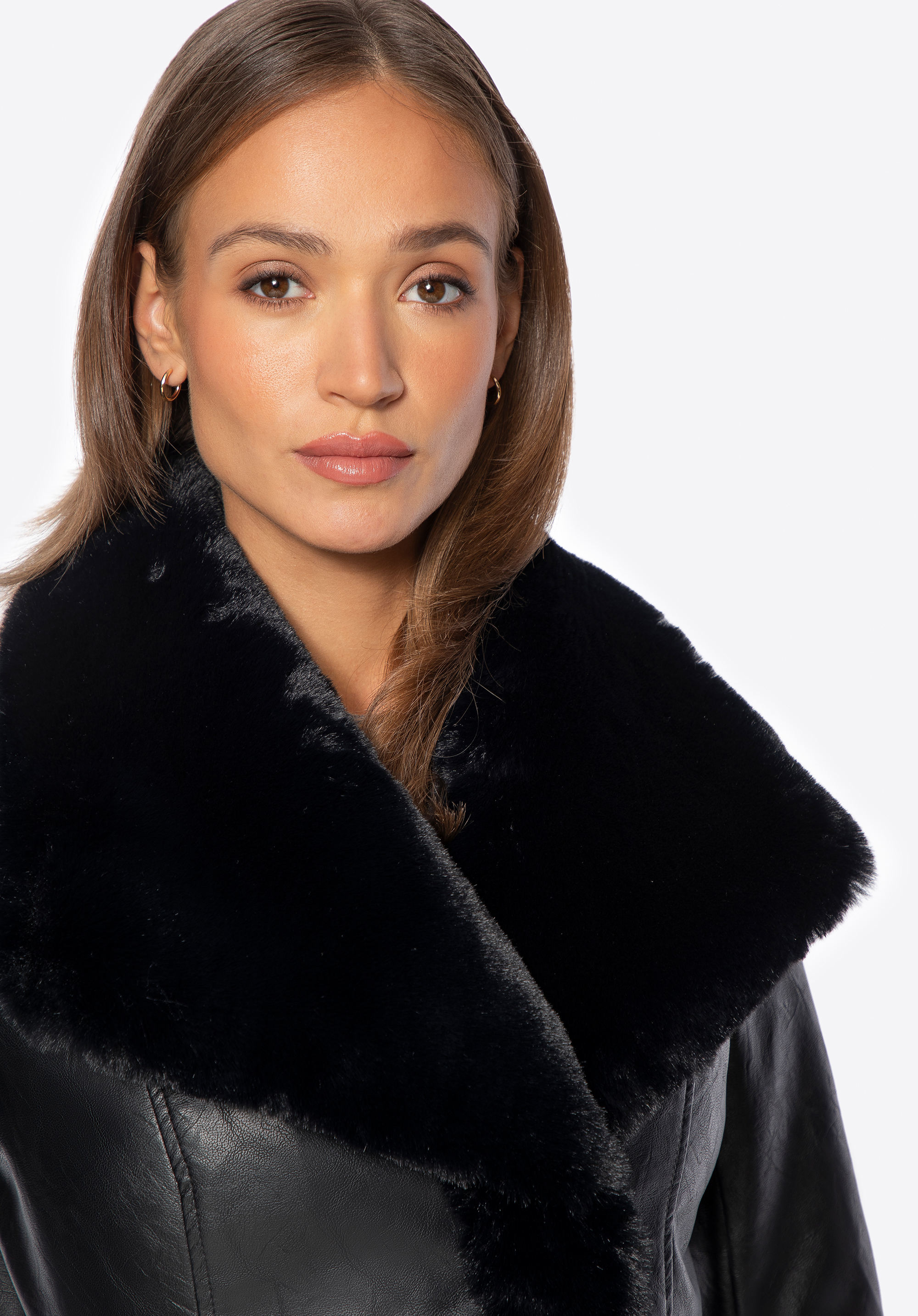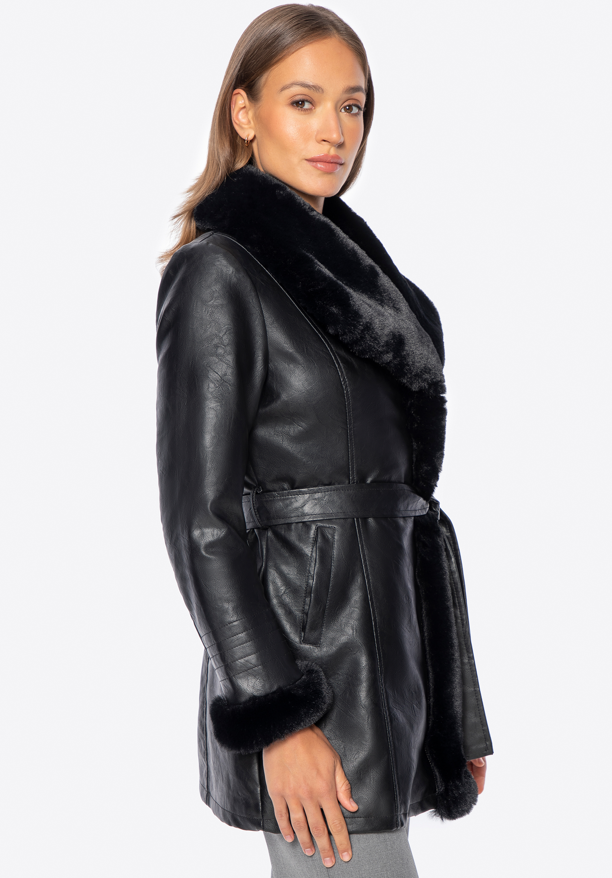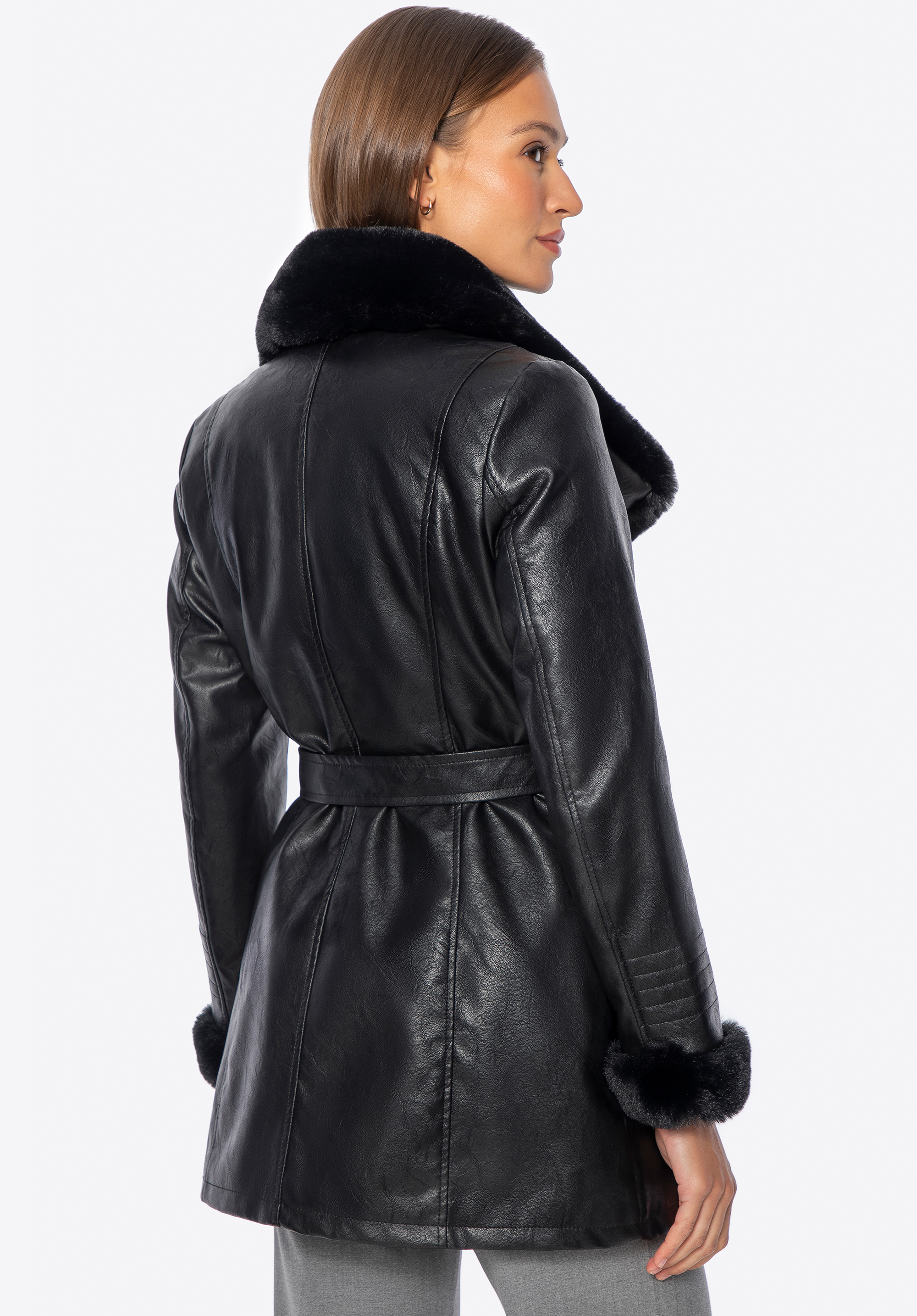 Ця жіноча куртка зі штучної шкіри з м'яким штучним хутром – ідеальне поєднання позачасової елегантності та практичності. Приталений крій та пояс на талії чудово підкреслюють жіночний силует, додаючи легкості та сучасного характеру. Делікатна строчка на рукавах надає куртці витонченої текстури та особливого стилю. Похилі кишені не тільки чудово виглядають, але й практичні – ідеально підходять для зберігання дрібних предметів першої необхідності або швидкого зігрівання рук. Додаткові внутрішні застібки-кнопки вздовж блискавки забезпечують кращу посадку та надійний захист від холоду.