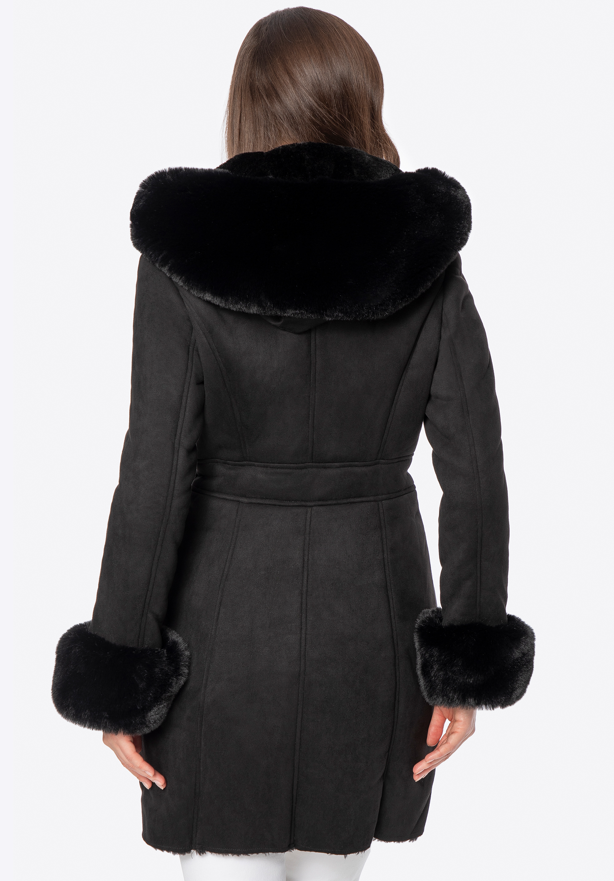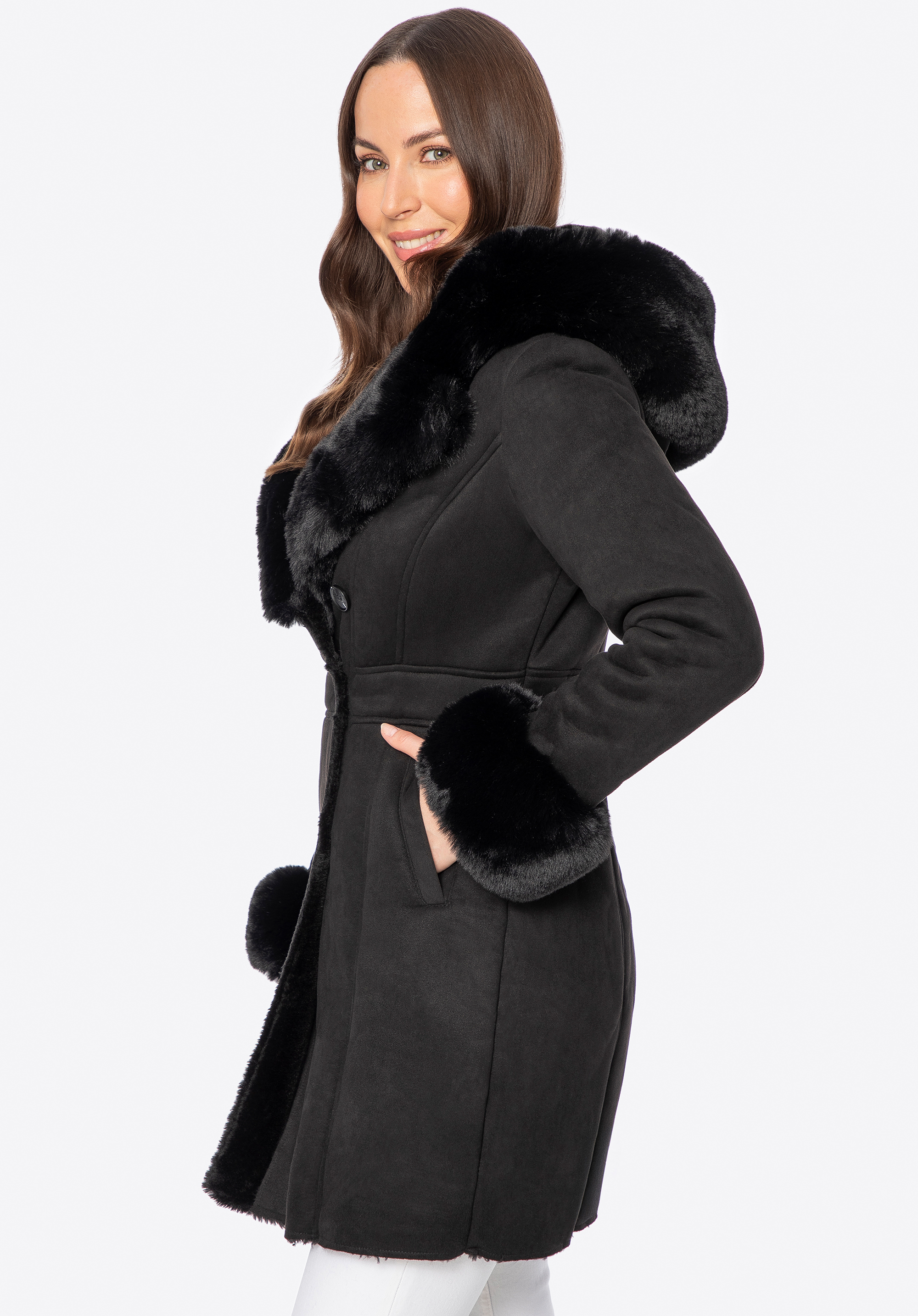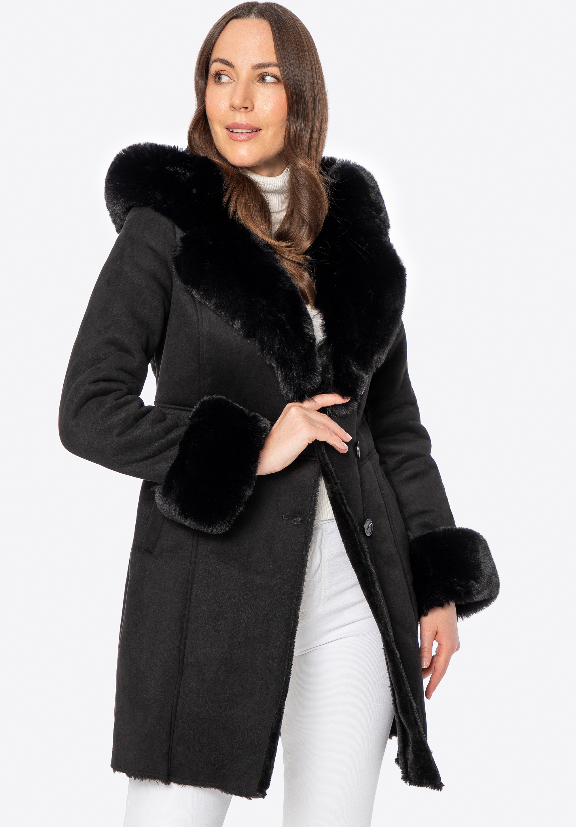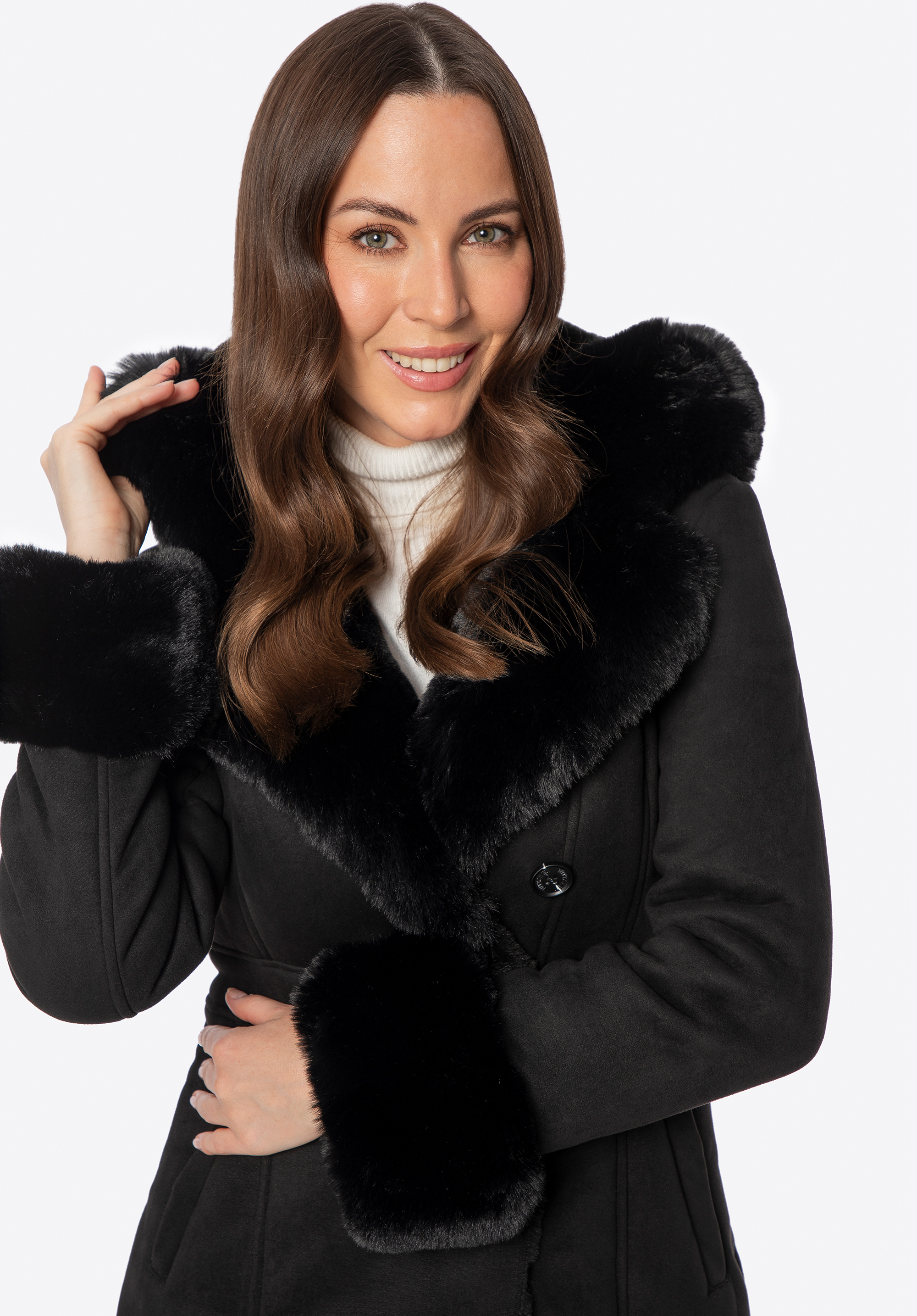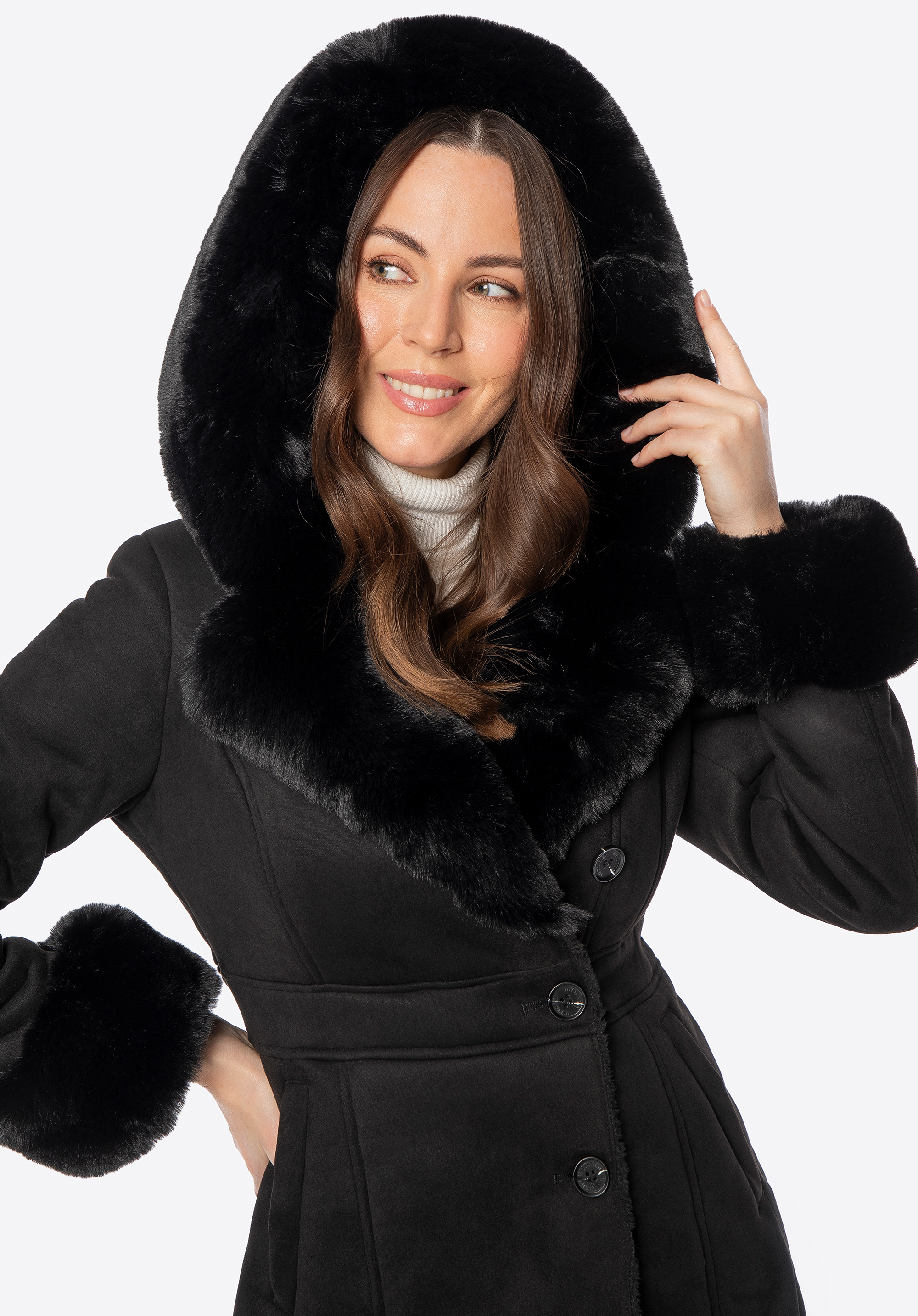 Це жіноче пальто – поєднання класики та комфорту для прохолодних днів. Виготовлене повністю з м''якого штучного хутра, воно забезпечує тепло та приємно облягає фігуру. Талійований крій підкреслює жіночну фігуру, додаючи загальному образу елегантності. Пальто має капюшон, хутряні манжети та підкладку, що додатково захищає від холоду та додає затишного, розкішного акценту.