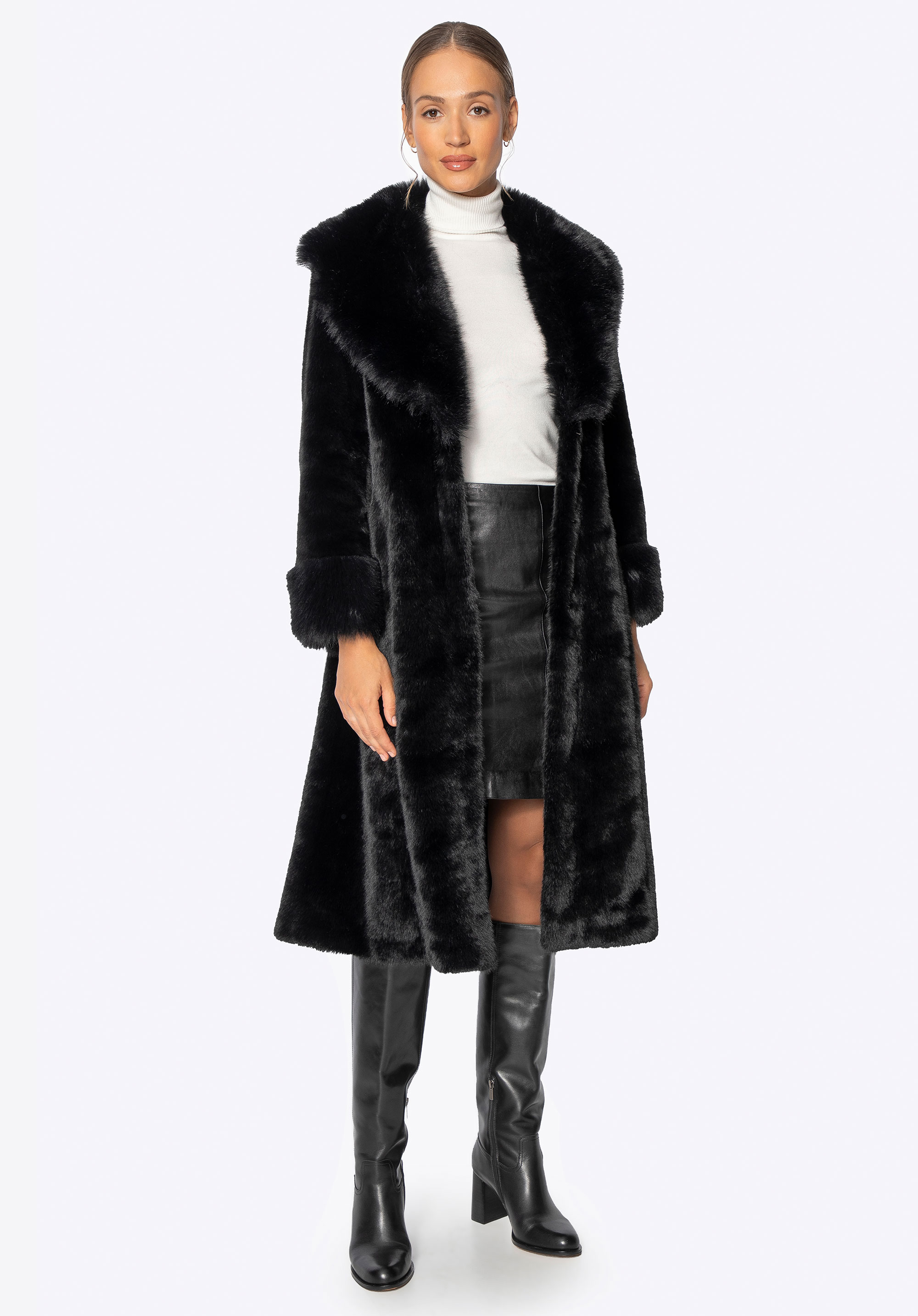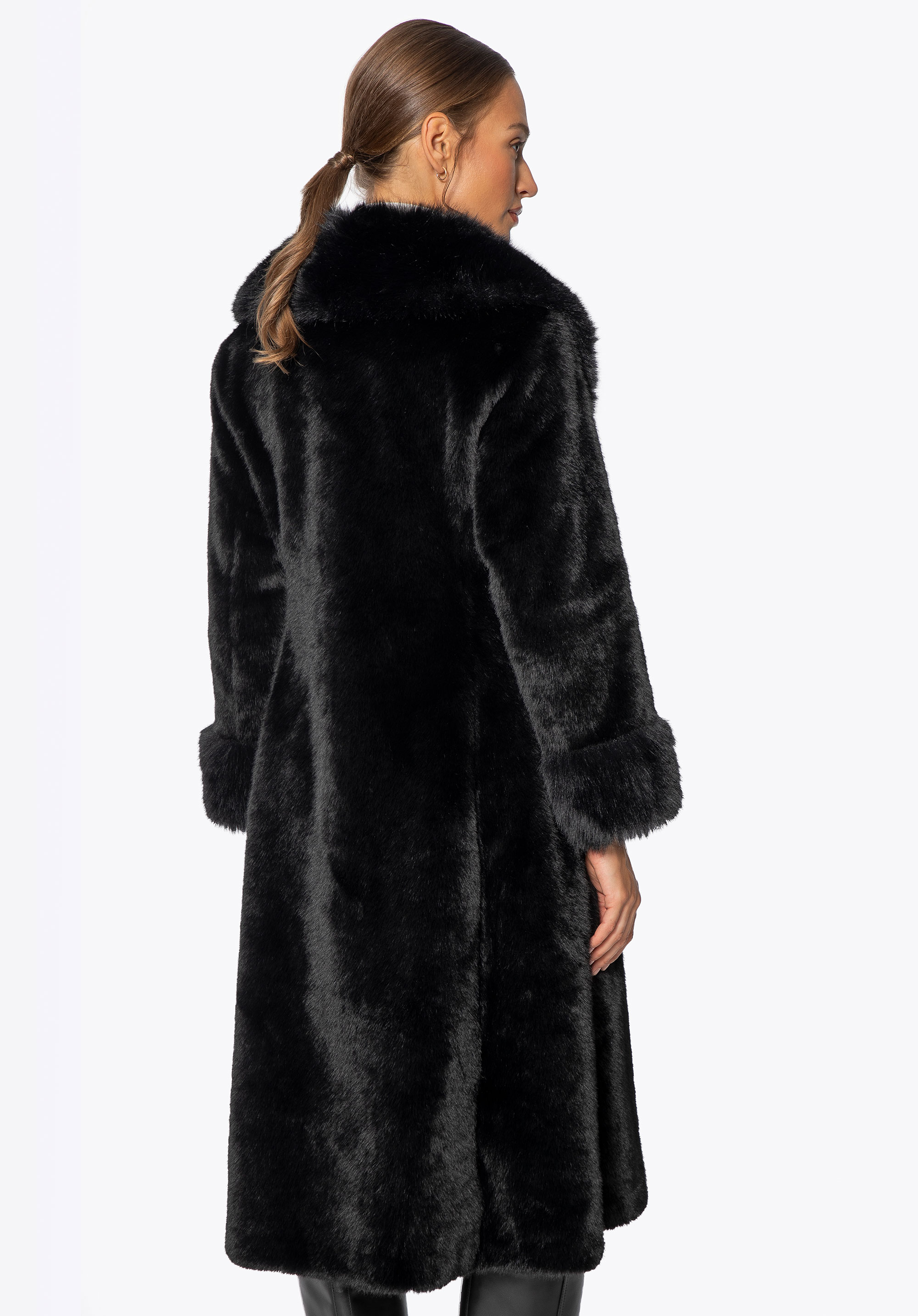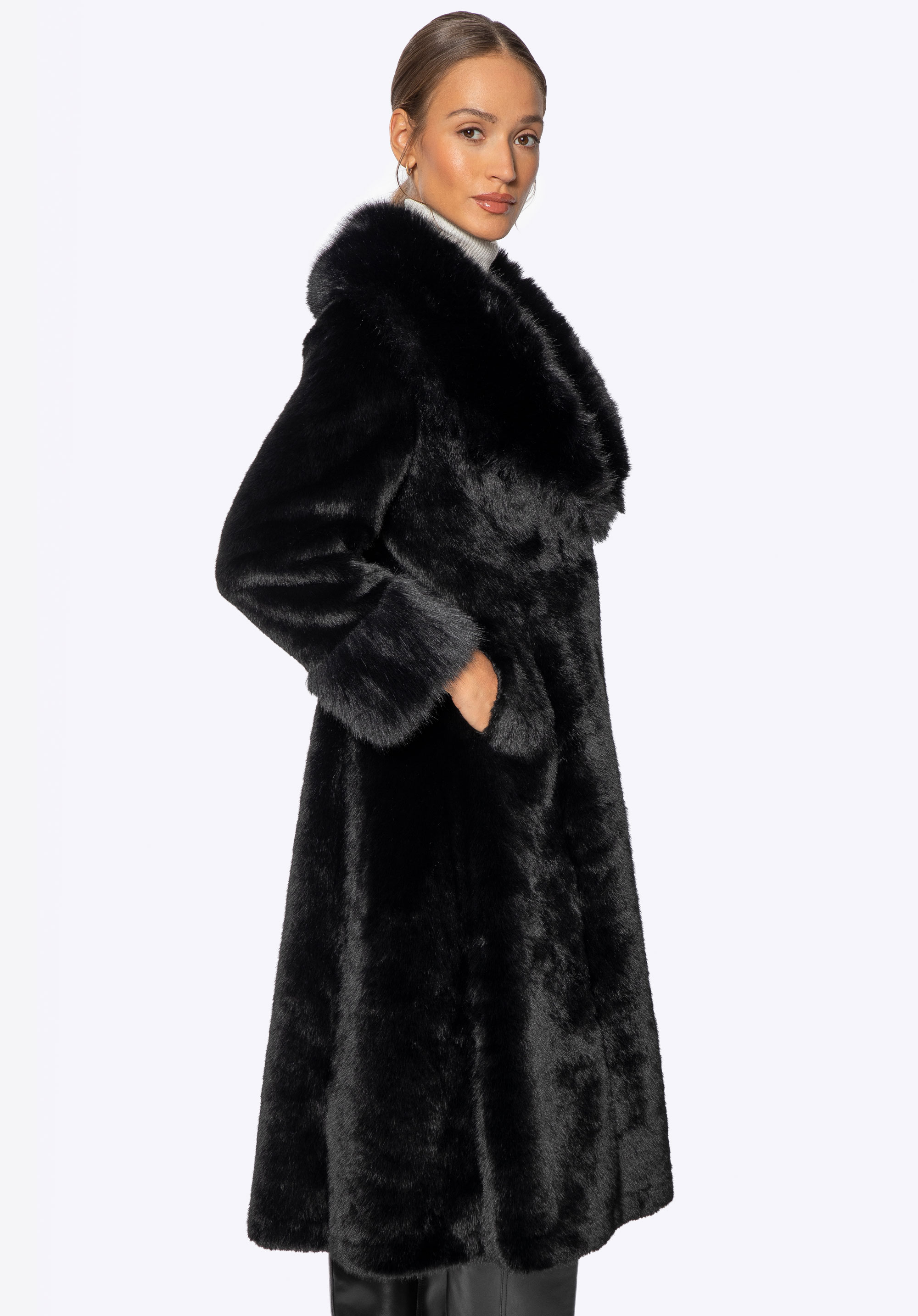 Це довге пальто поєднує в собі класичний стиль з комфортом і практичністю для холодних днів. Виготовлене повністю з м''якого штучного хутра, воно ніжно облягає силует, забезпечуючи комфорт і легкість у носінні. Комір зі штучного хутра додає характеру та елегантності, красиво обрамляючи обличчя та надаючи виробу розкішного вигляду. Дві бічні кишені забезпечують місце, щоб зігріти руки або носити дрібні предмети першої необхідності, не порушуючи чітких ліній дизайну.