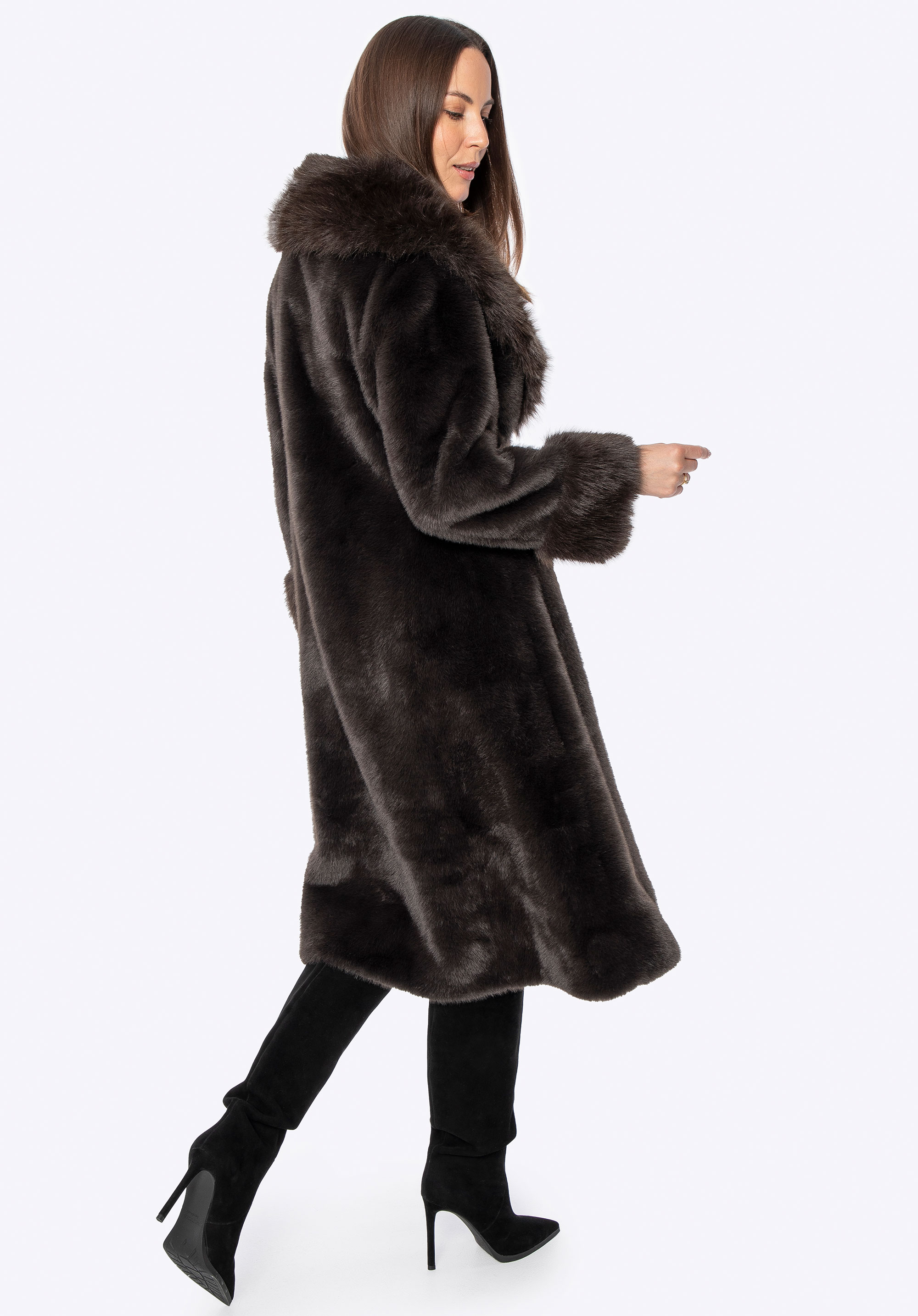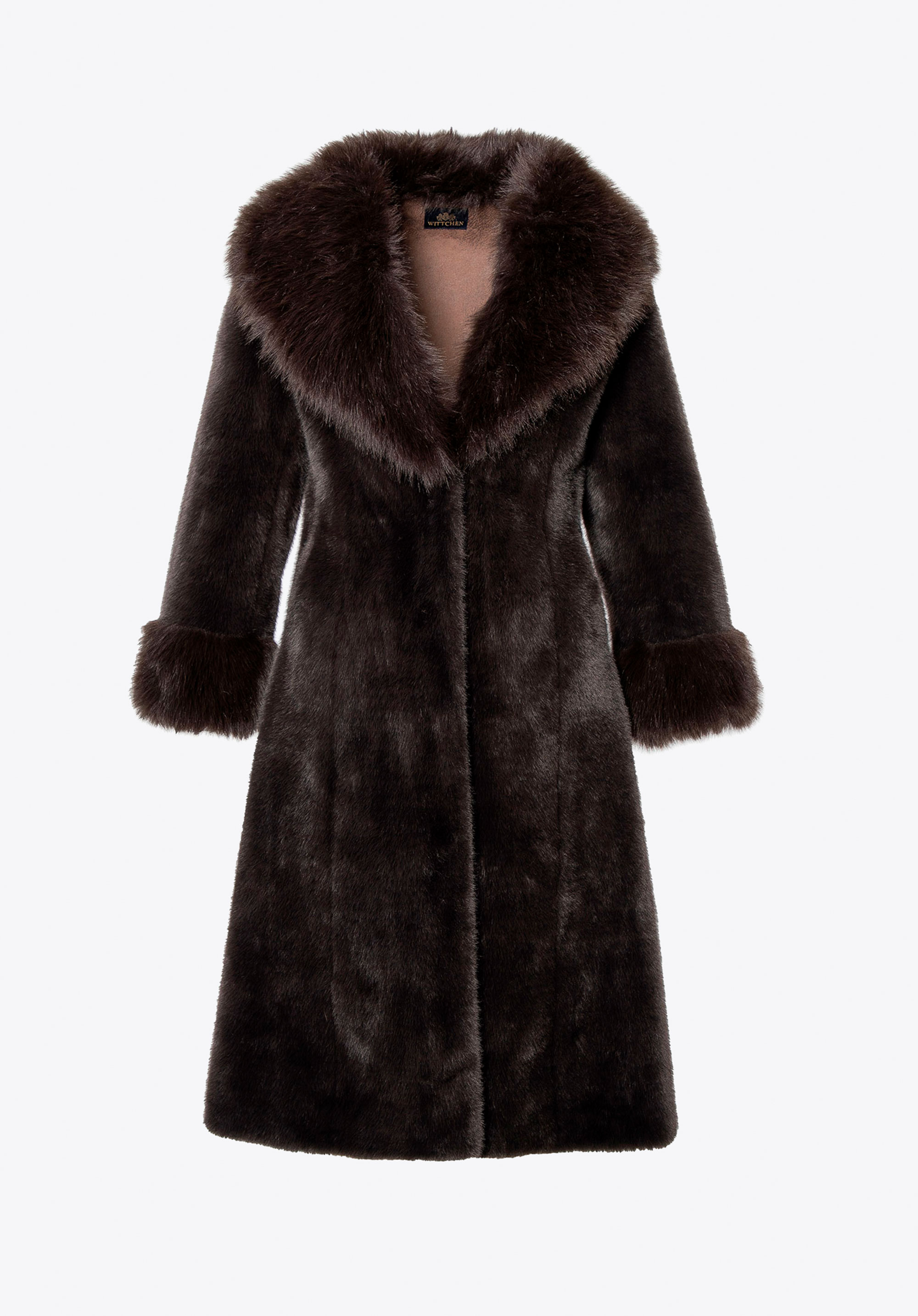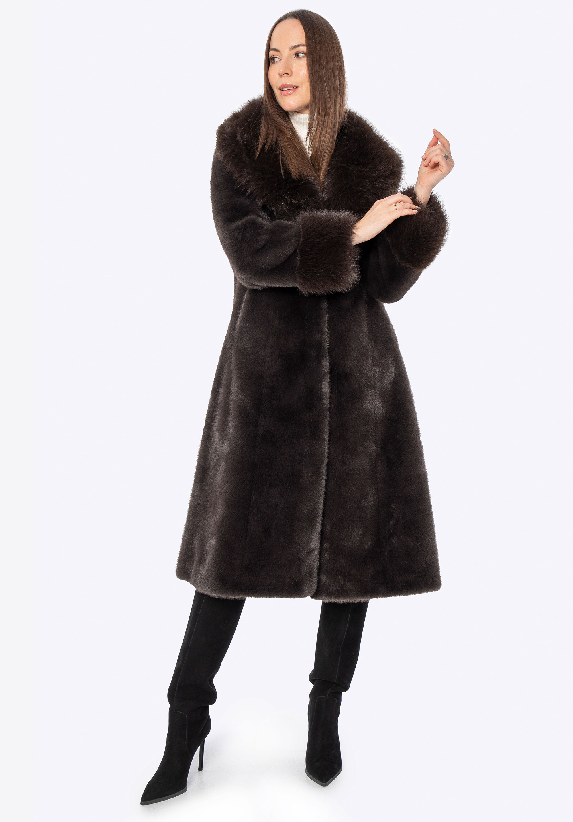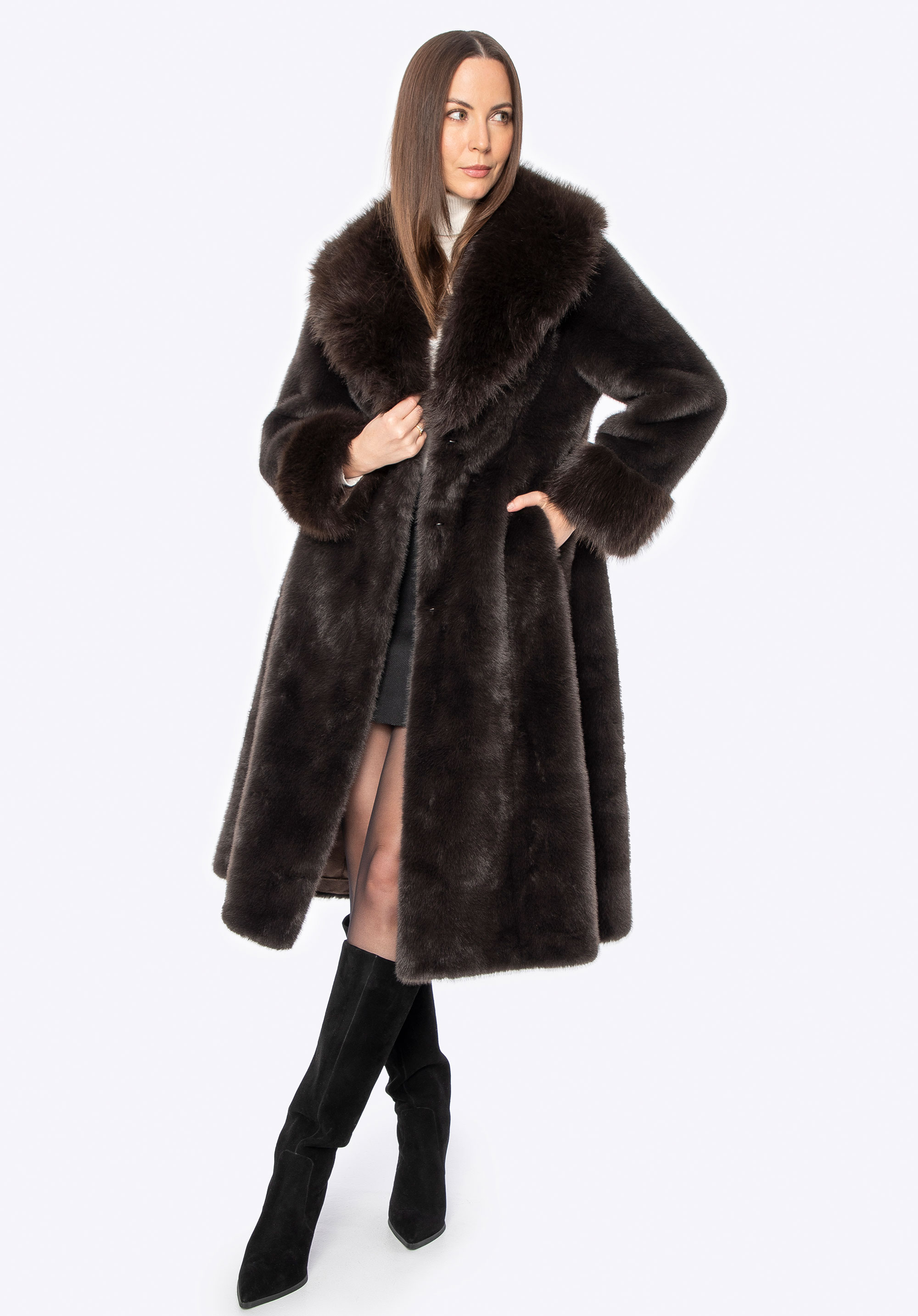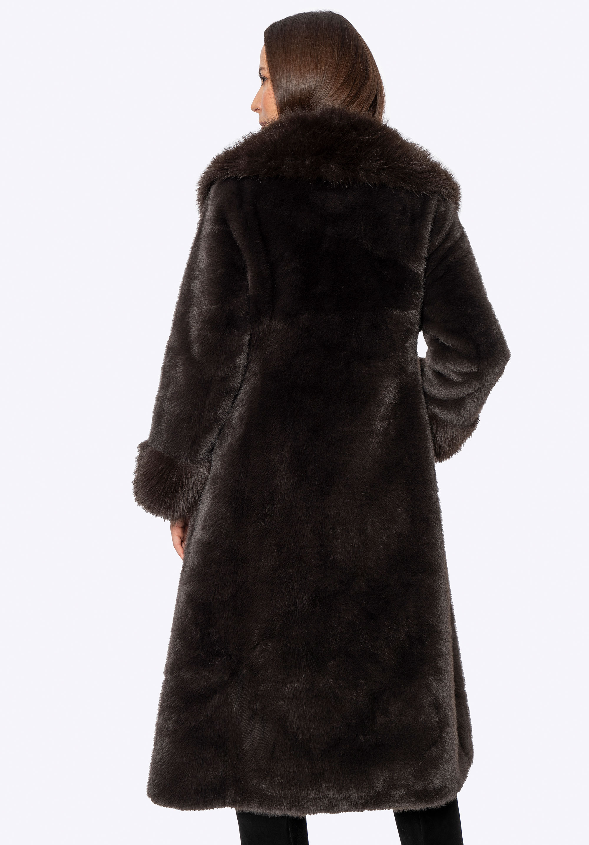 Це довге пальто поєднує в собі класичний стиль з комфортом і практичністю для холодних днів. Виготовлене повністю з м''якого штучного хутра, воно ніжно облягає силует, забезпечуючи комфорт і легкість у носінні. Комір зі штучного хутра додає характеру та елегантності, красиво обрамляючи обличчя та надаючи виробу розкішного вигляду. Дві бічні кишені забезпечують місце, щоб зігріти руки або носити дрібні предмети першої необхідності, не порушуючи чітких ліній дизайну.