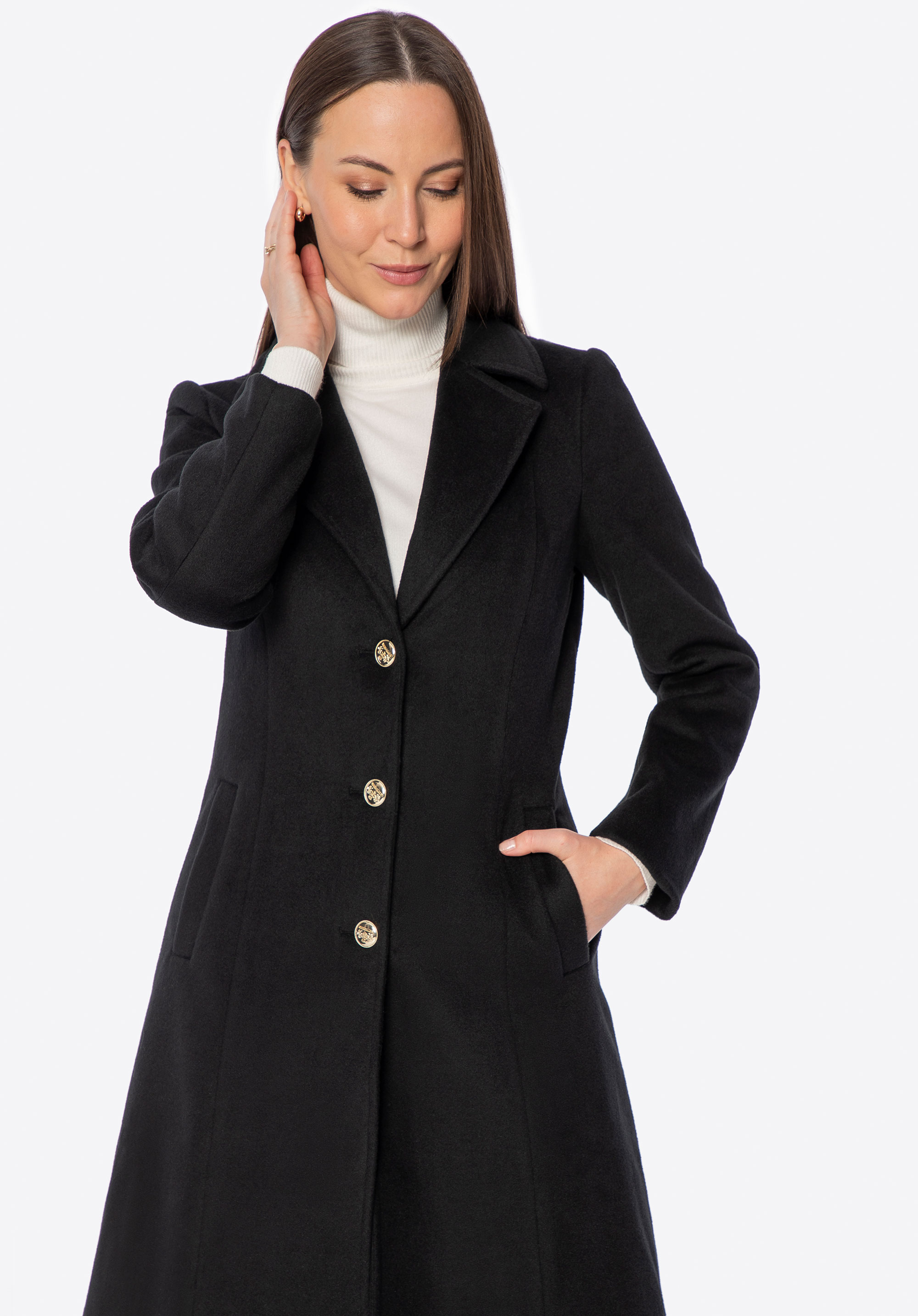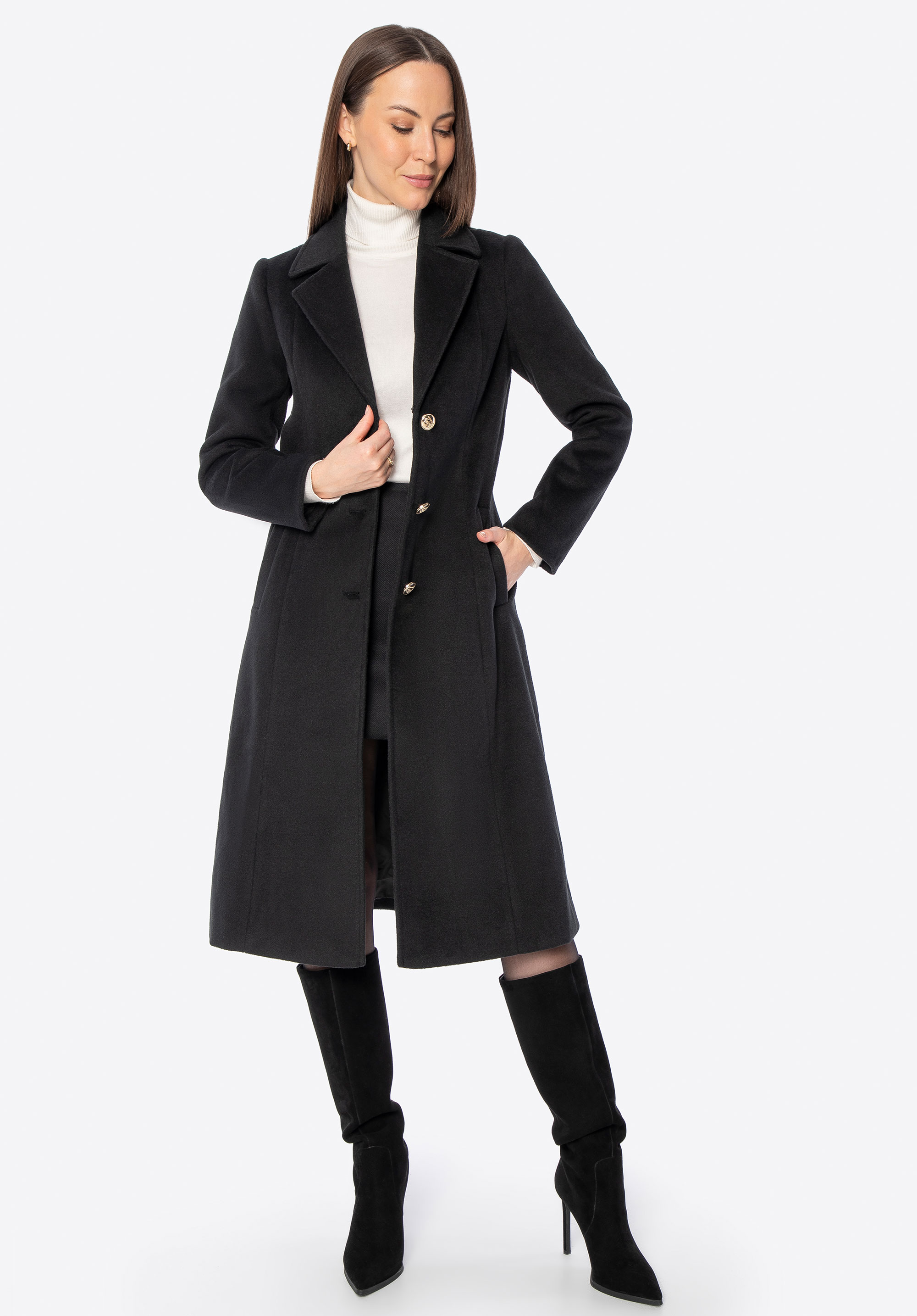 - Приталений крій: Підкреслює переваги фігури й надає пальту жіночного, елегантного вигляду.