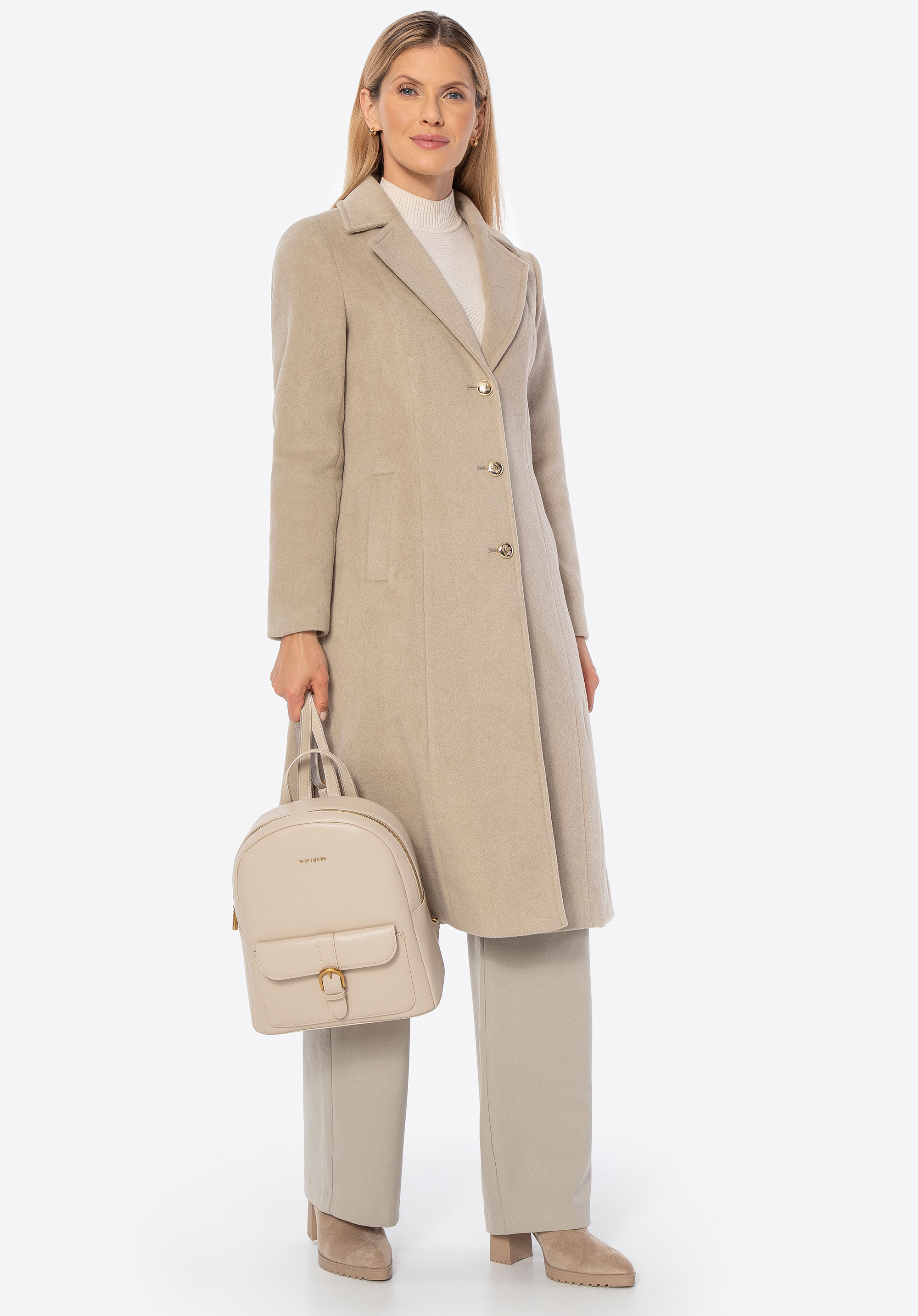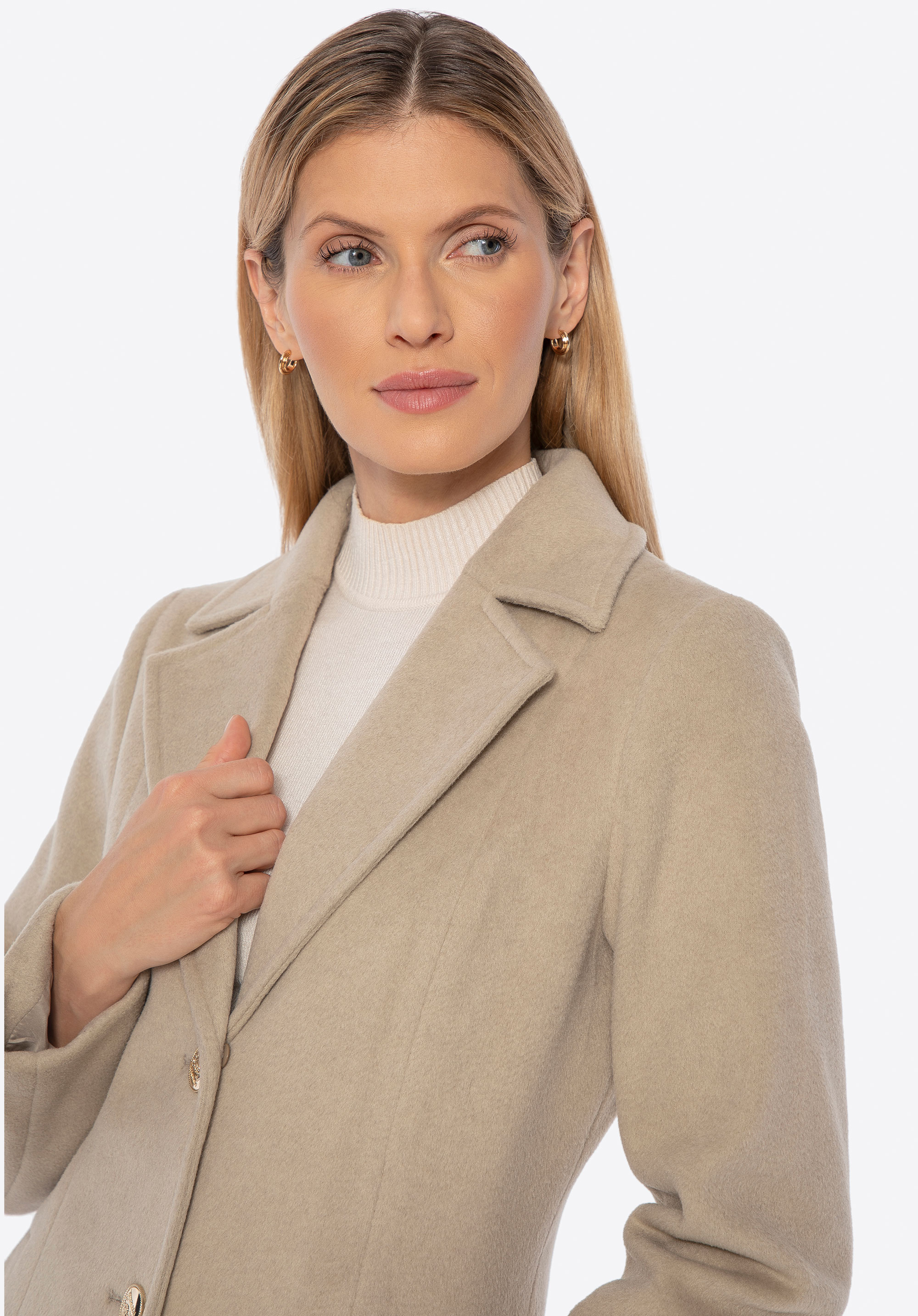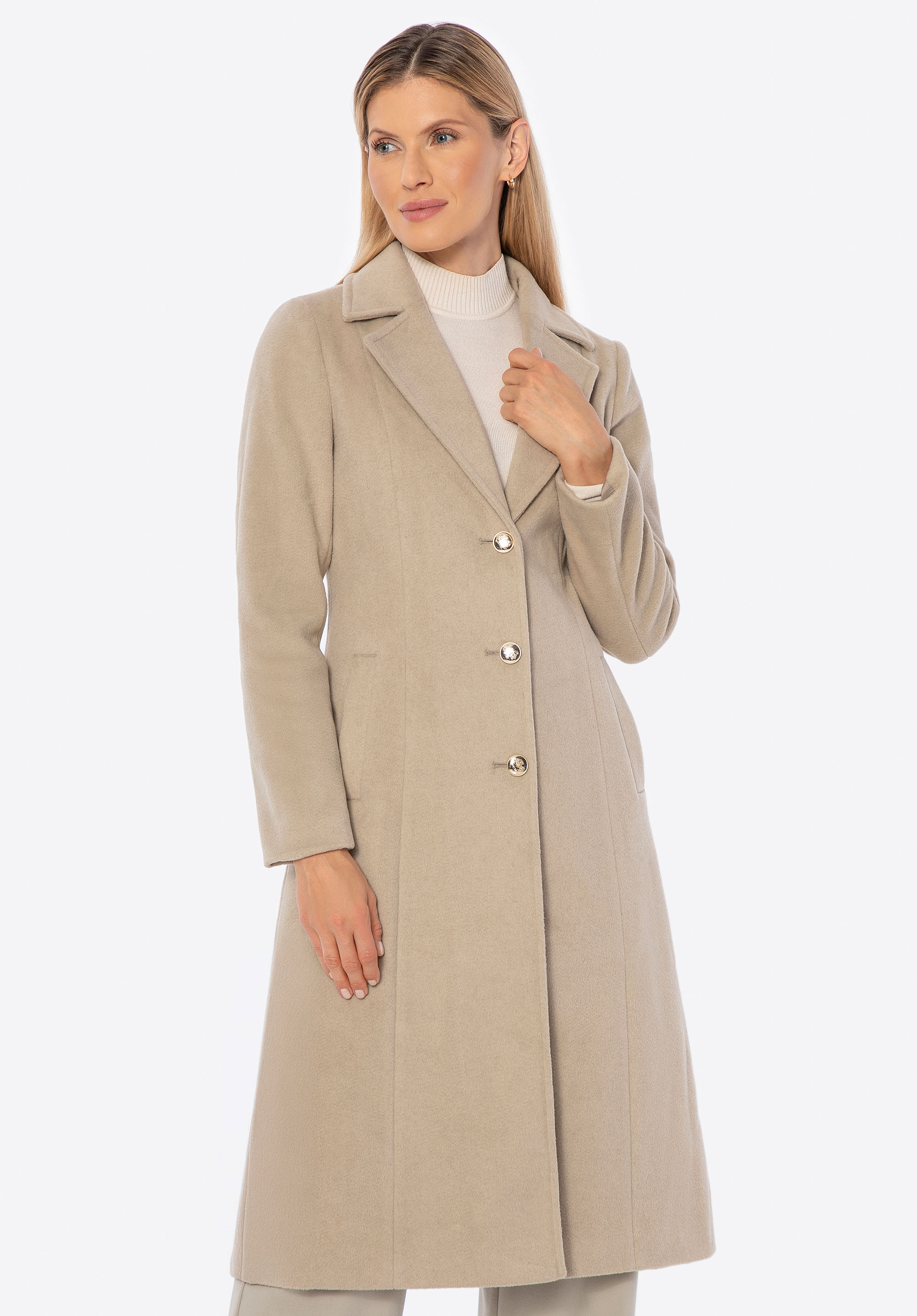 - Приталений крій: Підкреслює переваги фігури й надає пальту жіночного, елегантного вигляду.