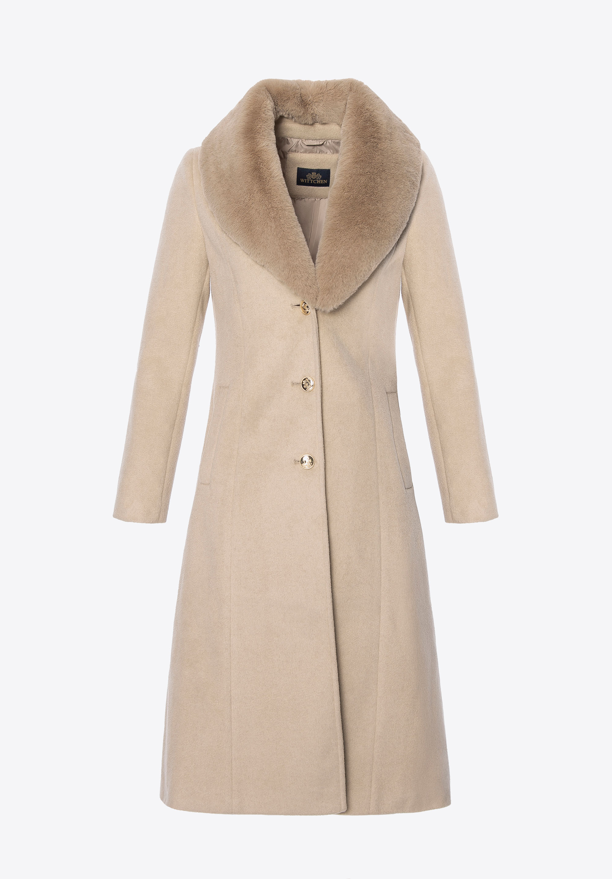 Це жіноче пальто — уособлення стилю та жіночої елегантності. Приталений крій підкреслює силует, а класичні гудзики з логотипом додають вишуканості та витонченого характеру. Знімний комір із м’якого хутра дозволяє змінювати стиль — від затишного й елегантного до легкого та сучасного. Дві практичні кишені з боків забезпечують функціональність і зручне місце для дрібниць або щоб зігріти руки. Це універсальне пальто поєднує комфорт, стиль і практичність, і чудово підходить як для повсякденного носіння, так і для більш формальних нагод.