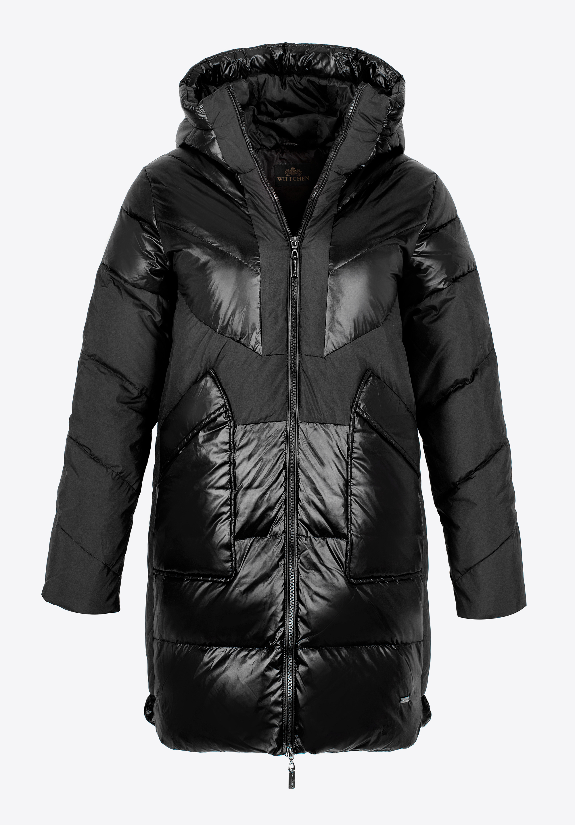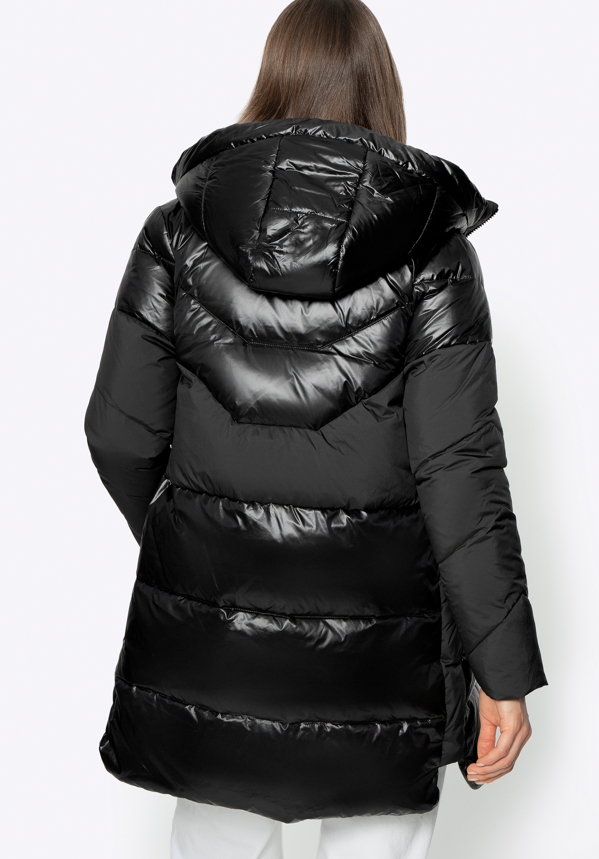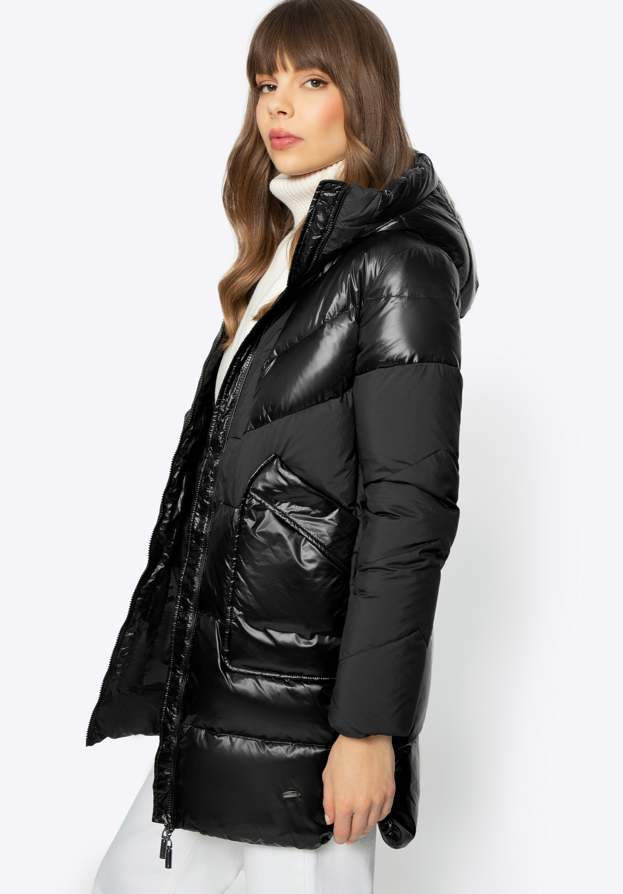 Це стильне пальто додасть шику вашим зимовим образам. Поєднання блискучого нейлону та матового поліестеру створює унікальний ефект, який доповнюється геометричним стьобанням. У відкритих передніх кишенях можна зручно сховати руки або дрібні предмети. Капюшон невеликий, але комфортно захистить голову від холоду. Носити цю модель можна як на роботу, так і після неї - вона чудово виглядатиме з елегантними чобітьми та улюбленими чобітьми на платформі. Жіноче пухове пальто з комбінованих матеріалів з капюшоном приверне багато уваги і змусить вас сяяти кожен день.