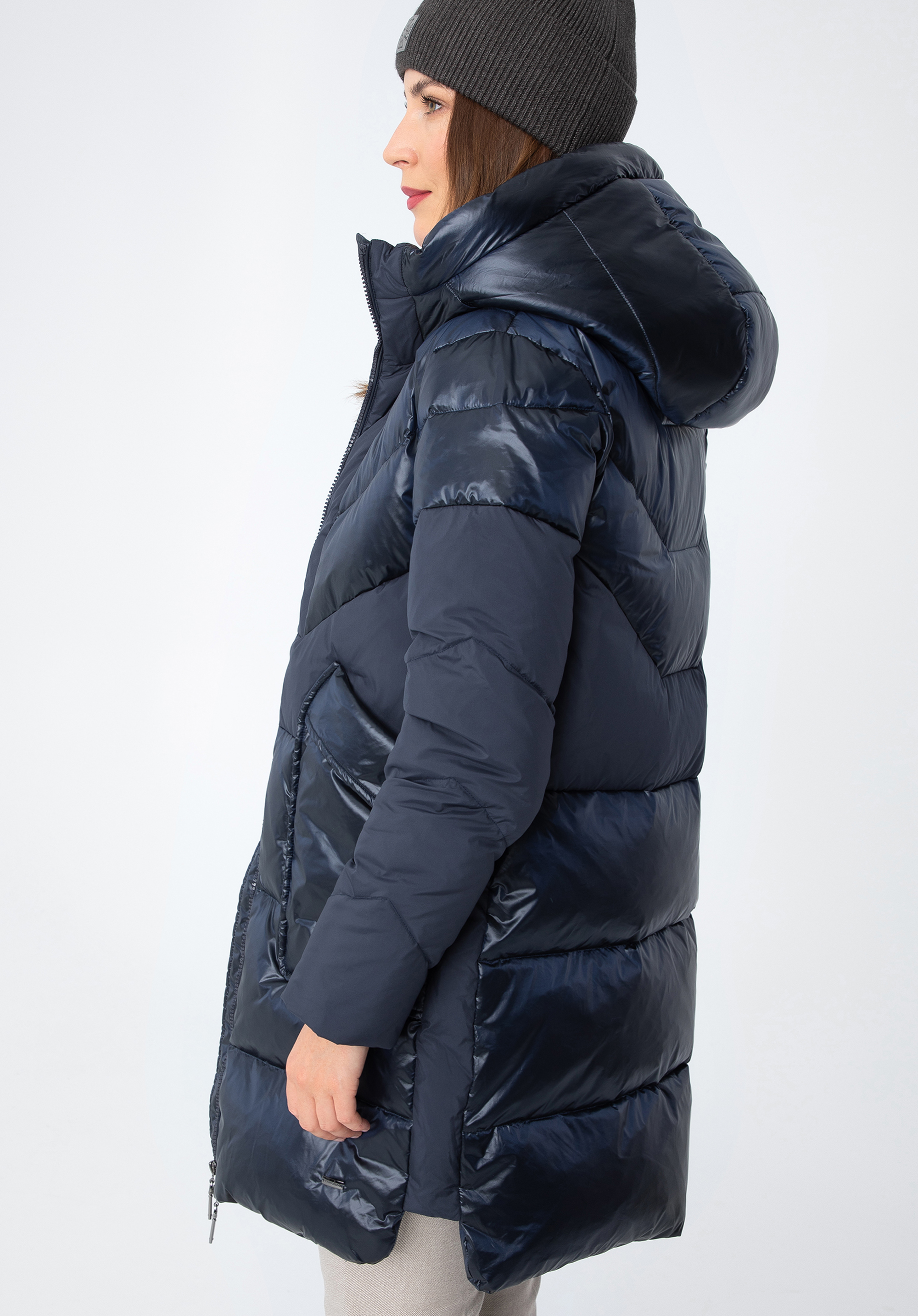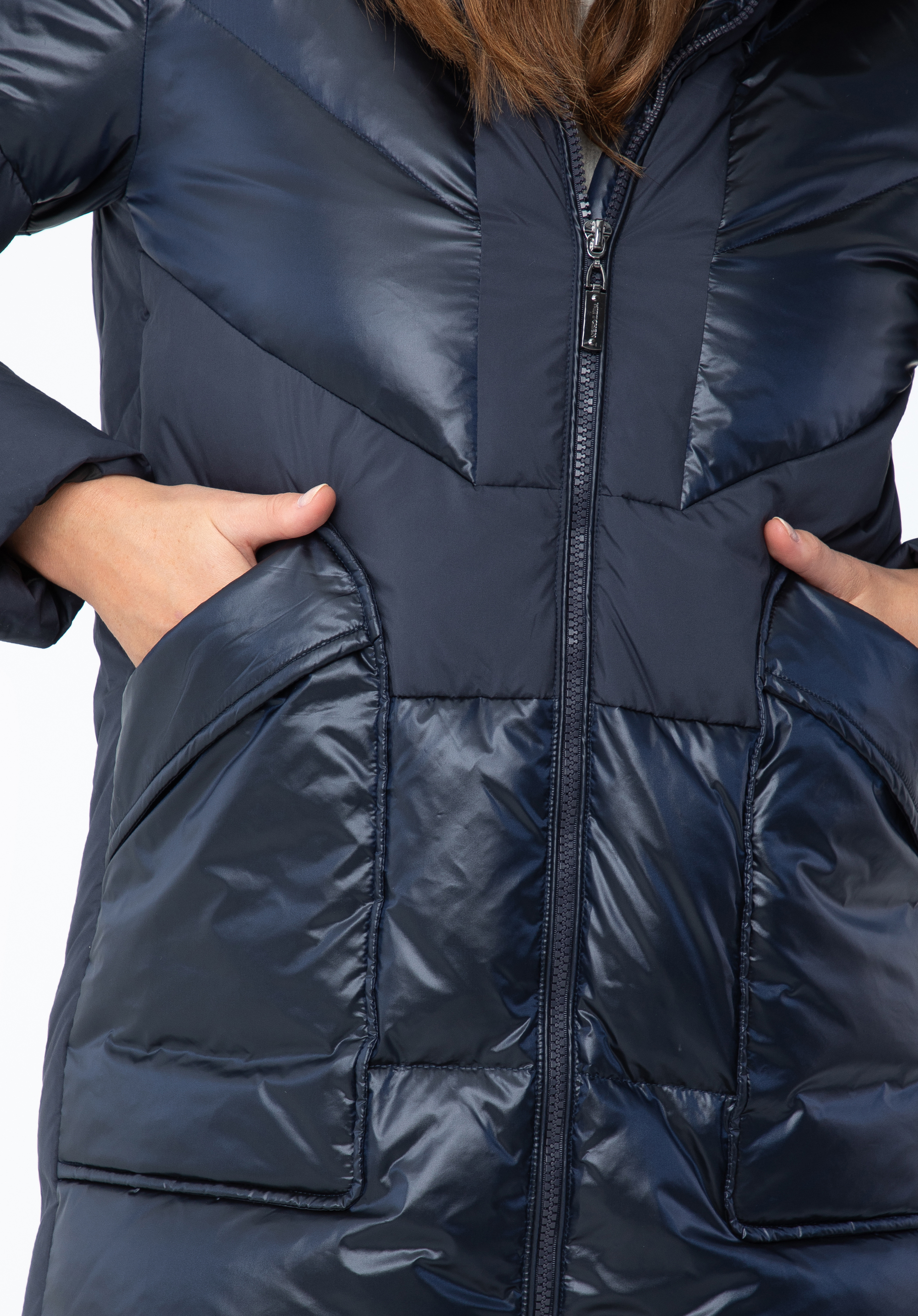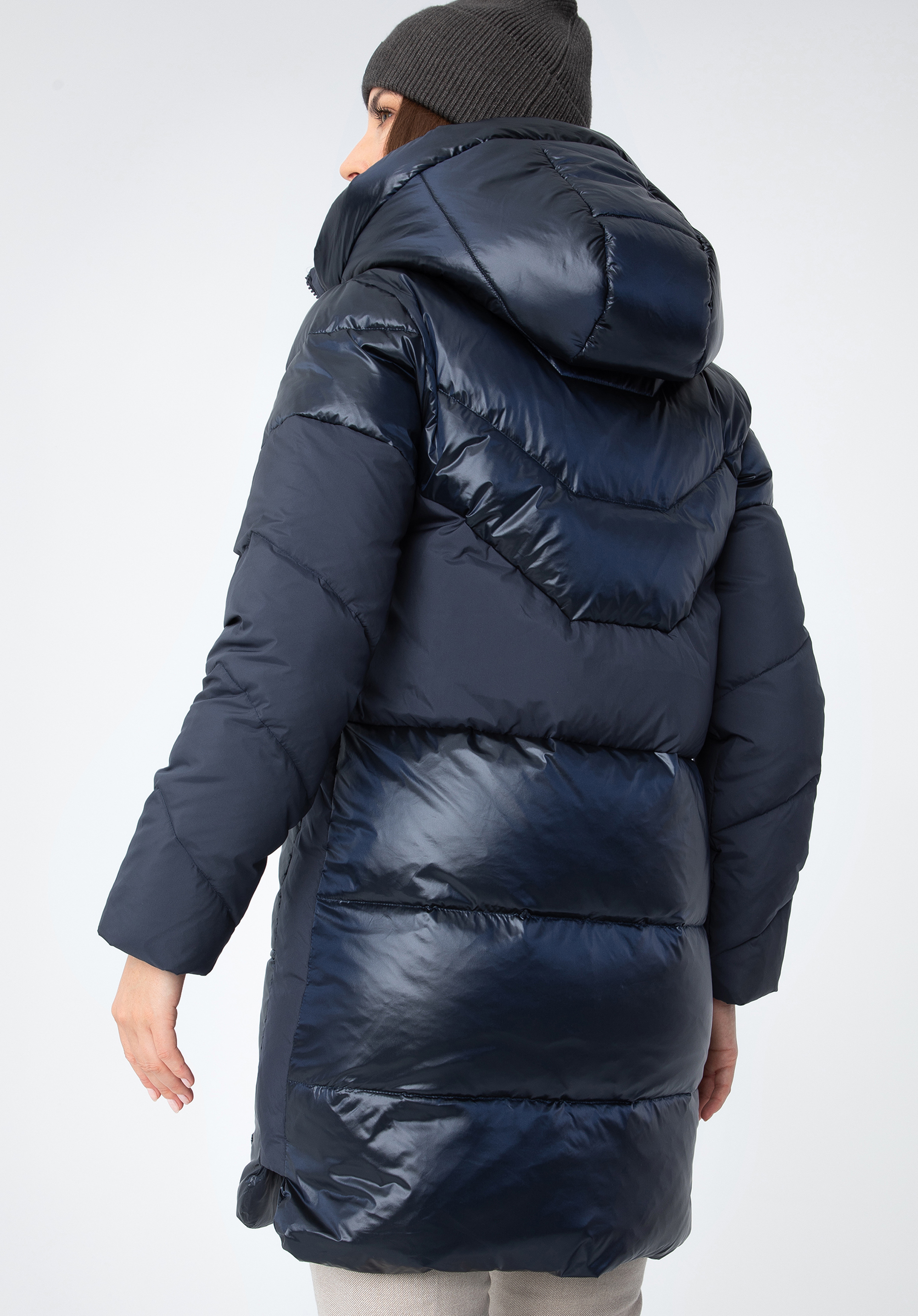 Це стильне пальто додасть шику вашим зимовим образам. Поєднання блискучого нейлону та матового поліестеру створює унікальний ефект, який доповнюється геометричним стьобанням. У відкритих передніх кишенях можна зручно сховати руки або дрібні предмети. Капюшон невеликий, але комфортно захистить голову від холоду. Носити цю модель можна як на роботу, так і після неї - вона чудово виглядатиме з елегантними чобітьми та улюбленими чобітьми на платформі. Жіноче пухове пальто з комбінованих матеріалів з капюшоном приверне багато уваги і змусить вас сяяти кожен день.