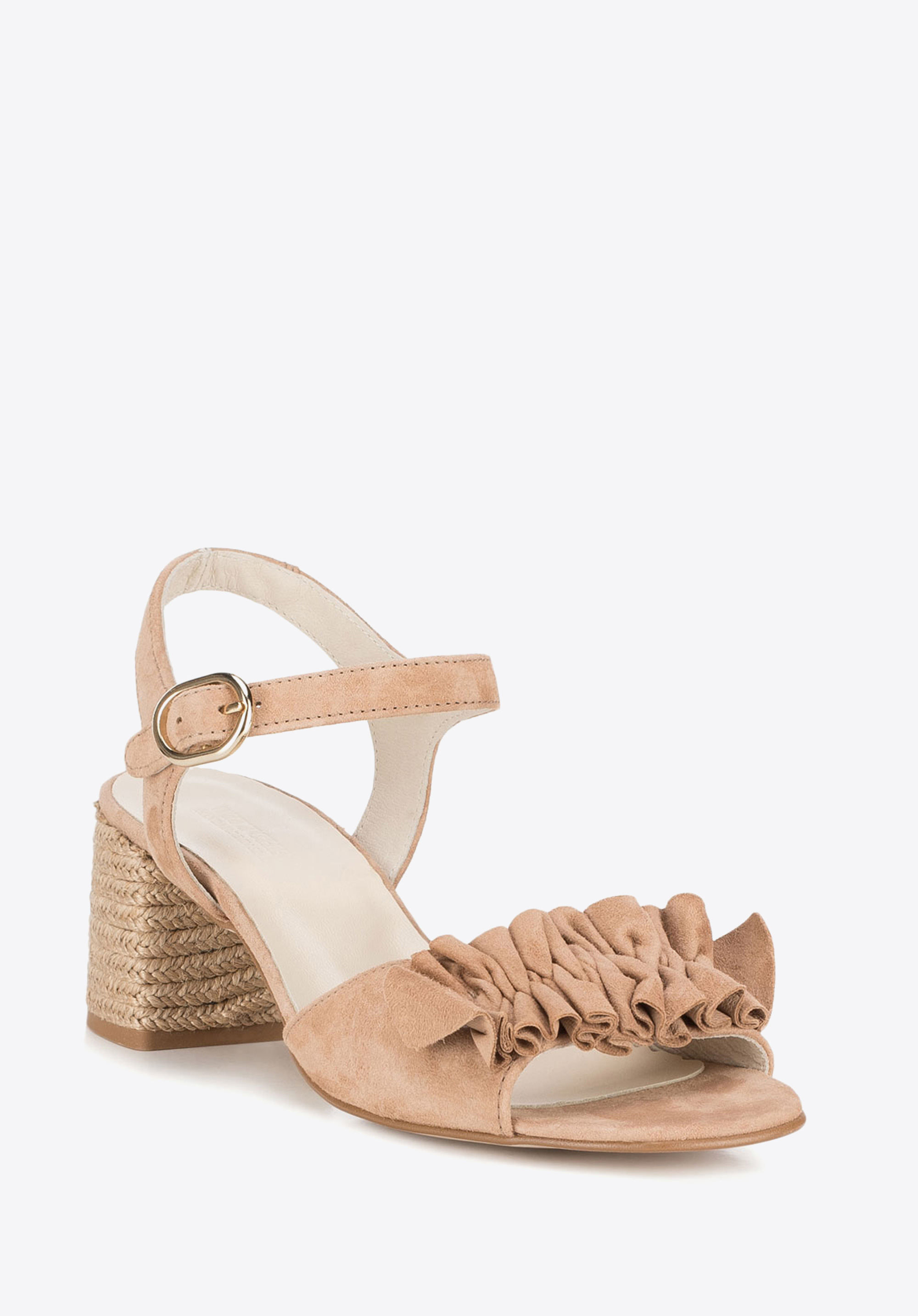 Цікаві в обробці жіночі босоніжки доступних відтінків: бежевого, червоного і чорного. Ремінь в частині пальців з прикрасою у вигляді декоративно гофрованої оборки із замші. Модель відмінно підійде як до легких літніх суконь, так і до шортів. Наша порада: обгорнутий шнурком каблук підкреслить оригінальний зовнішній вигляд творіння.