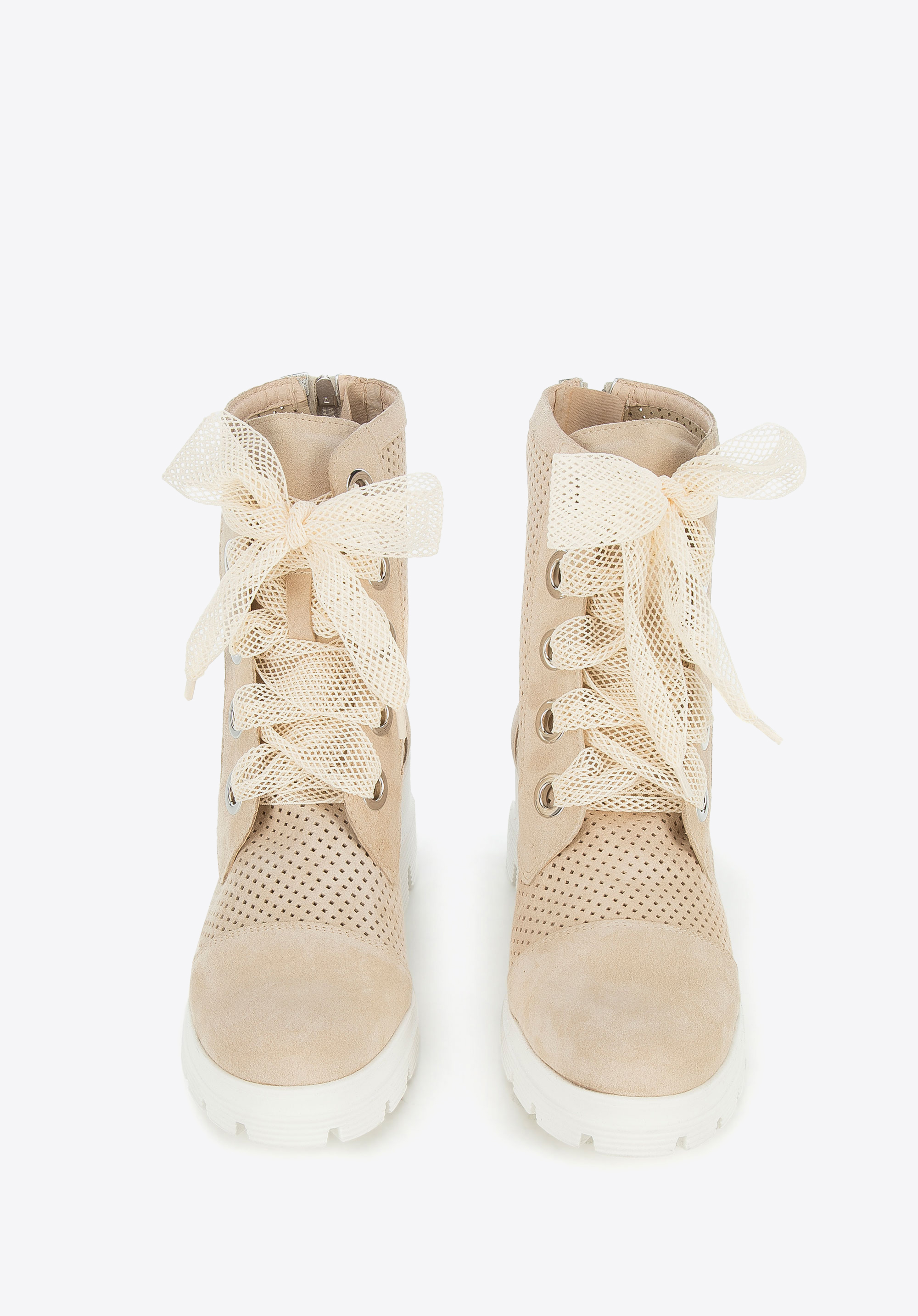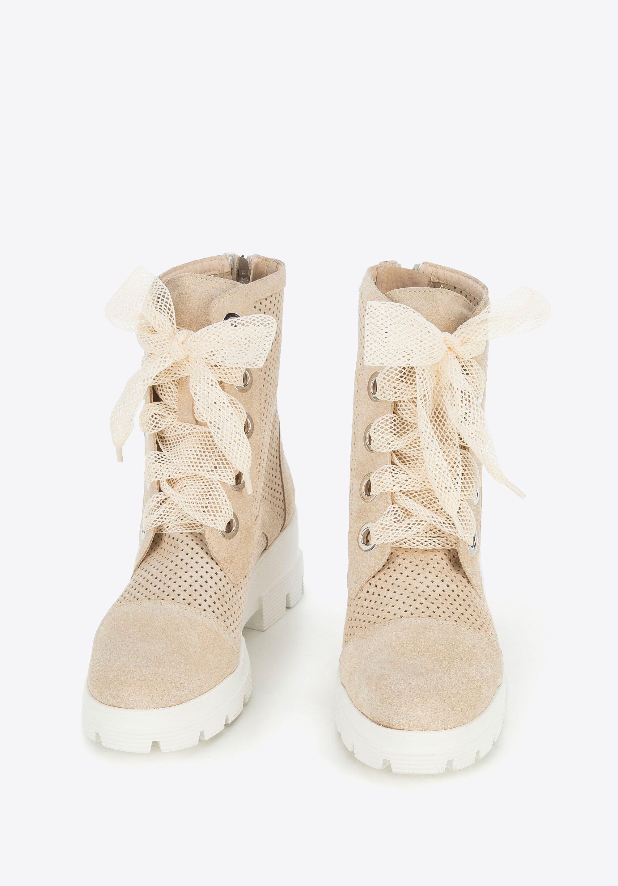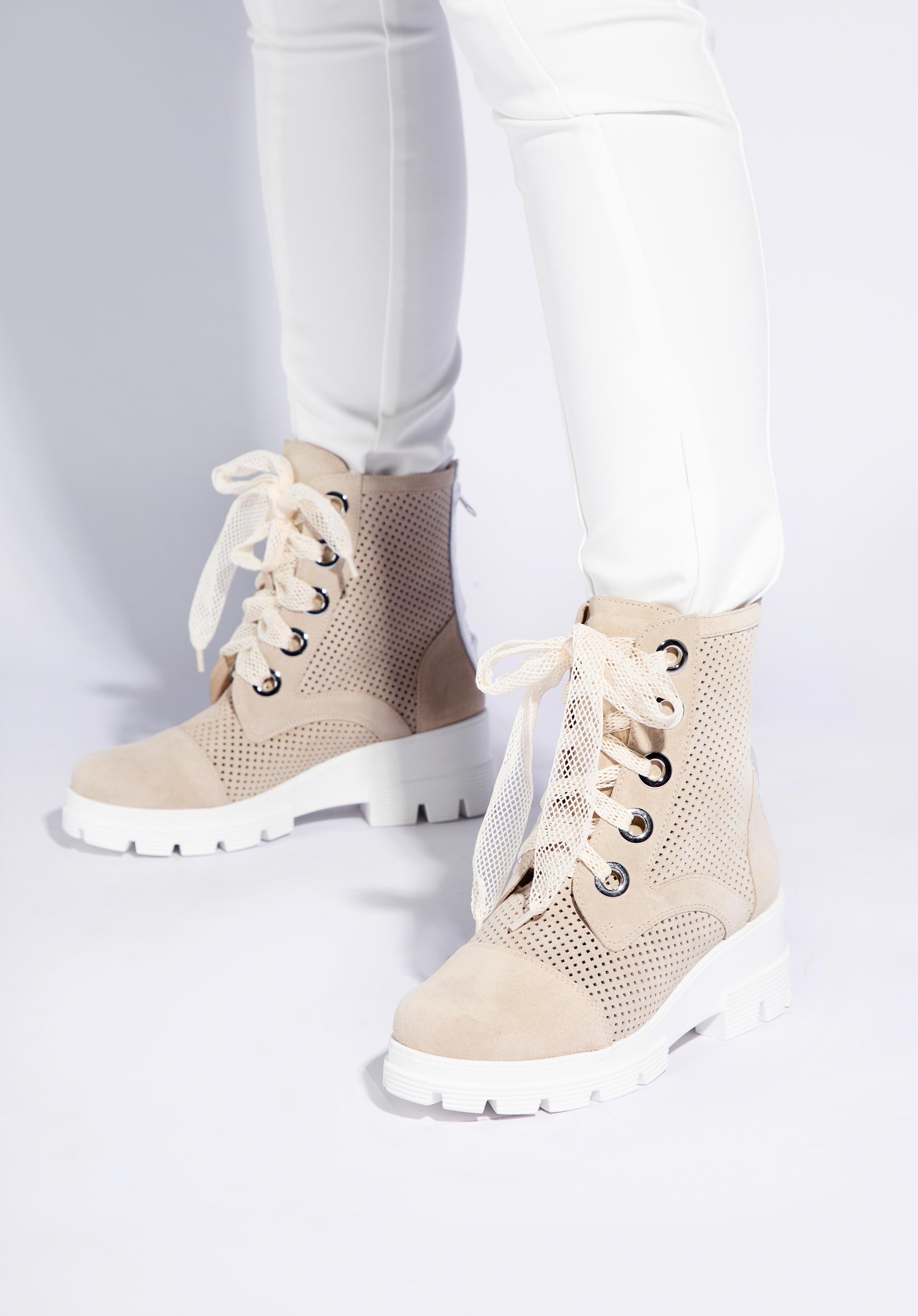 Ці унікальні жіночі черевики-трапер стануть оригінальним доповненням до вашого повсякденного вбрання. Вони виготовлені з якісної замші з м’якою шкіряною вставкою, завдяки якій в них можна комфортно ходити багато годин. Платформа з товстим протектором надає їм характеру. Ажурну обробку ви знайдете не тільки на верху, але і на шнурках – це дуже оригінальні, модні черевики. Вони будуть чудово виглядати з повсякденними джинсами і світшотами, також їх можна носити з короткою спідницею і байкерською курткою. Жіночі ажурні замшеві черевики – унікальний аксесуар, з яким ви будете виглядати стильно кожен день.