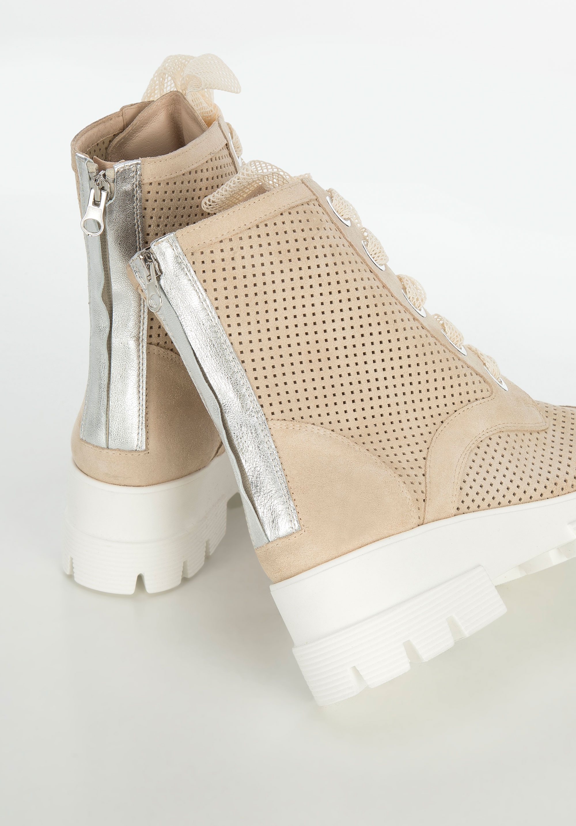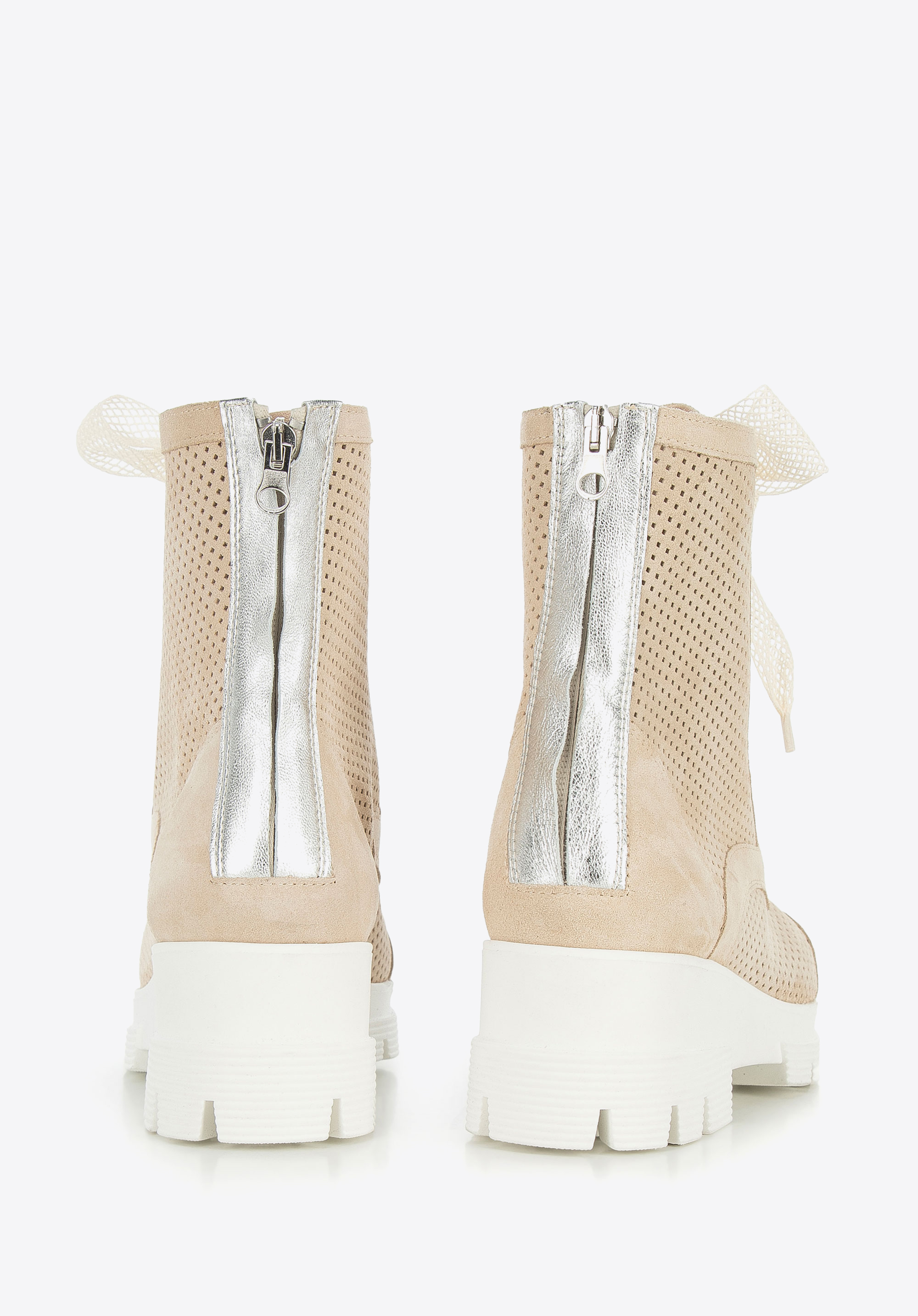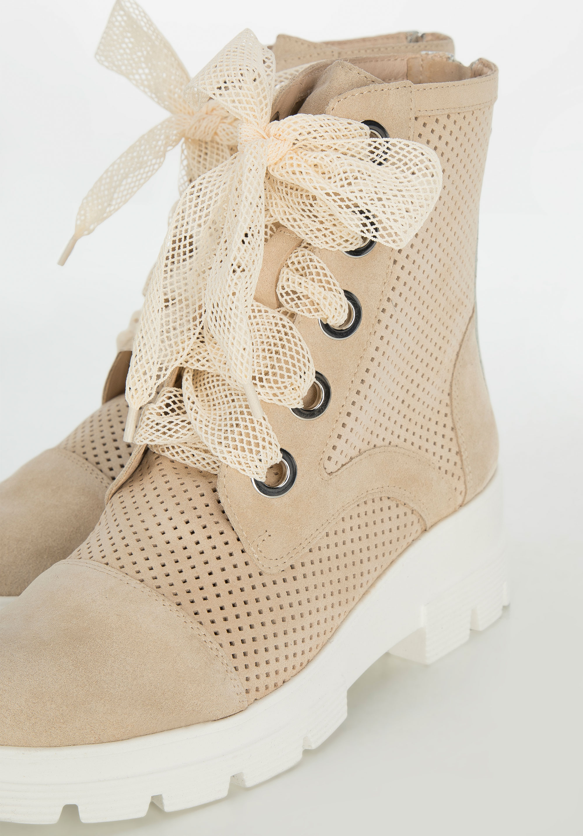 Ці унікальні жіночі черевики-трапер стануть оригінальним доповненням до вашого повсякденного вбрання. Вони виготовлені з якісної замші з м’якою шкіряною вставкою, завдяки якій в них можна комфортно ходити багато годин. Платформа з товстим протектором надає їм характеру. Ажурну обробку ви знайдете не тільки на верху, але і на шнурках – це дуже оригінальні, модні черевики. Вони будуть чудово виглядати з повсякденними джинсами і світшотами, також їх можна носити з короткою спідницею і байкерською курткою. Жіночі ажурні замшеві черевики – унікальний аксесуар, з яким ви будете виглядати стильно кожен день.