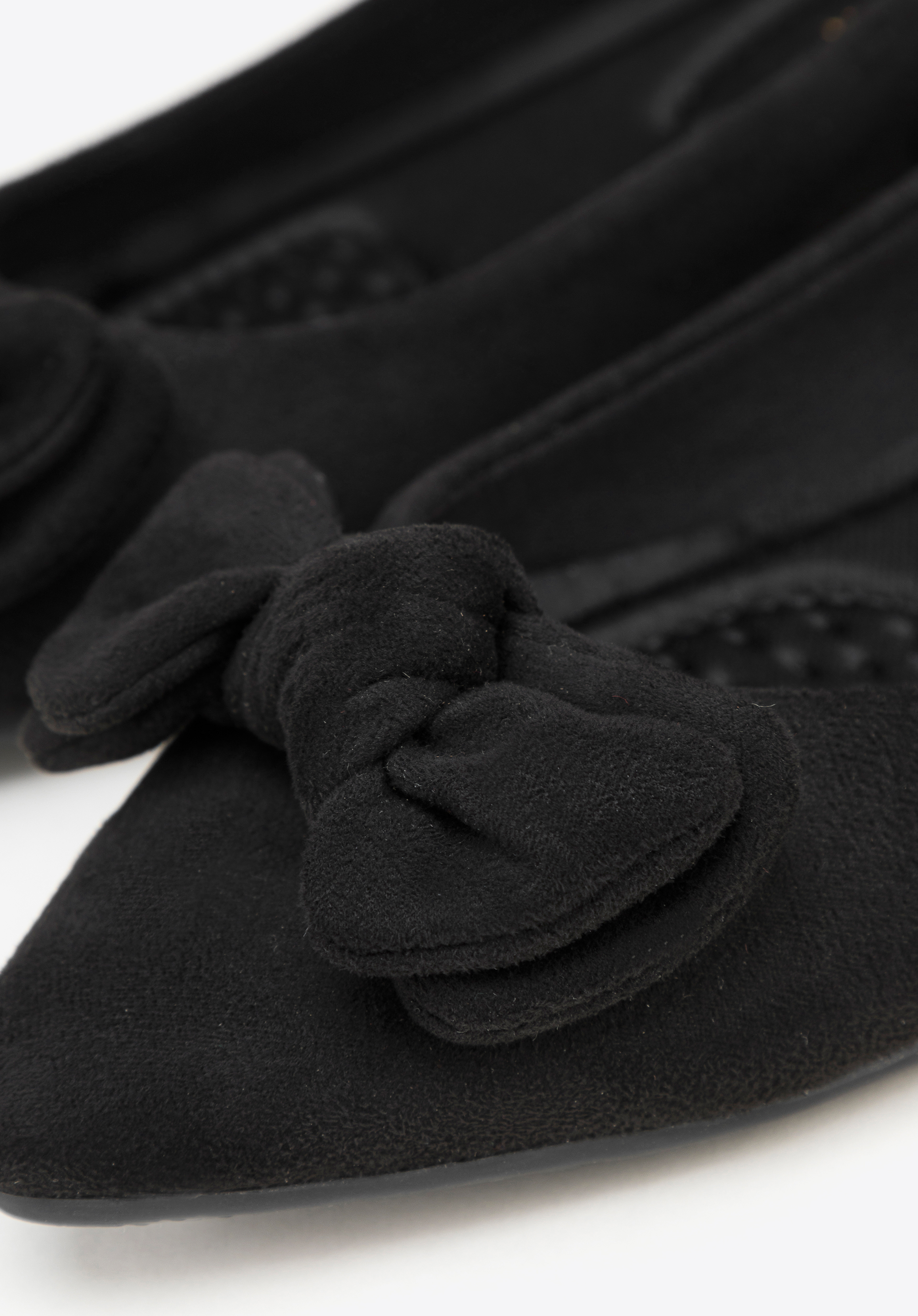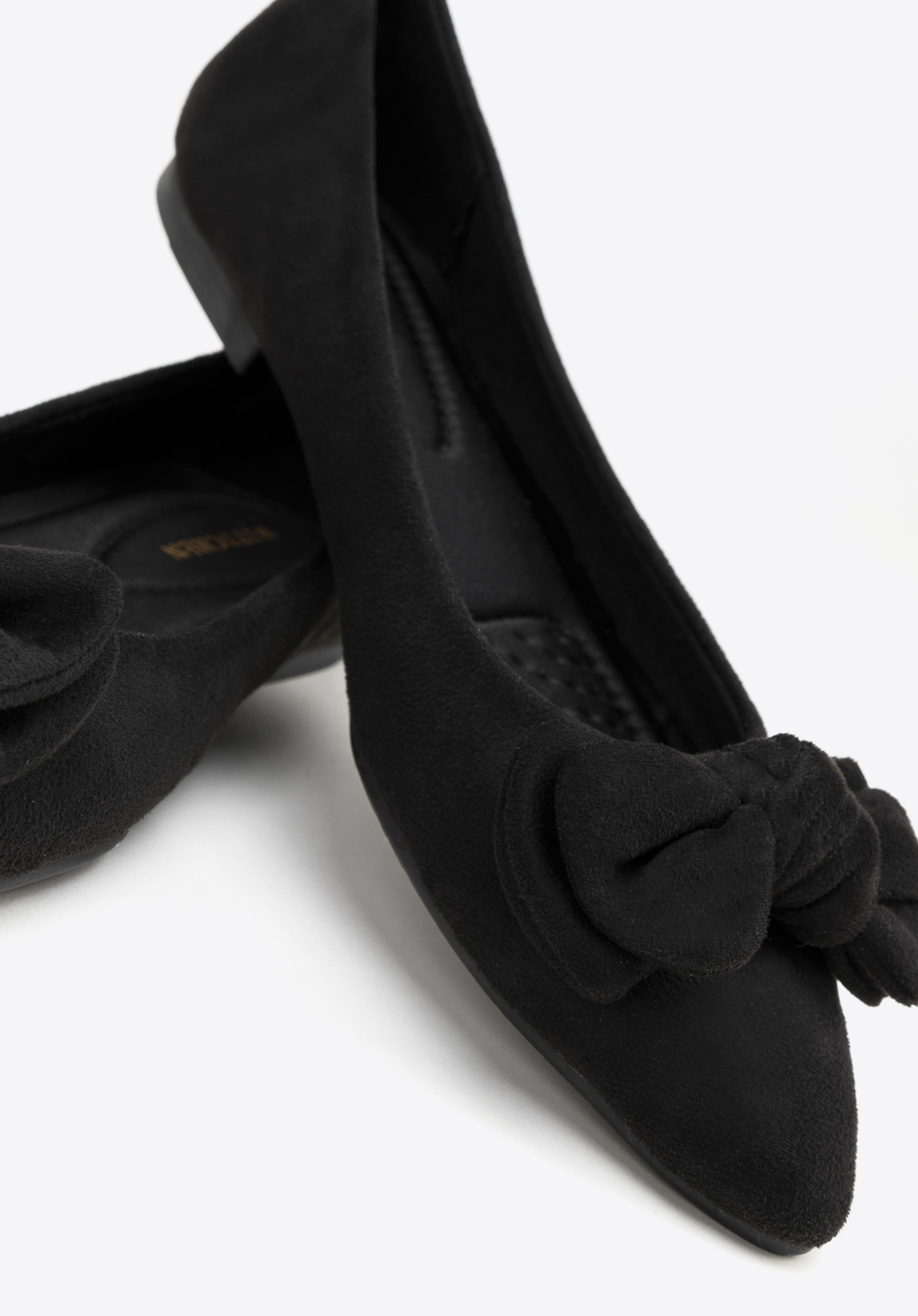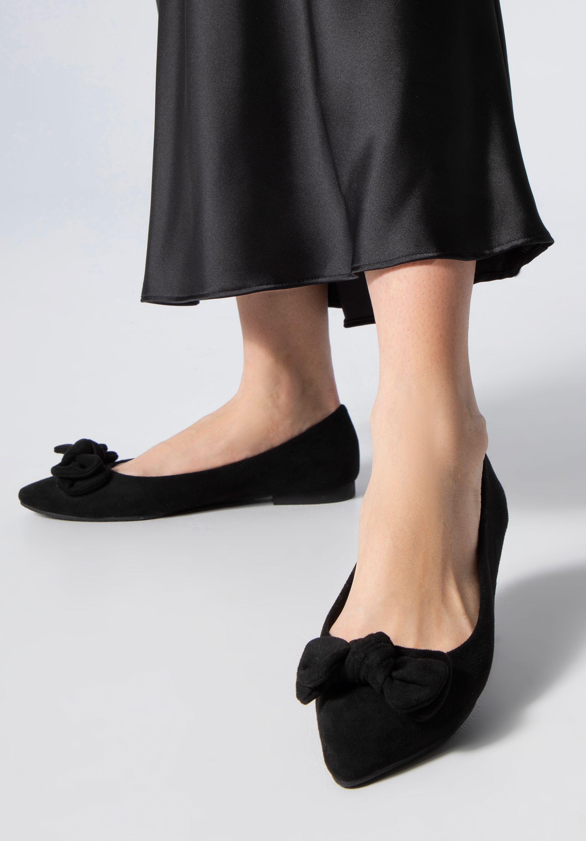 Стильні жіночі балетки - обов''язковий аксесуар кожної жінки, яка любить шик і комфорт. Дана модель виготовлена з приємної на дотик екозамші. Гострий носок прикрашений великим чарівним бантом. Завдяки зручній, м''якій устілці ви можете комфортно носити їх багато годин. Це взуття ідеально підійде для роботи, походу в кінотеатр або прогулянки з друзями. Носити їх можна, наприклад, з елегантною сукнею міді або джинсами і сорочкою для повсякденного носіння. Жіночі балетки на низькому каблуці – чарівна повсякденне взуття.