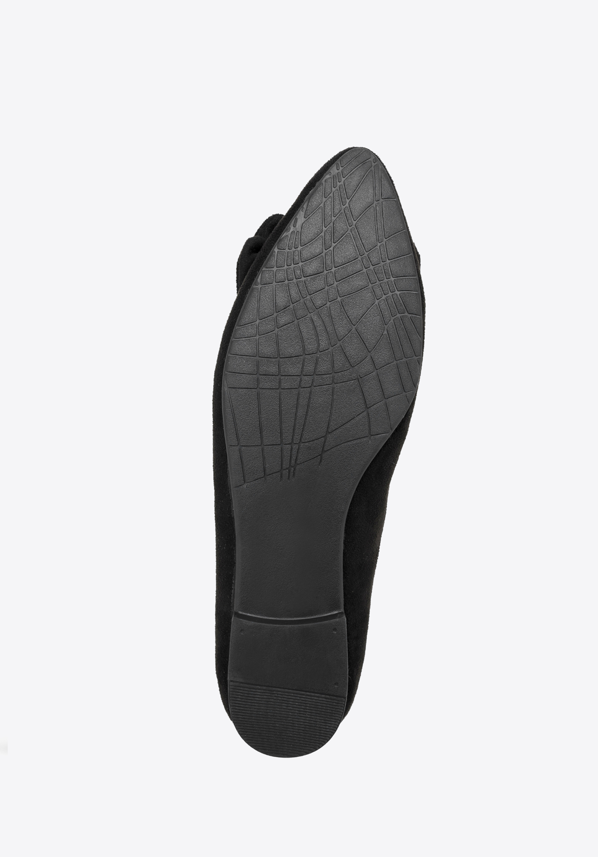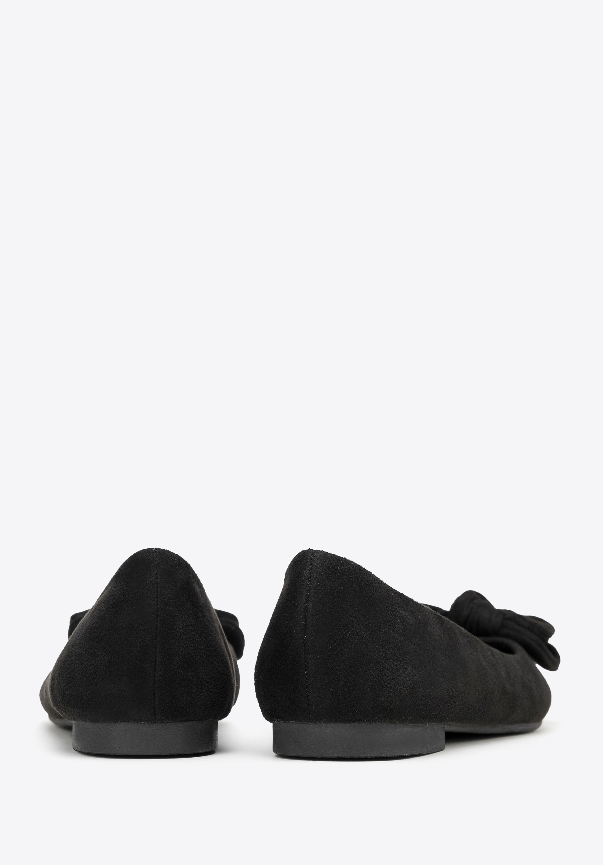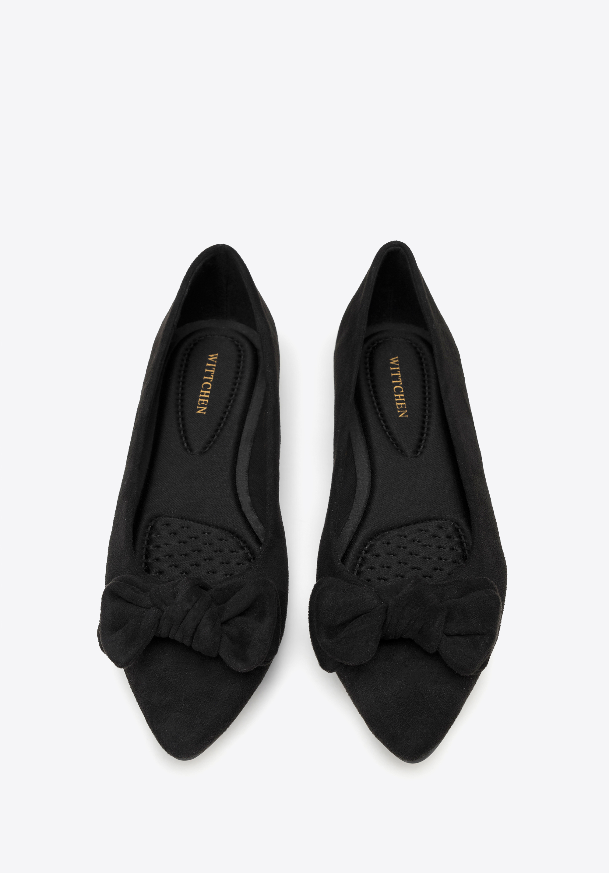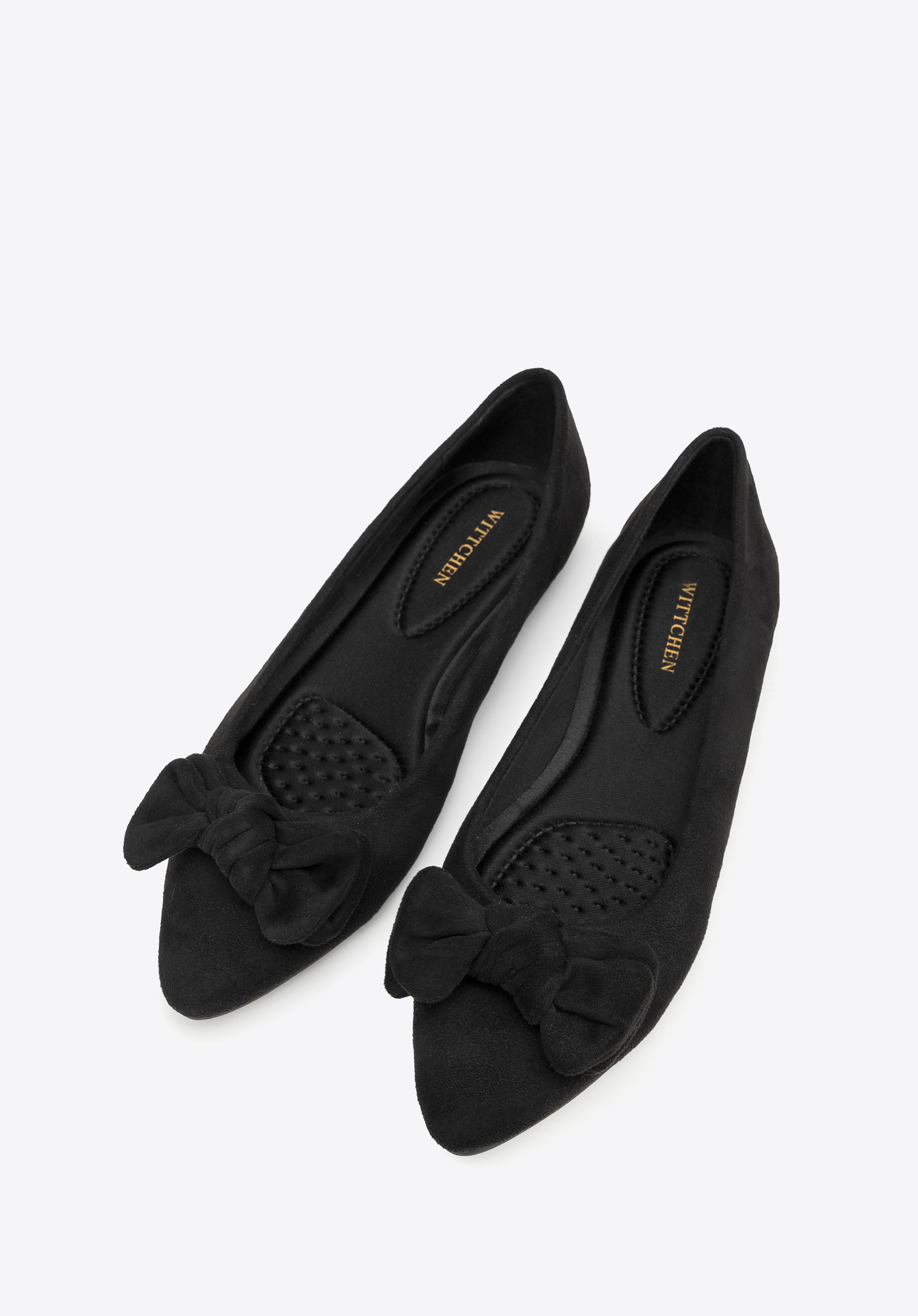 Стильні жіночі балетки - обов''язковий аксесуар кожної жінки, яка любить шик і комфорт. Дана модель виготовлена з приємної на дотик екозамші. Гострий носок прикрашений великим чарівним бантом. Завдяки зручній, м''якій устілці ви можете комфортно носити їх багато годин. Це взуття ідеально підійде для роботи, походу в кінотеатр або прогулянки з друзями. Носити їх можна, наприклад, з елегантною сукнею міді або джинсами і сорочкою для повсякденного носіння. Жіночі балетки на низькому каблуці – чарівна повсякденне взуття.