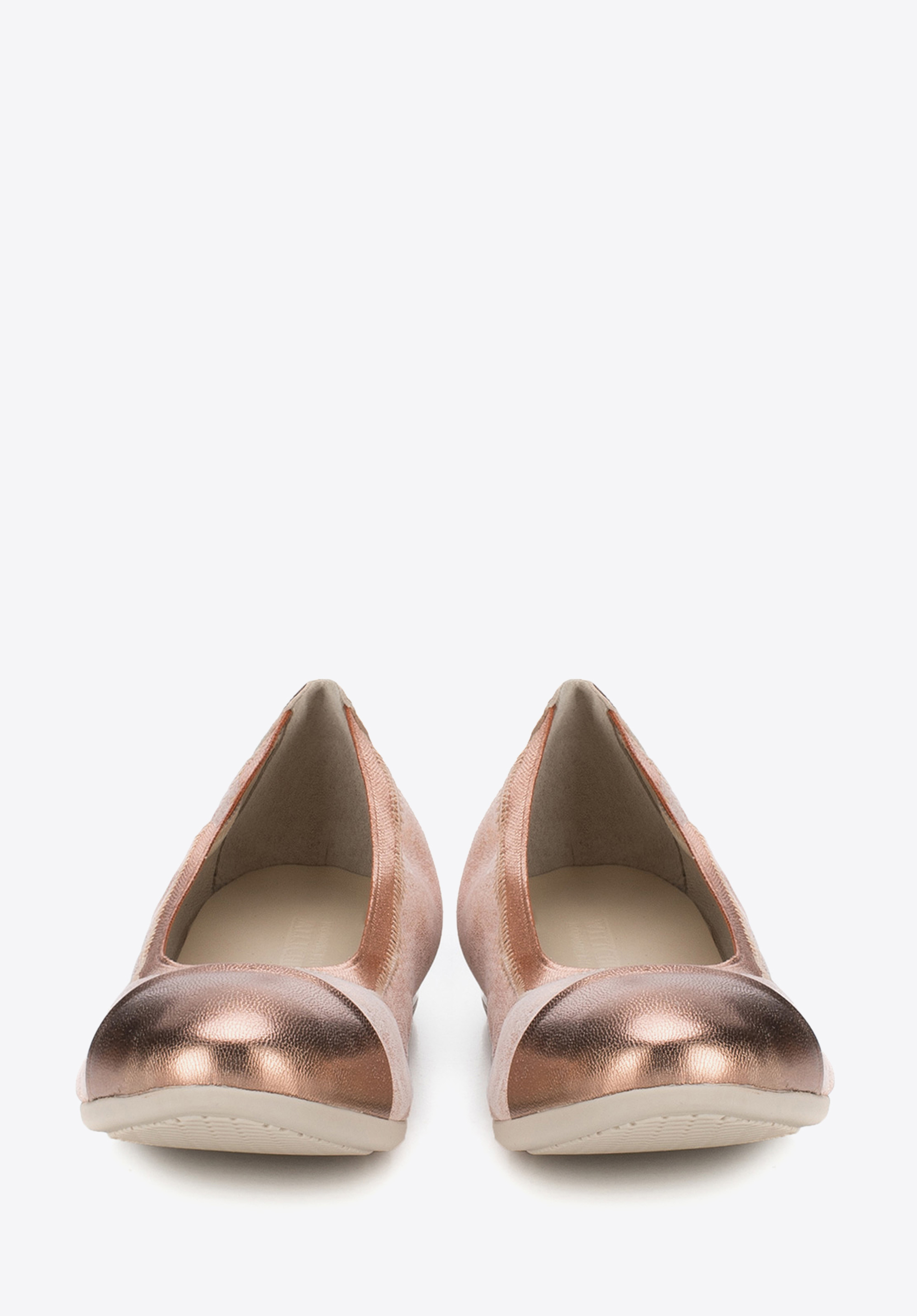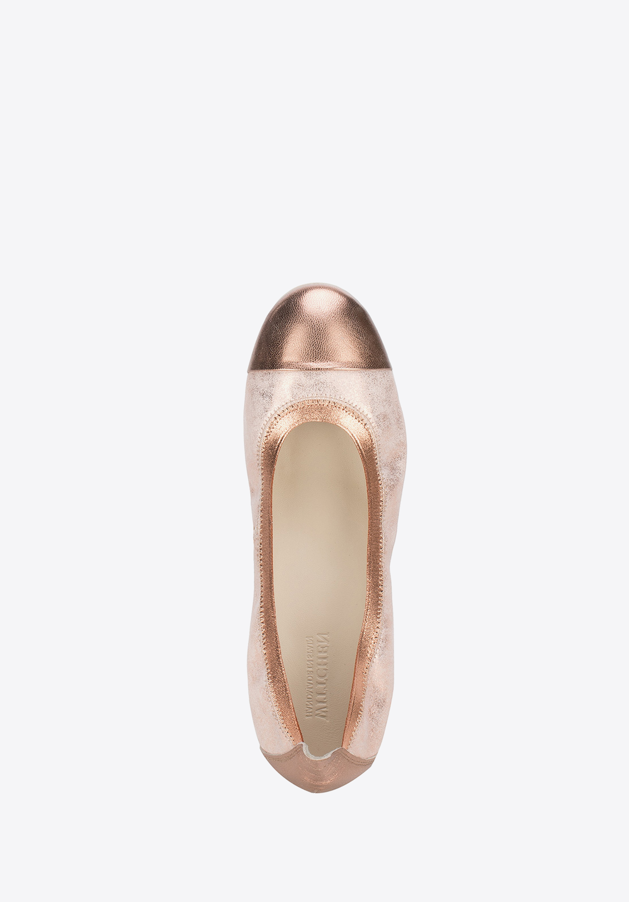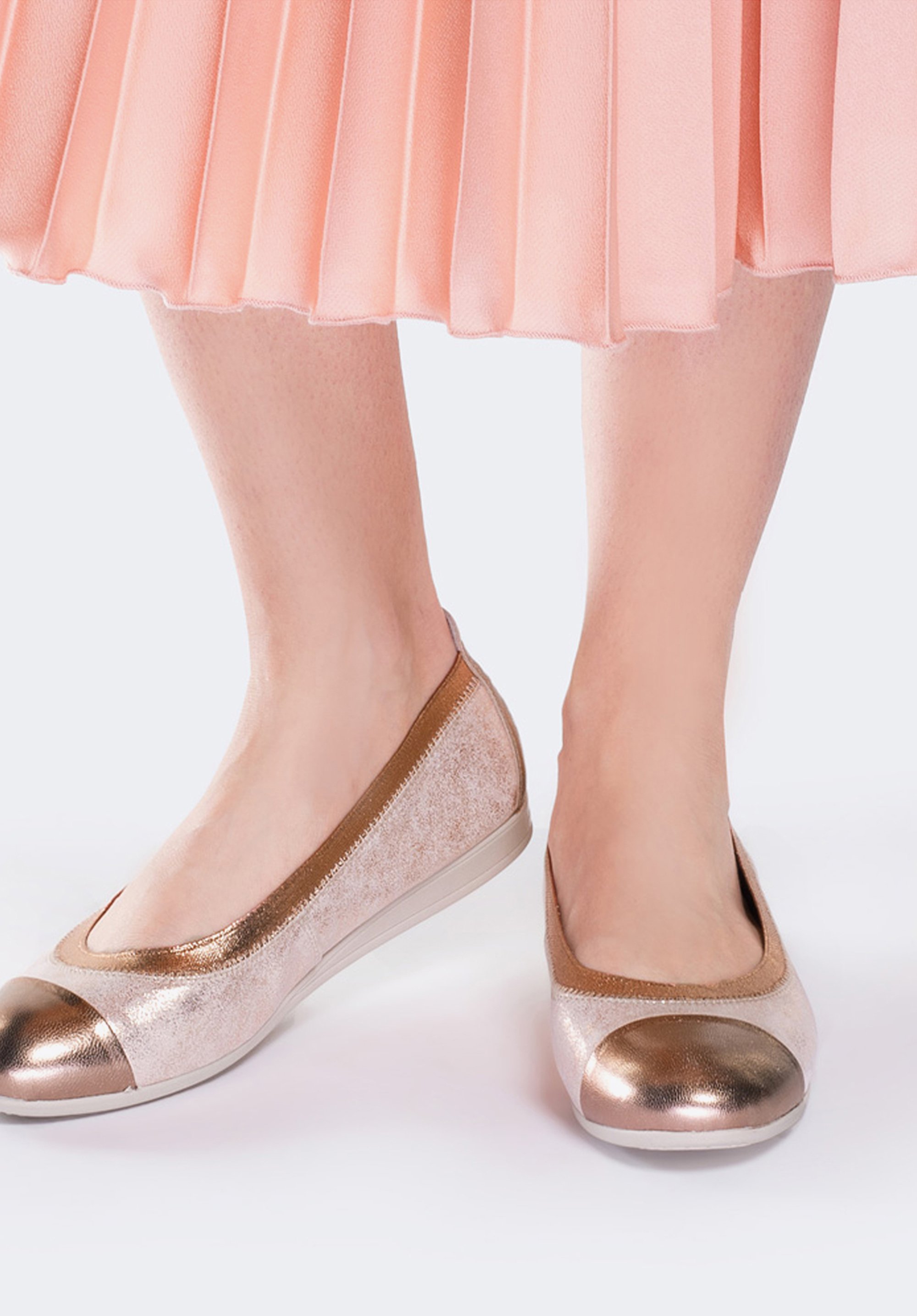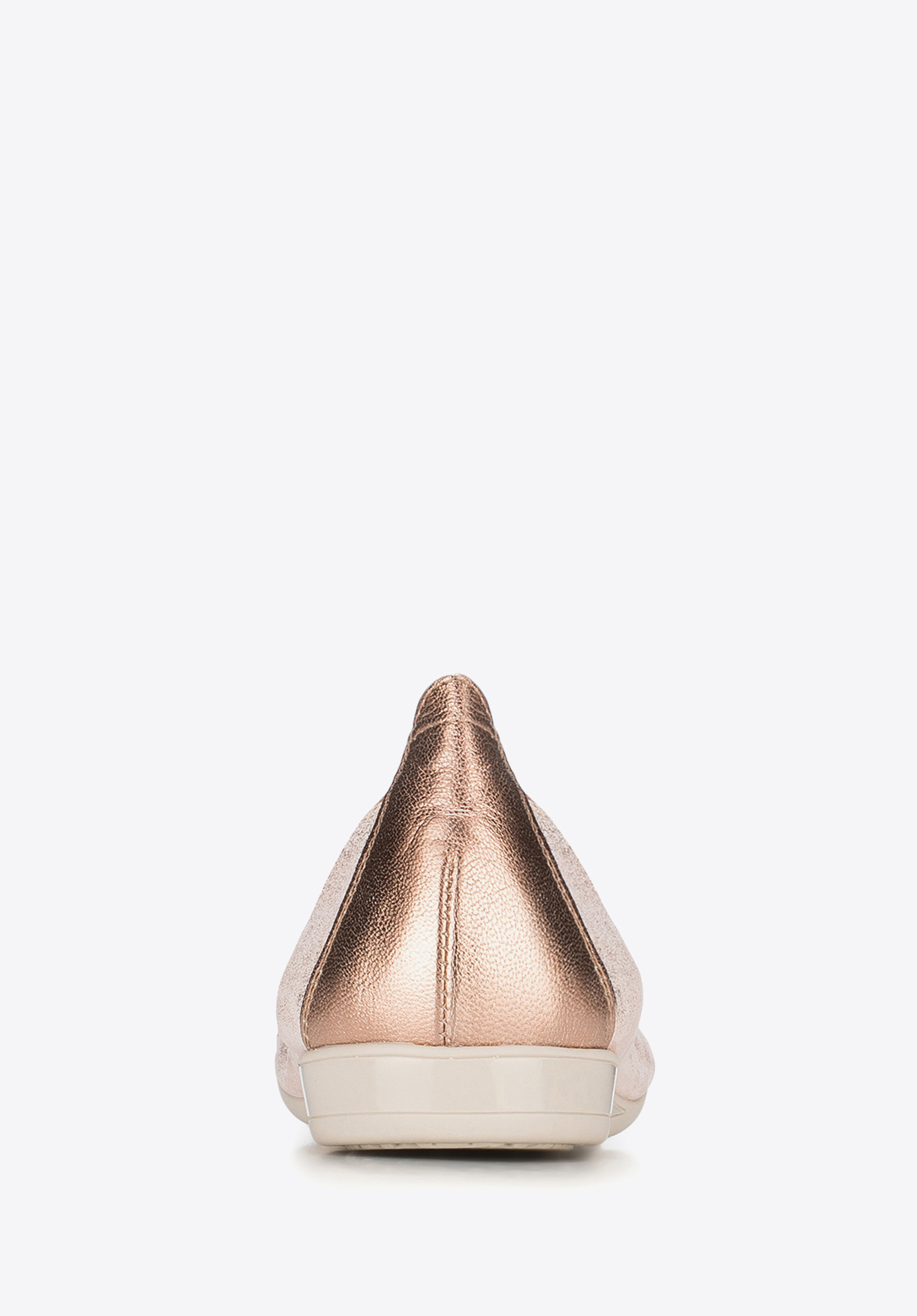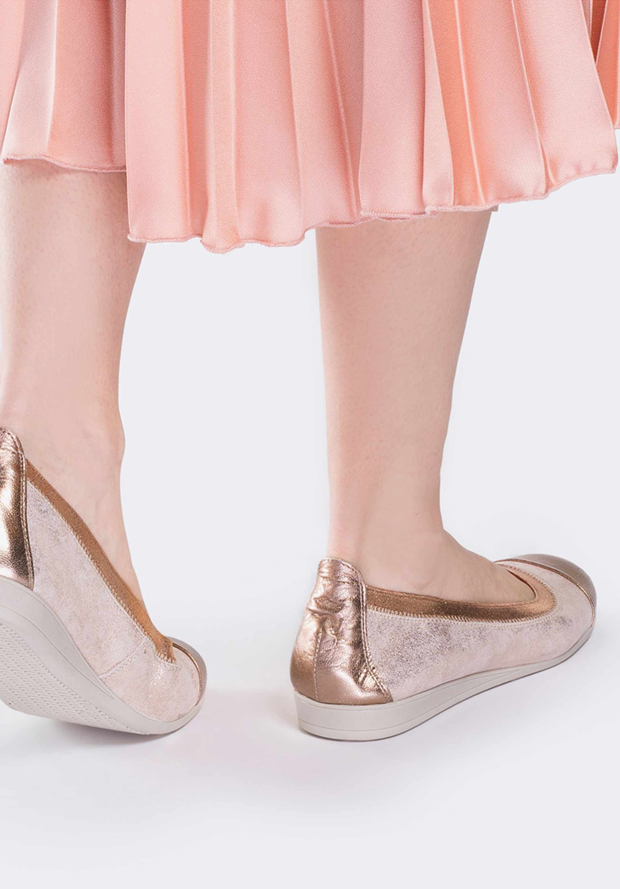 Весняні балетки в металевому рожевому відтінку-це неймовірно дівчача модель, яка додасть гламуру в стиль. Незвичайні прикраси урізноманітнюють класичний стиль взуття, який надзвичайно зручний. Особливістю рішення є еластична вставка і плоска підошва білого відтінку, які підкреслюють невимушений характер балеток. Наша порада: носіть металеві аксесуари і вдень!
