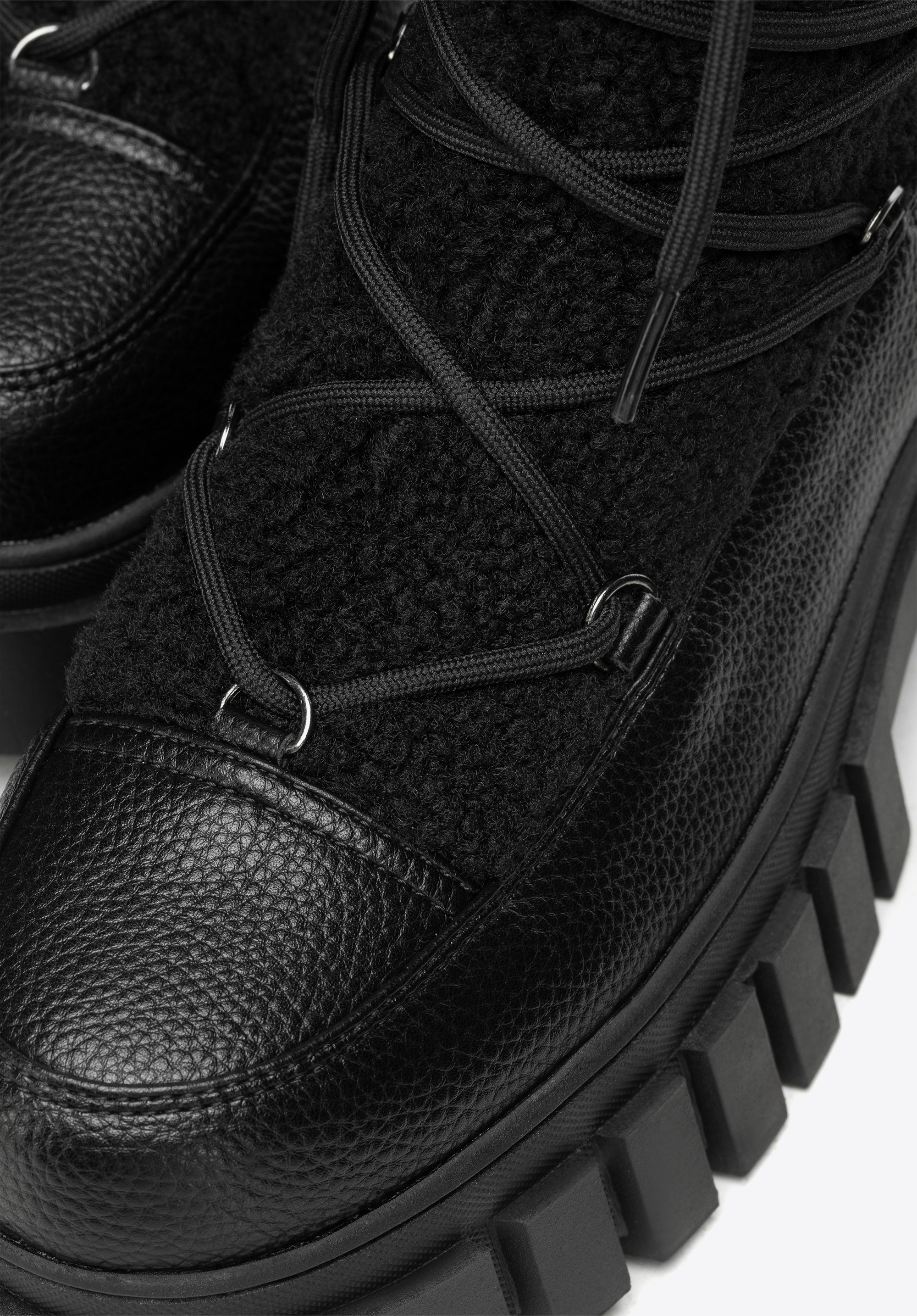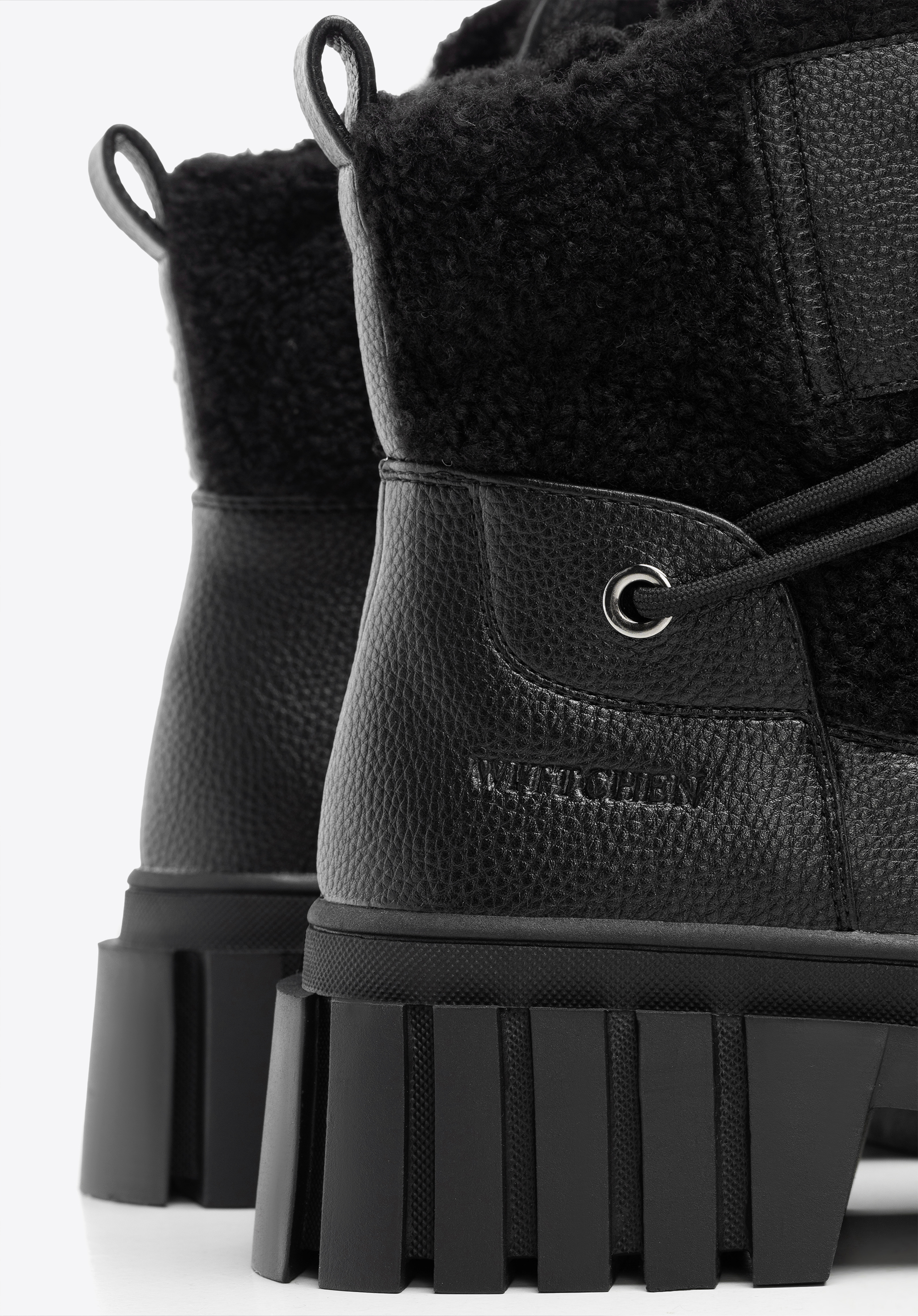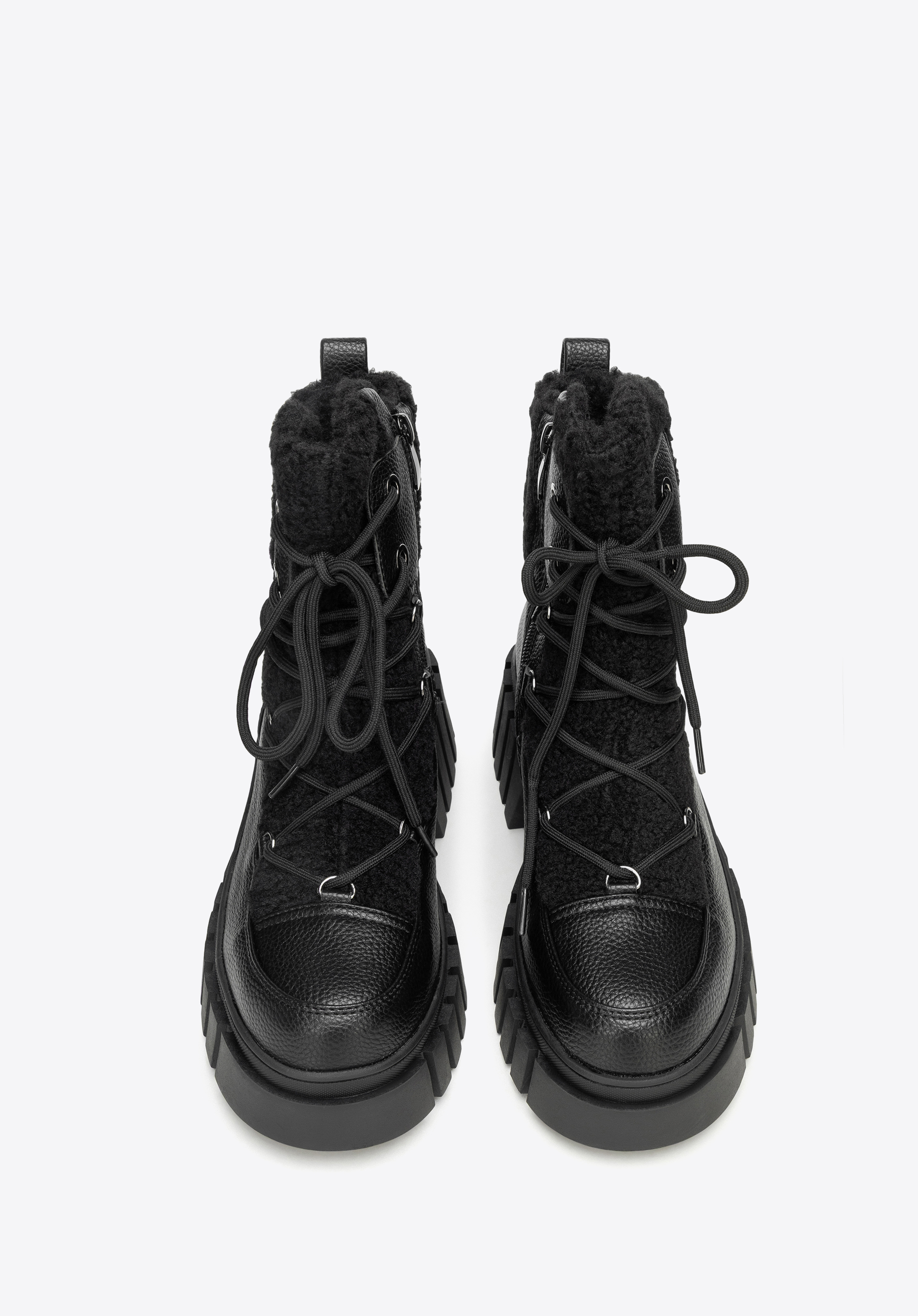 Ці стильні берці поєднують комфорт, сучасний дизайн і практичність. Виготовлені з екошкіри та оздоблені штучним хутром у стилі овчини, вони забезпечують тепло і зручність навіть у найхолодніші дні. Бічна блискавка полегшує швидке взування, а шнурівка спереду дозволяє ідеально підлаштувати черевики під ногу. Вони надають образу характеру — ти почуватимешся комфортно й виглядатимеш модно впродовж усього дня.