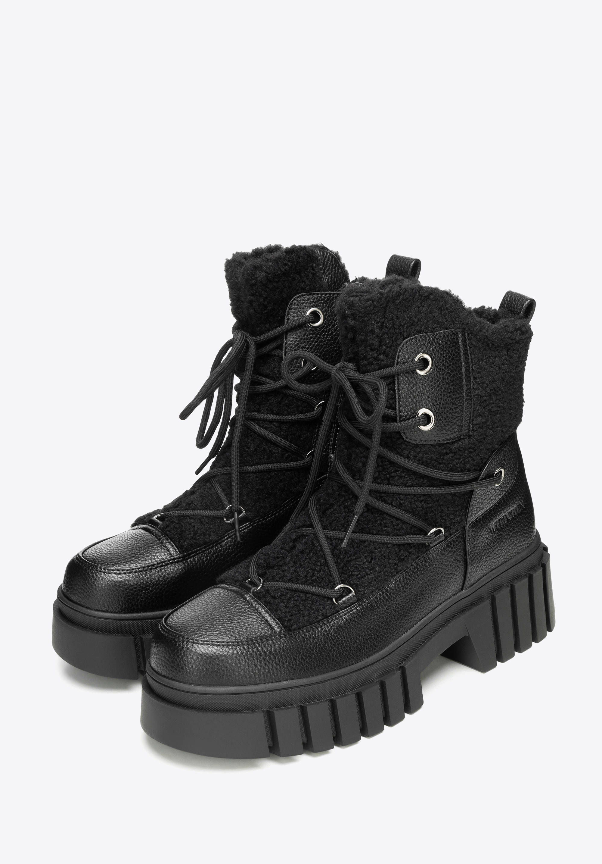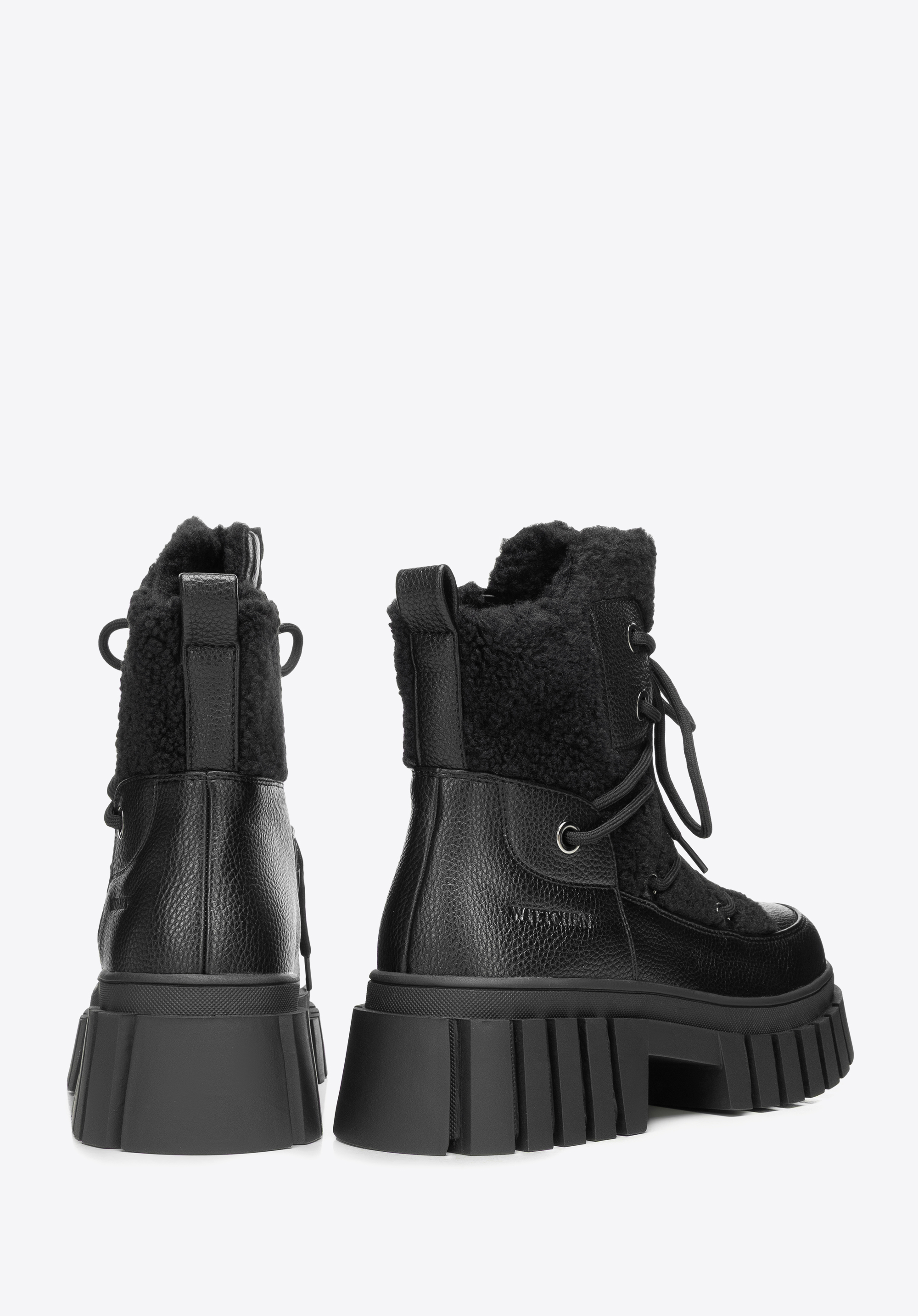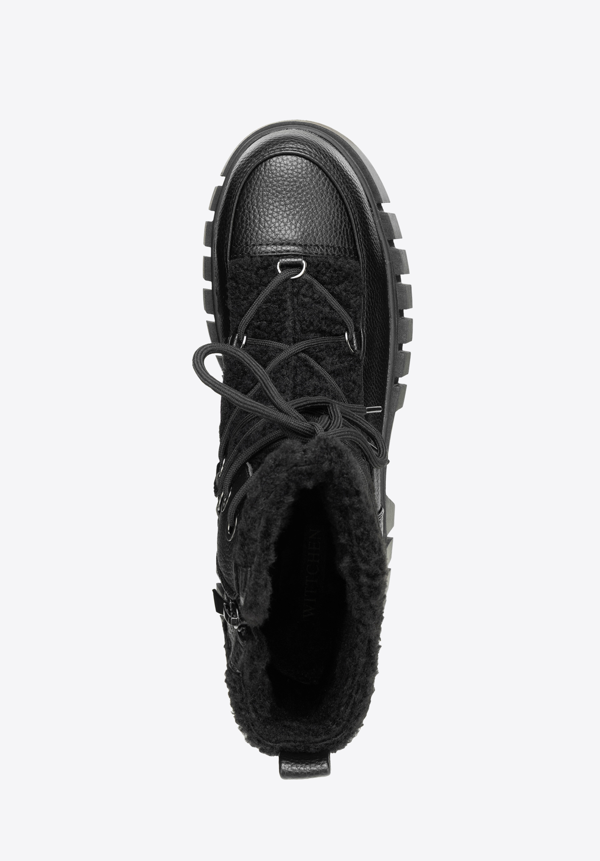 Ці стильні берці поєднують комфорт, сучасний дизайн і практичність. Виготовлені з екошкіри та оздоблені штучним хутром у стилі овчини, вони забезпечують тепло і зручність навіть у найхолодніші дні. Бічна блискавка полегшує швидке взування, а шнурівка спереду дозволяє ідеально підлаштувати черевики під ногу. Вони надають образу характеру — ти почуватимешся комфортно й виглядатимеш модно впродовж усього дня.