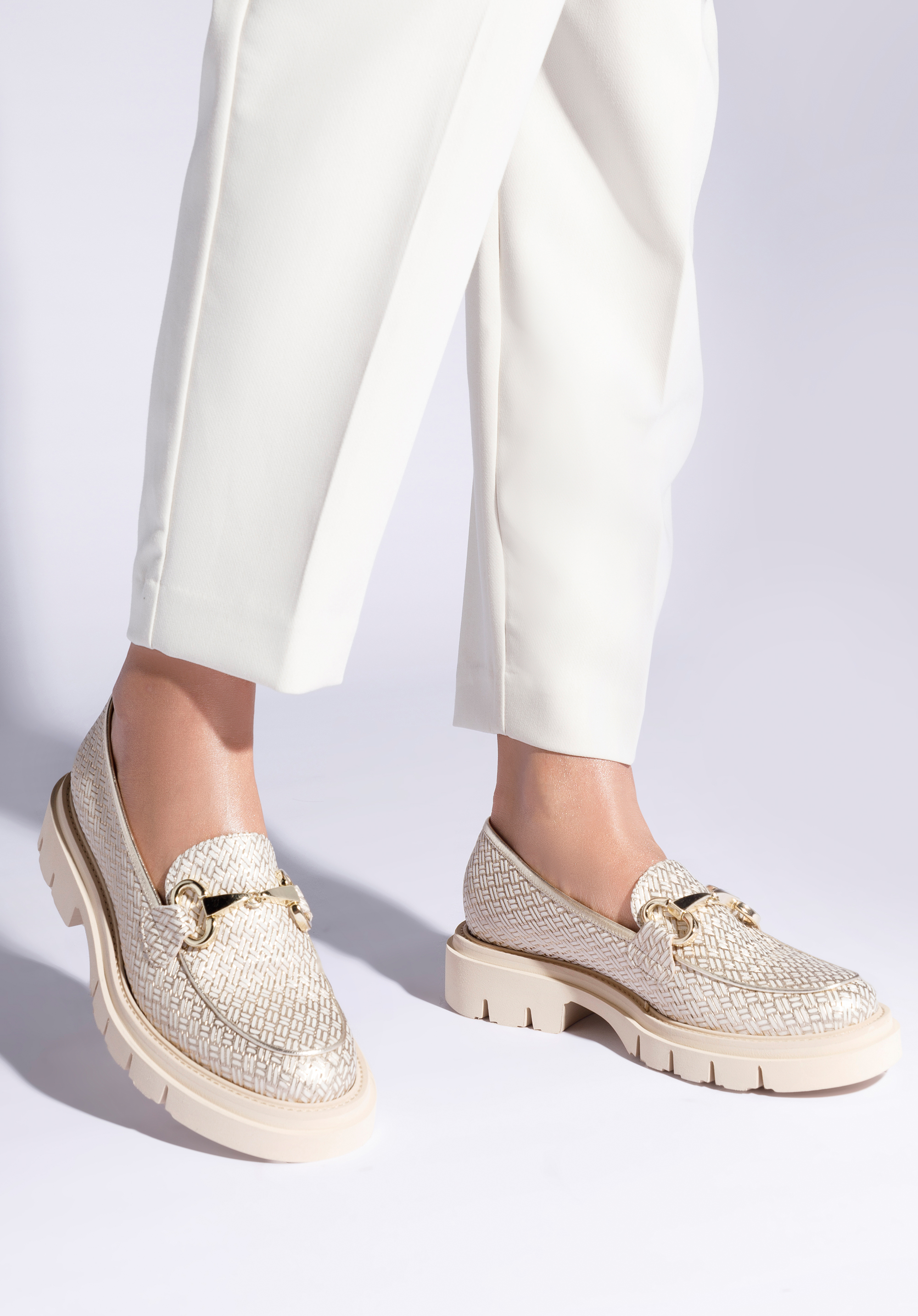 Жіночі блискучі шкіряні мокасини з пряжкою бежево-золоті