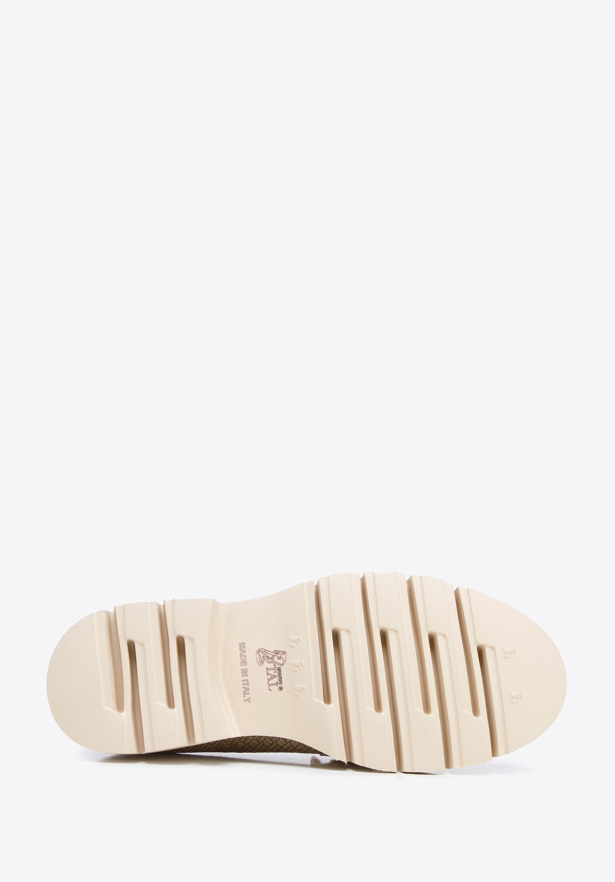У цих мокасинах ви будете виглядати неповторно кожен день. Виготовлені в Італії з натуральної шкіри з металевим блиском, яка дуже приємна на дотик. Додатково воні прикрашений фактурою, що нагадує плетіння. Блискуча пряжка та оброблений носок стильно завершують ціле. Це взуття легке, а завдяки товстій платформі та шкіряній устілці в ньому можна комфортно ходити багато годин. Вони відмінно виглядатимуть з брюками до щиколотки і платтям. Жіночі блискучі шкіряні мокасини з пряжкою - це стильний аксесуар, який можна носити кожен день.