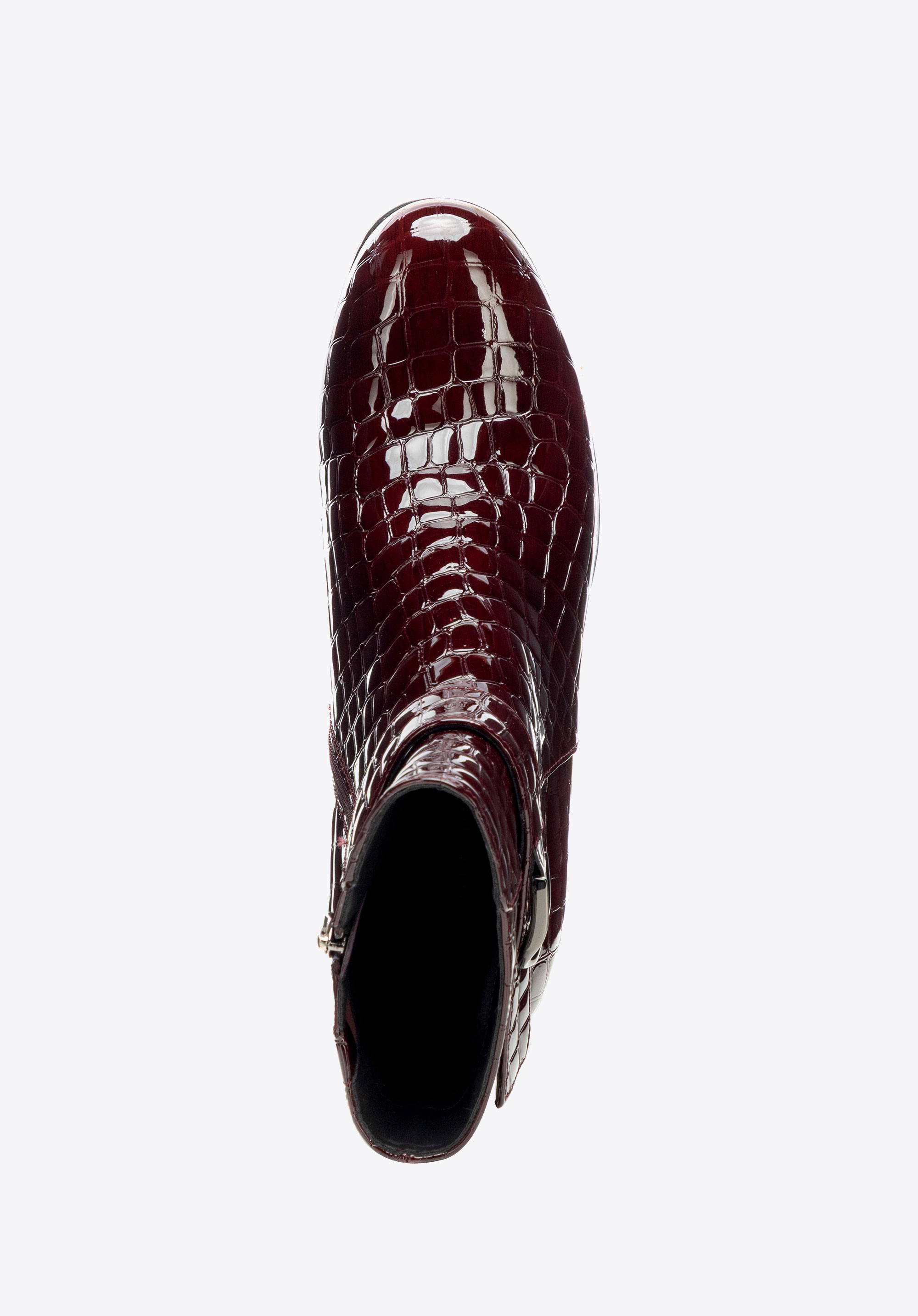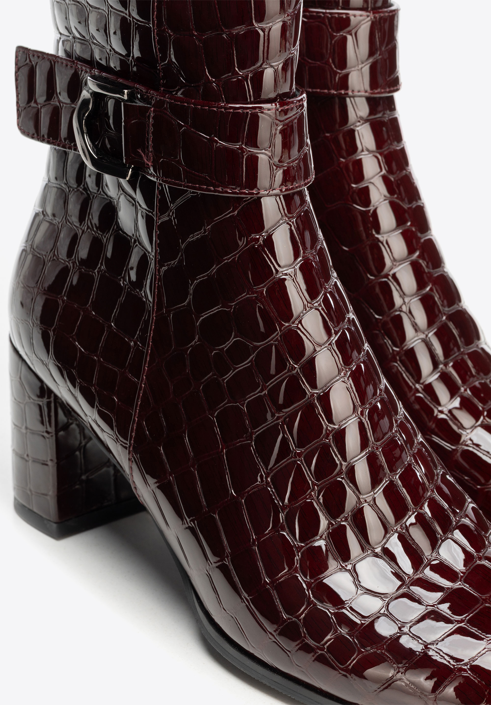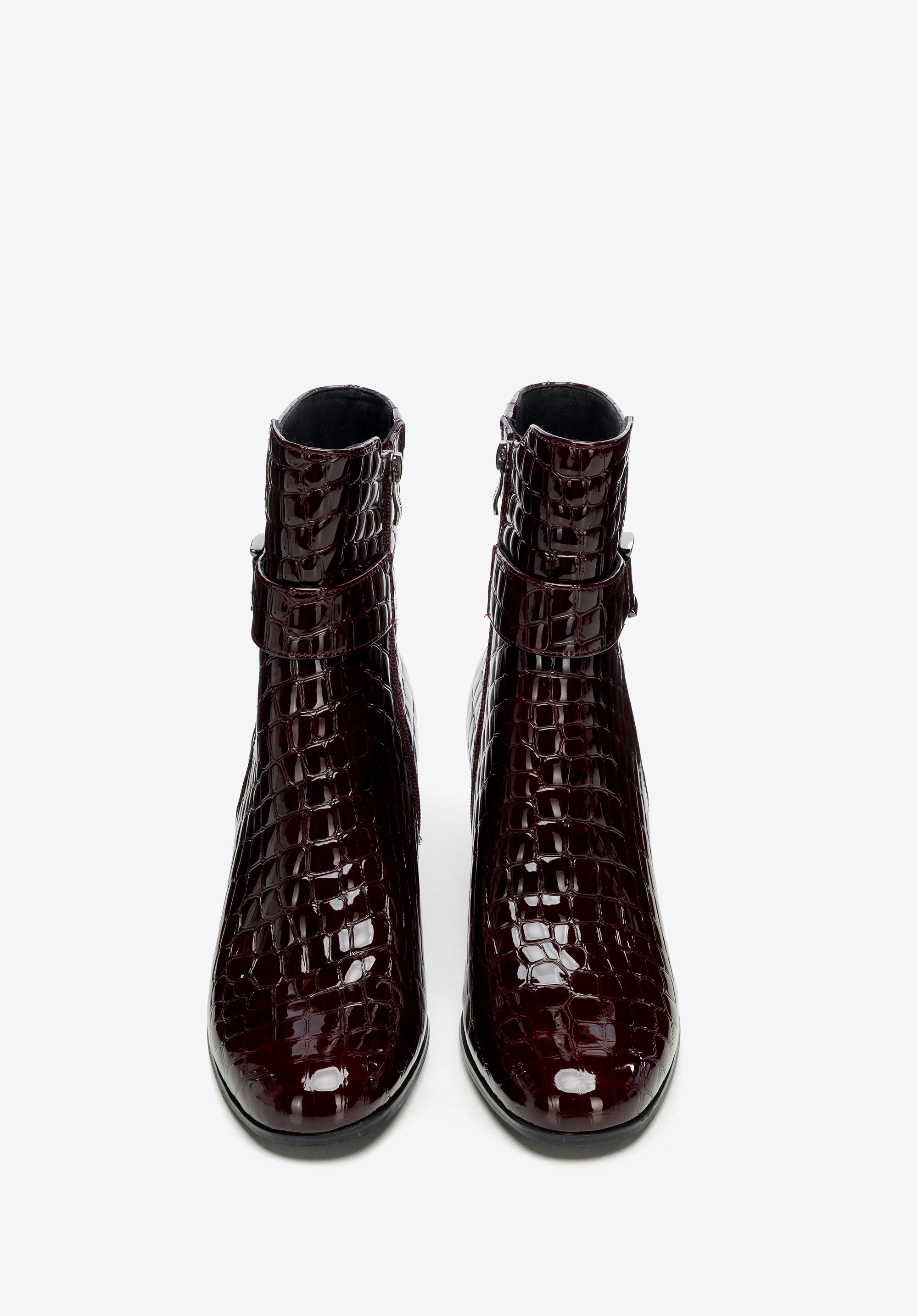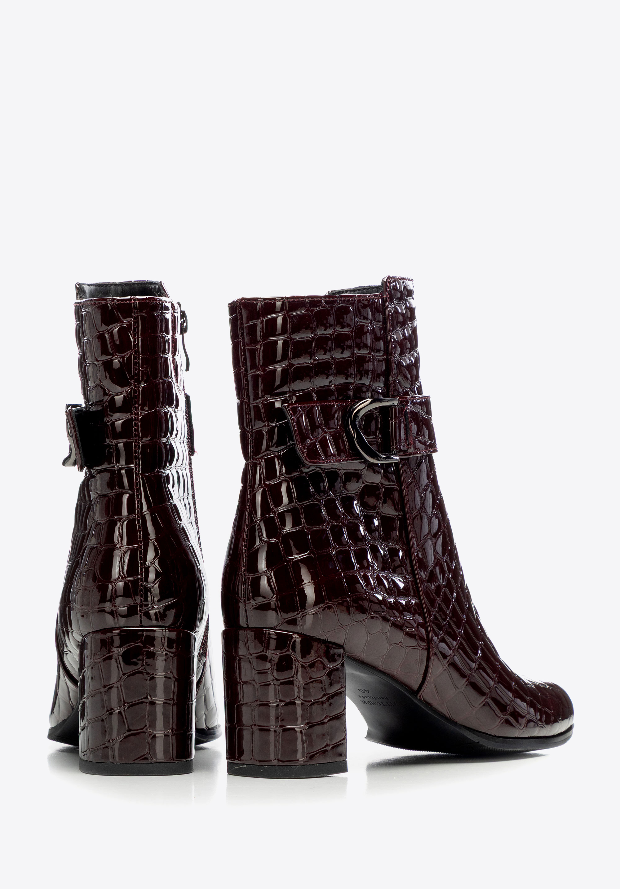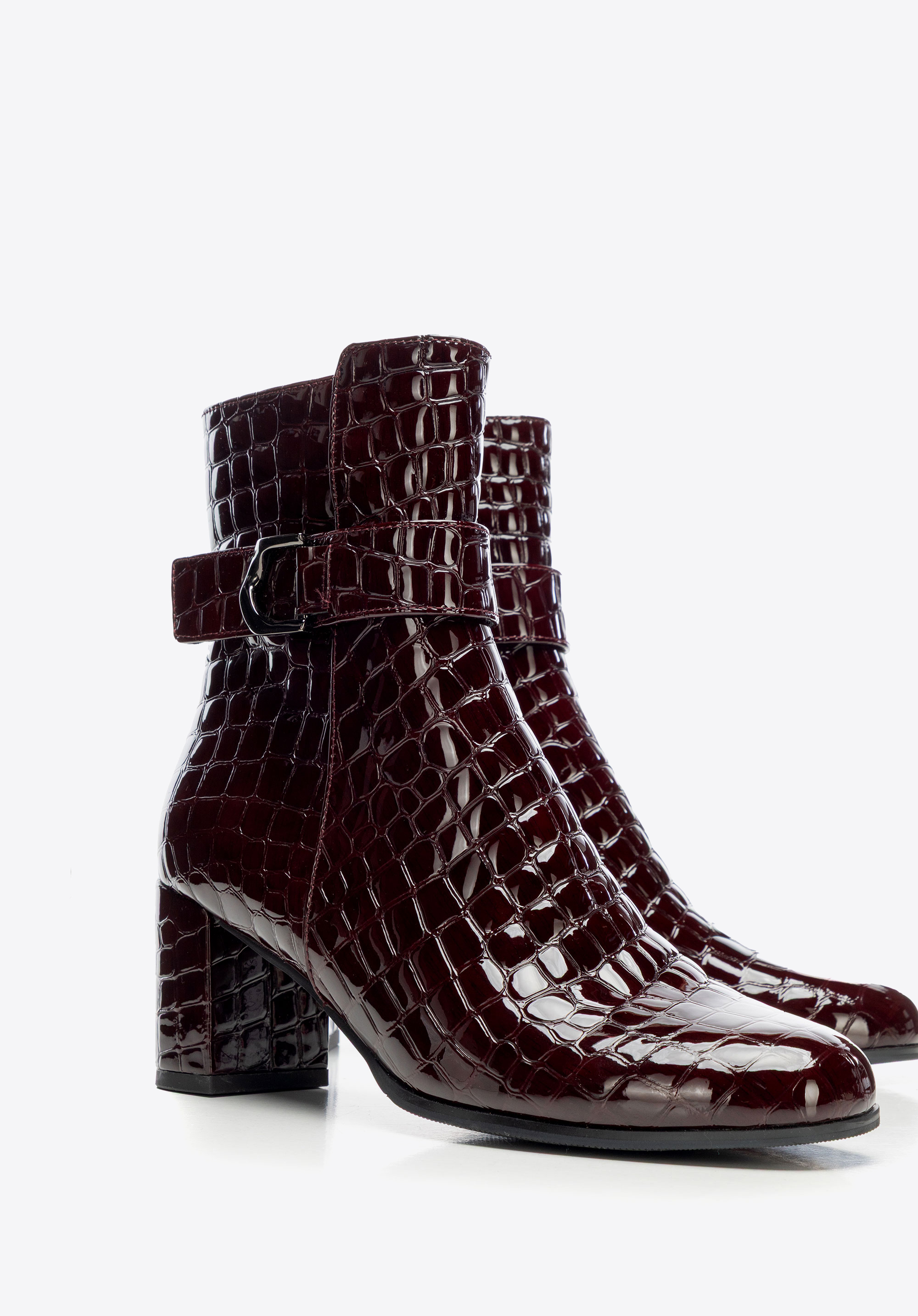 Елегантна класика з ноткою сучасності – жіночі ботильйони з натуральної лакованої шкіри з фактурою croco привертають увагу своїм блиском. Мигдалеподібний носок і декоративний ремінець додають жіночності, а каблук-стовпчик поєднує стабільність з елегантністю, забезпечуючи комфорт і впевненість у кроці протягом усього дня.