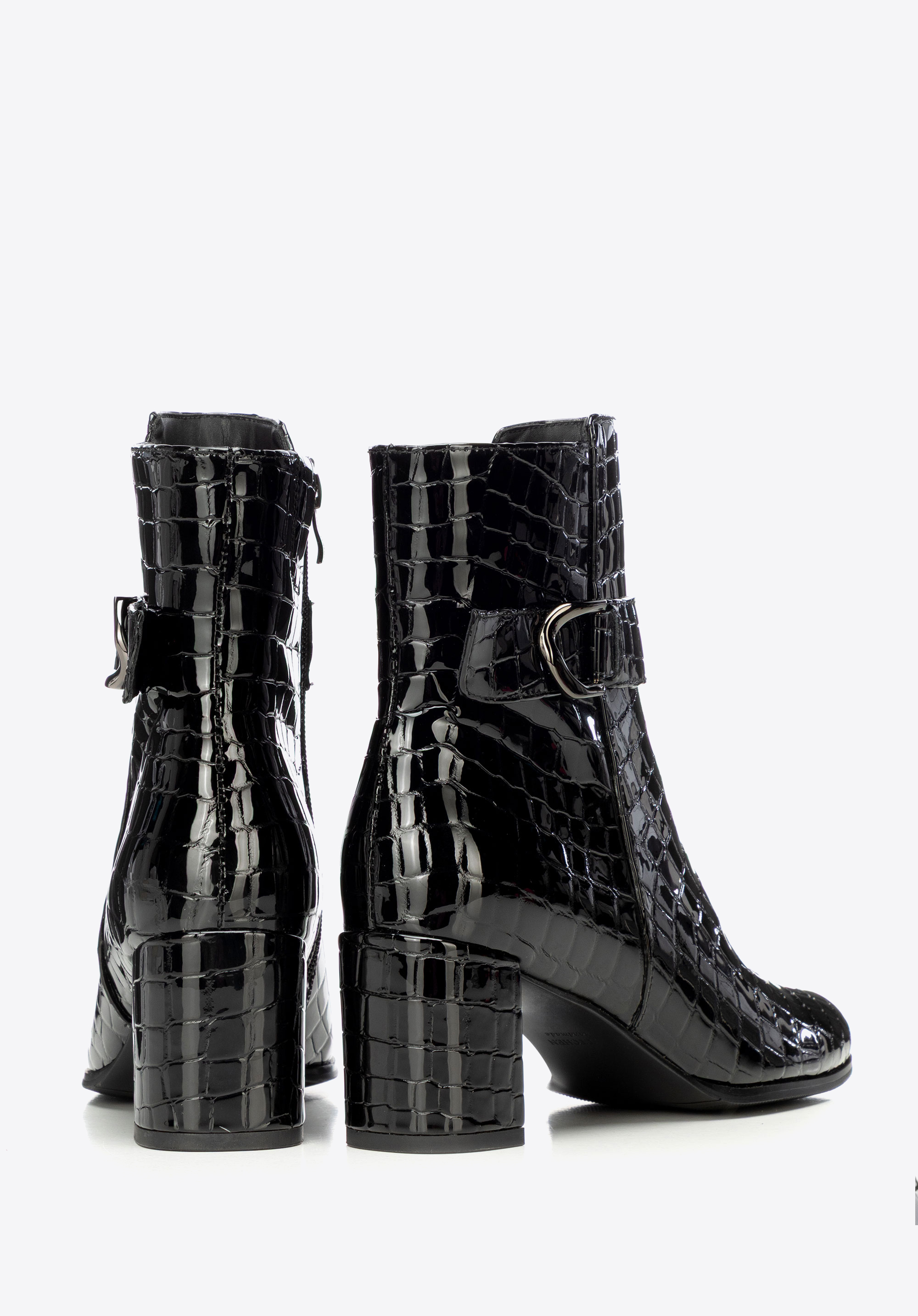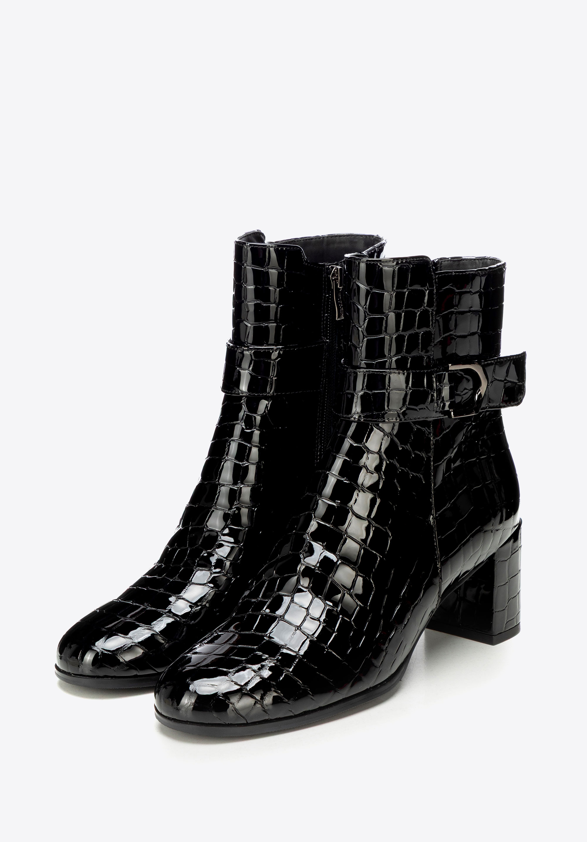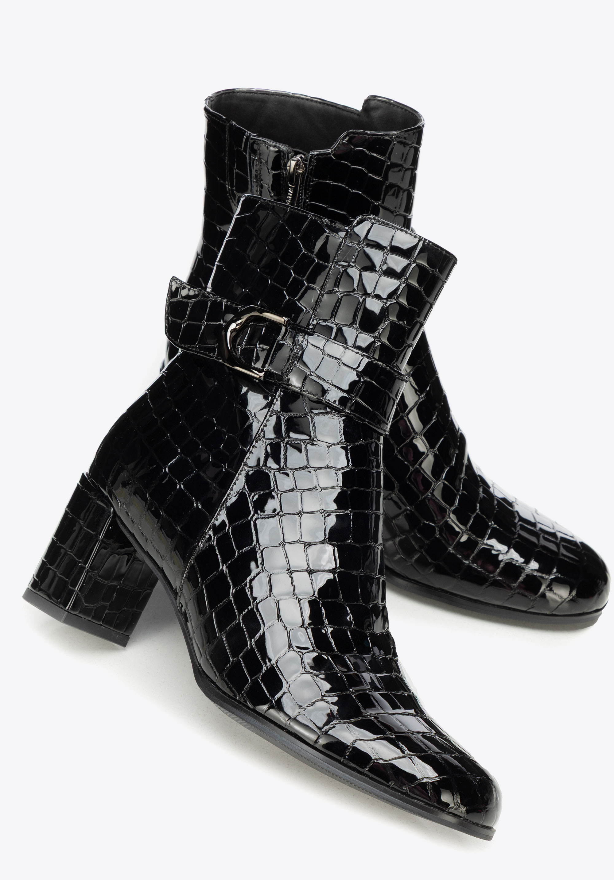 Елегантна класика з ноткою сучасності – жіночі ботильйони з натуральної лакованої шкіри з фактурою croco привертають увагу своїм блиском. Мигдалеподібний носок і декоративний ремінець додають жіночності, а каблук-стовпчик поєднує стабільність з елегантністю, забезпечуючи комфорт і впевненість у кроці протягом усього дня.