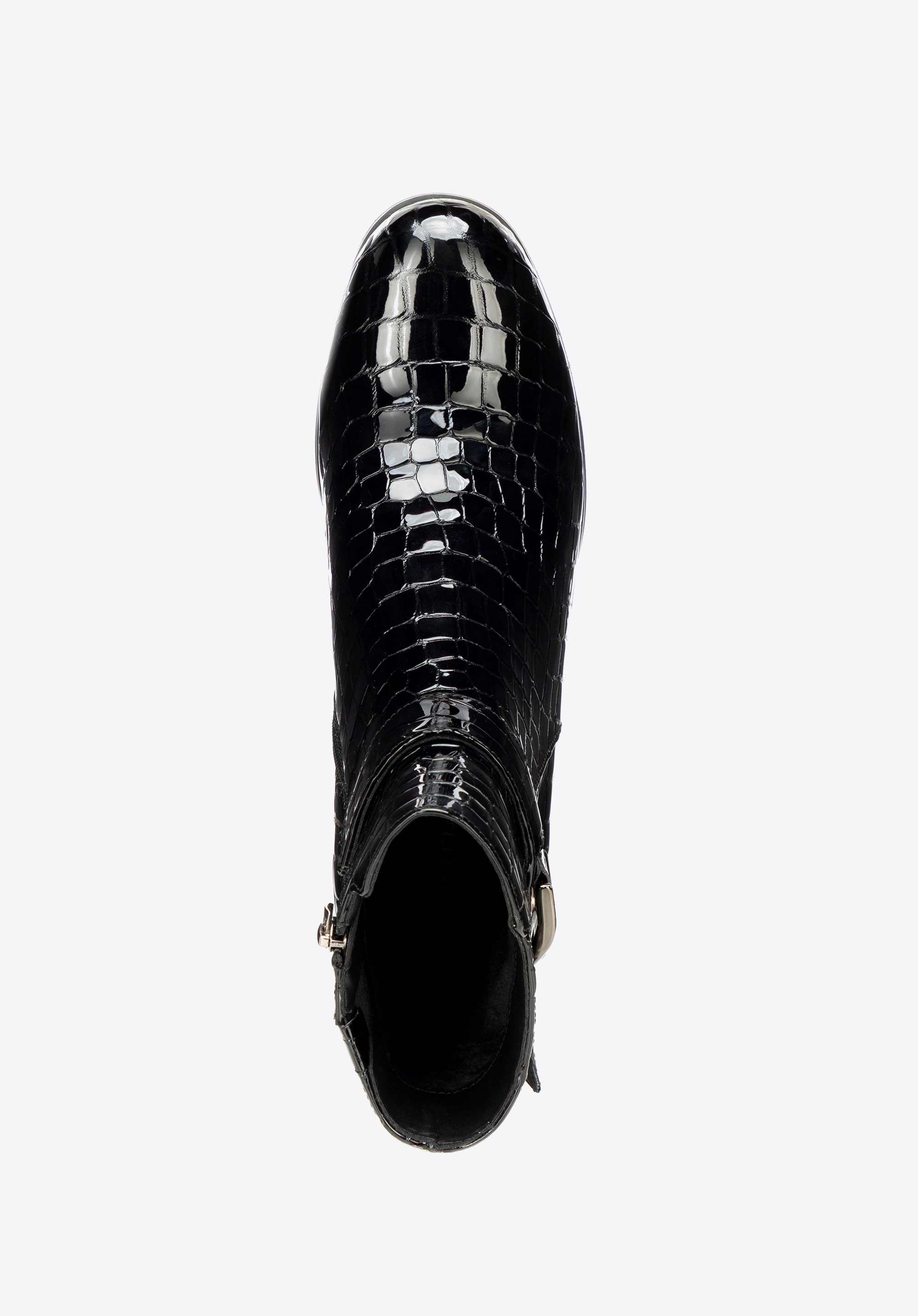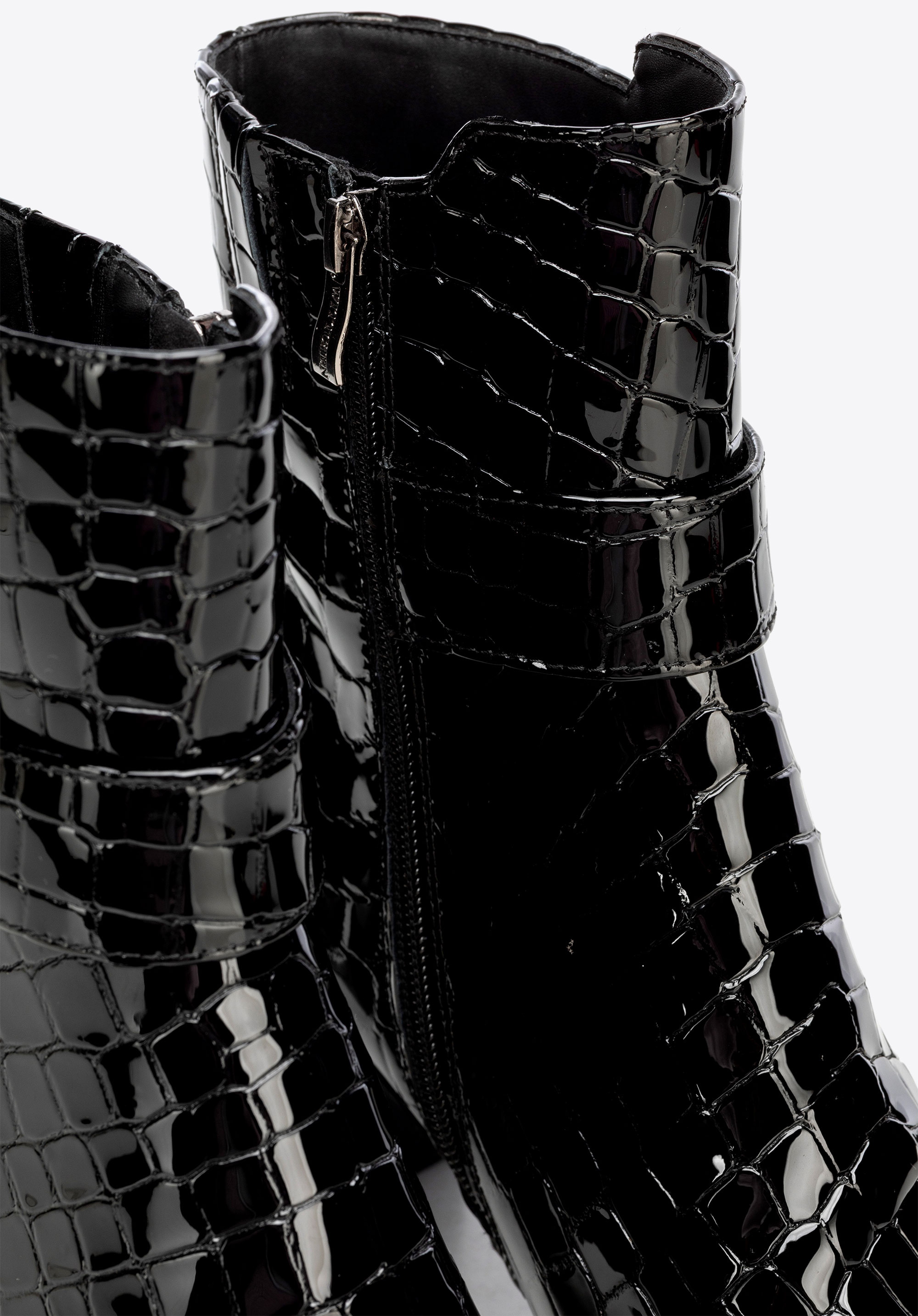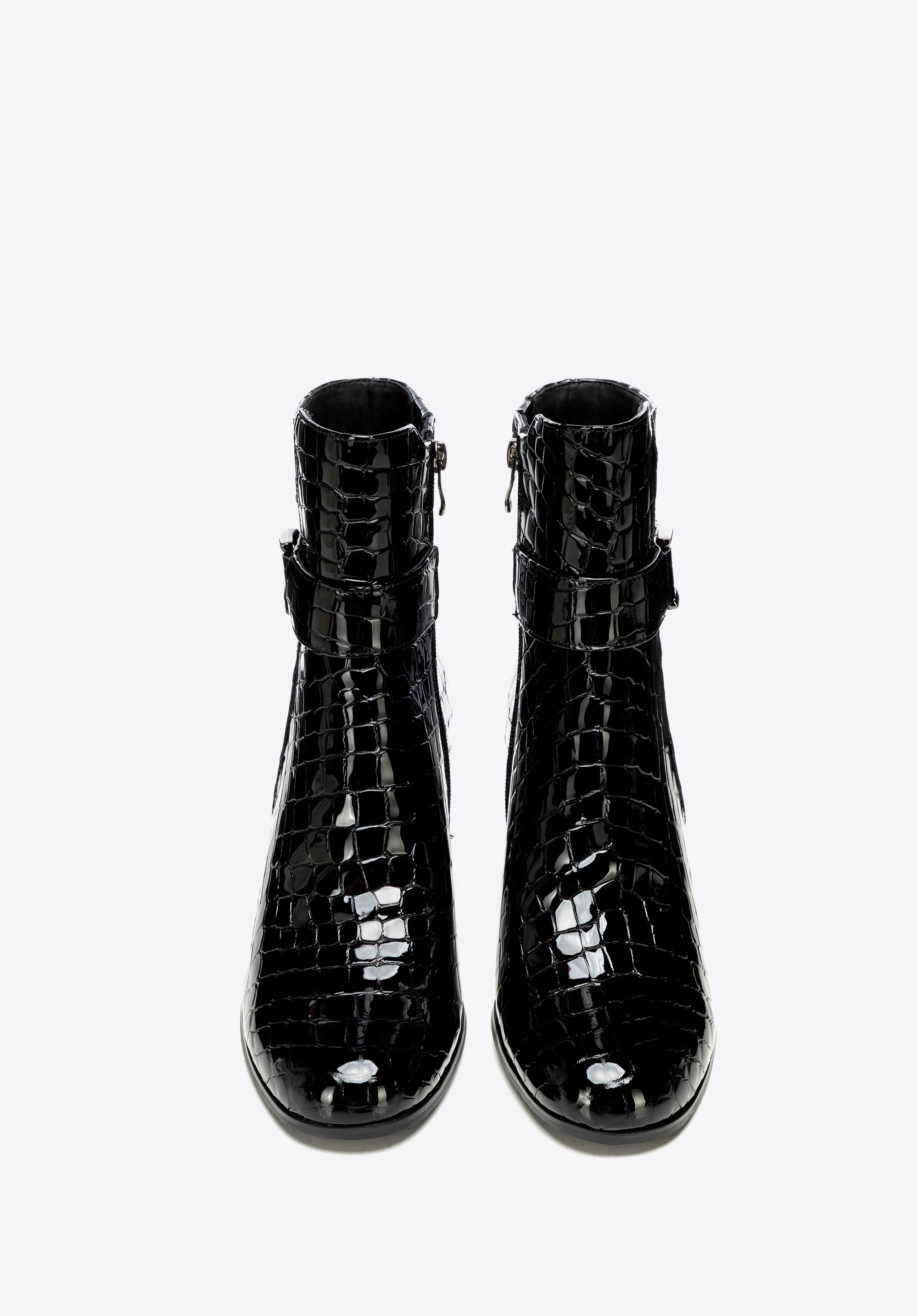 Елегантна класика з ноткою сучасності – жіночі ботильйони з натуральної лакованої шкіри з фактурою croco привертають увагу своїм блиском. Мигдалеподібний носок і декоративний ремінець додають жіночності, а каблук-стовпчик поєднує стабільність з елегантністю, забезпечуючи комфорт і впевненість у кроці протягом усього дня.