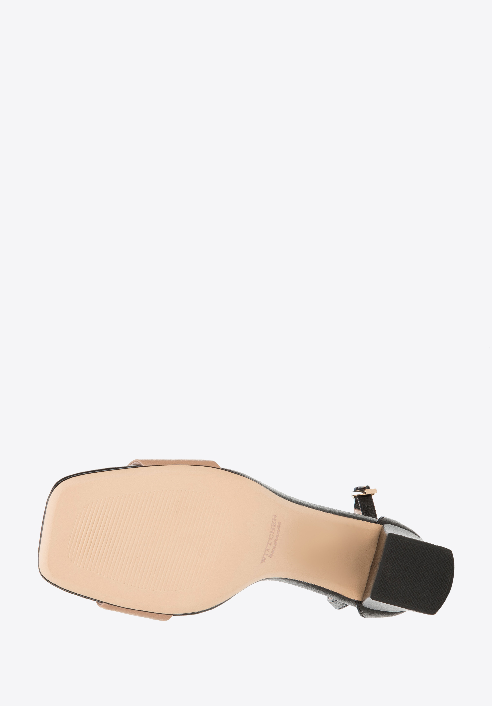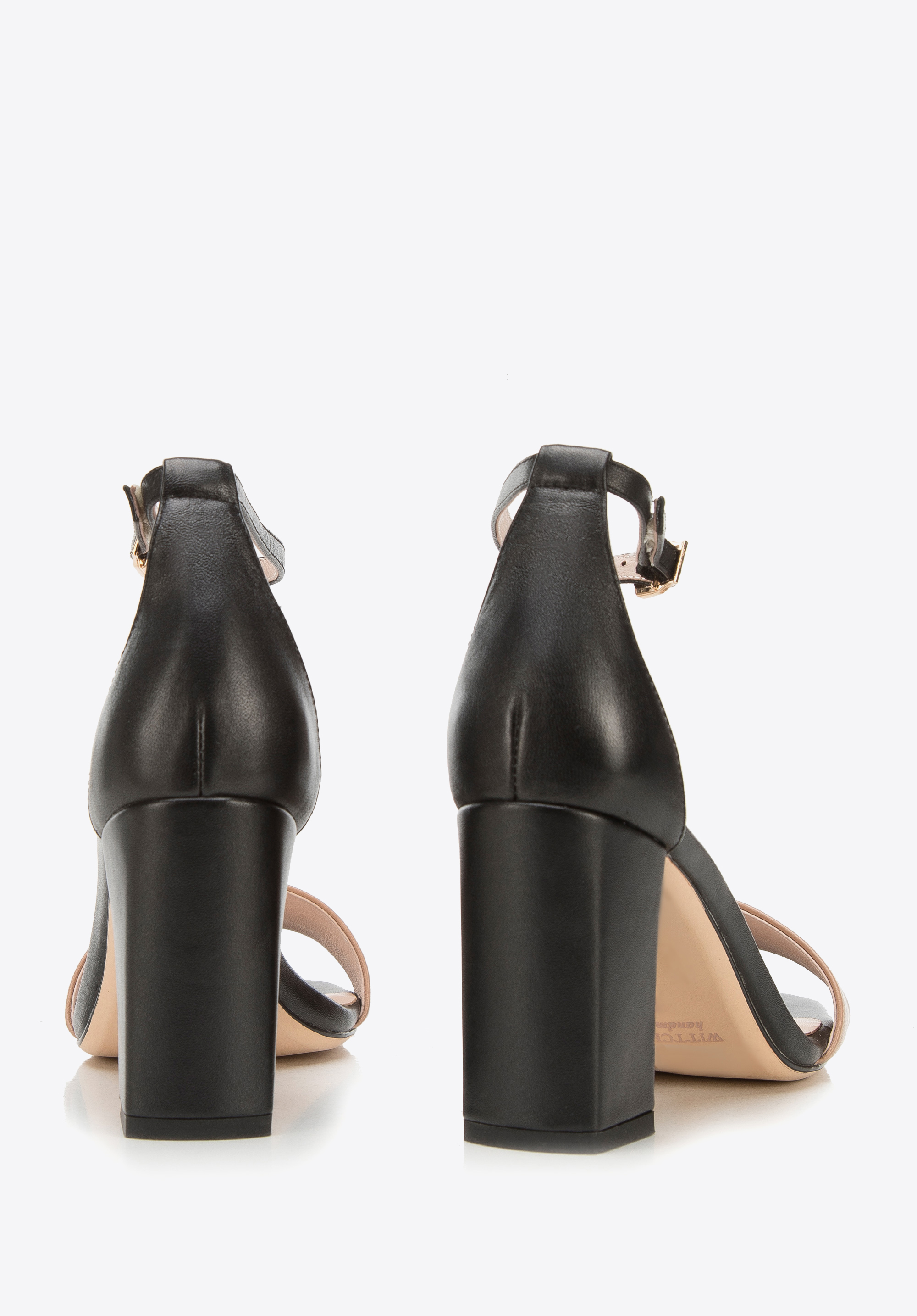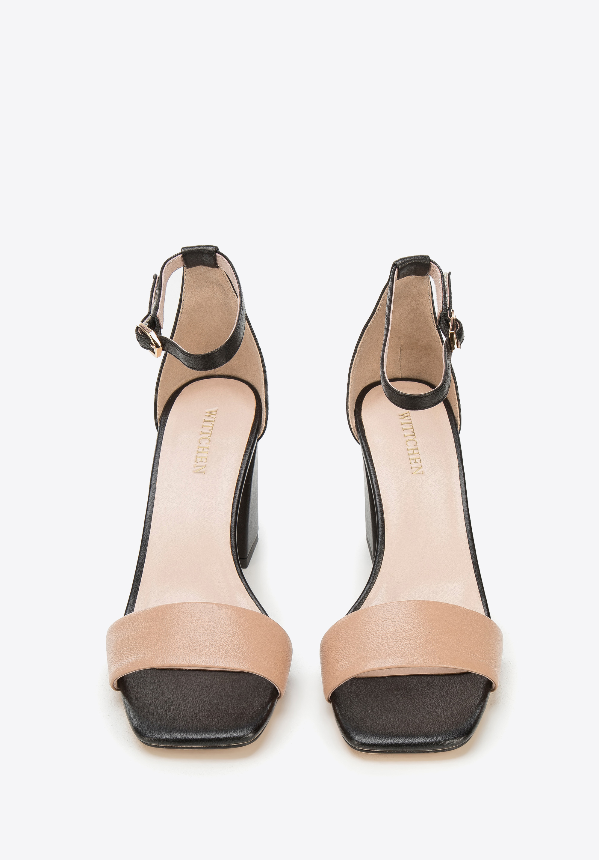 Жіночі двоколірні шкіряні босоніжки на підборах чорно-бежеві