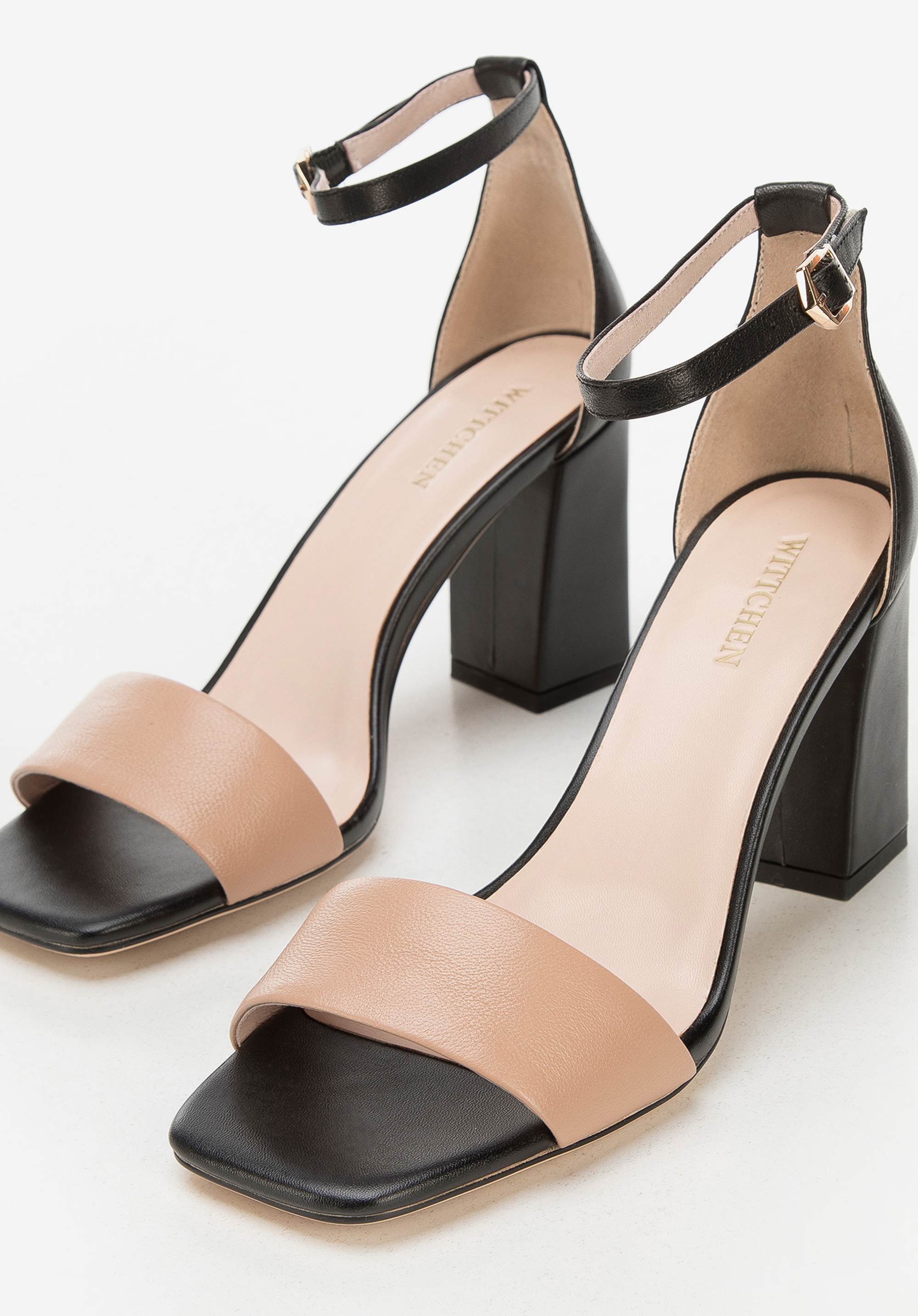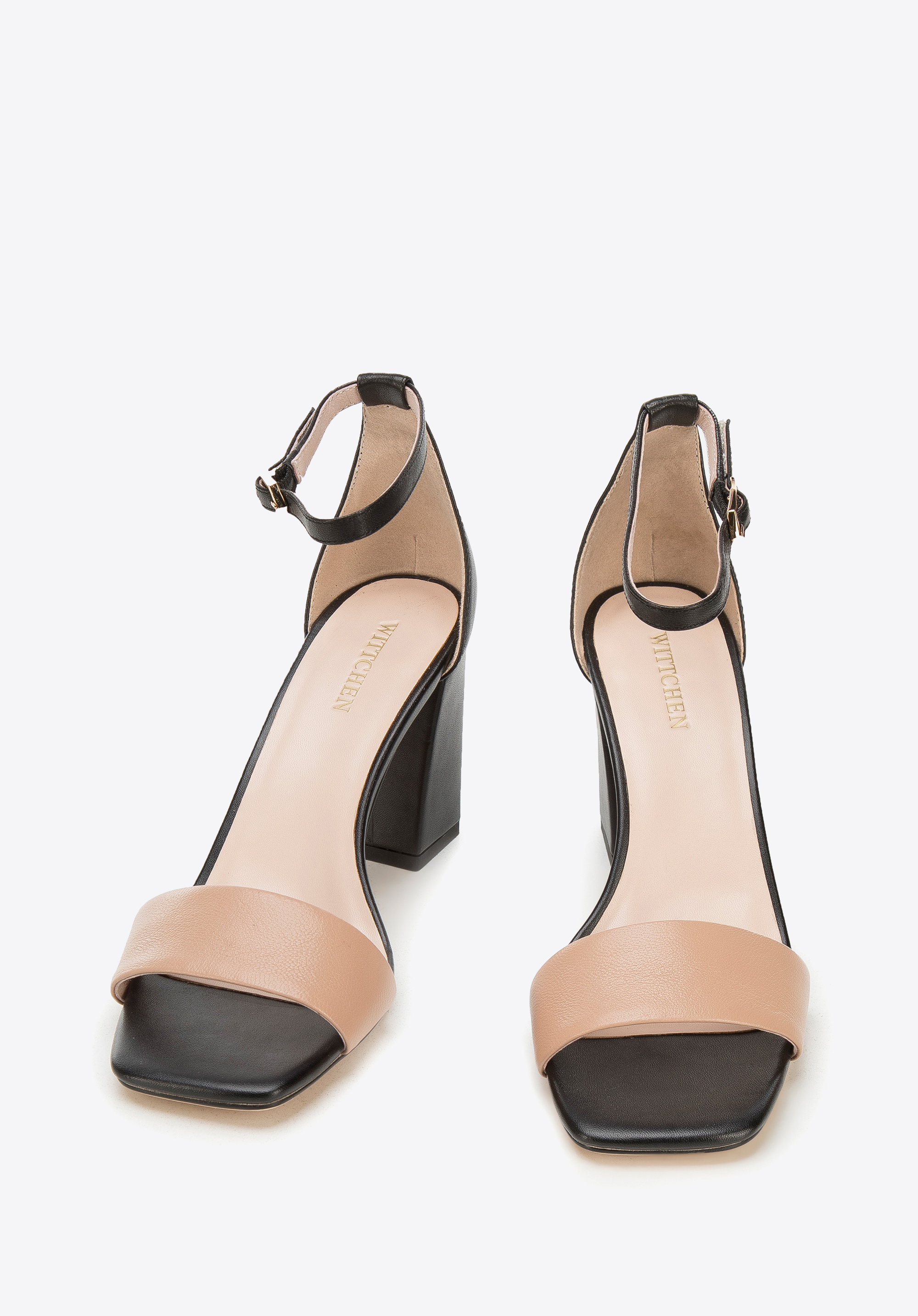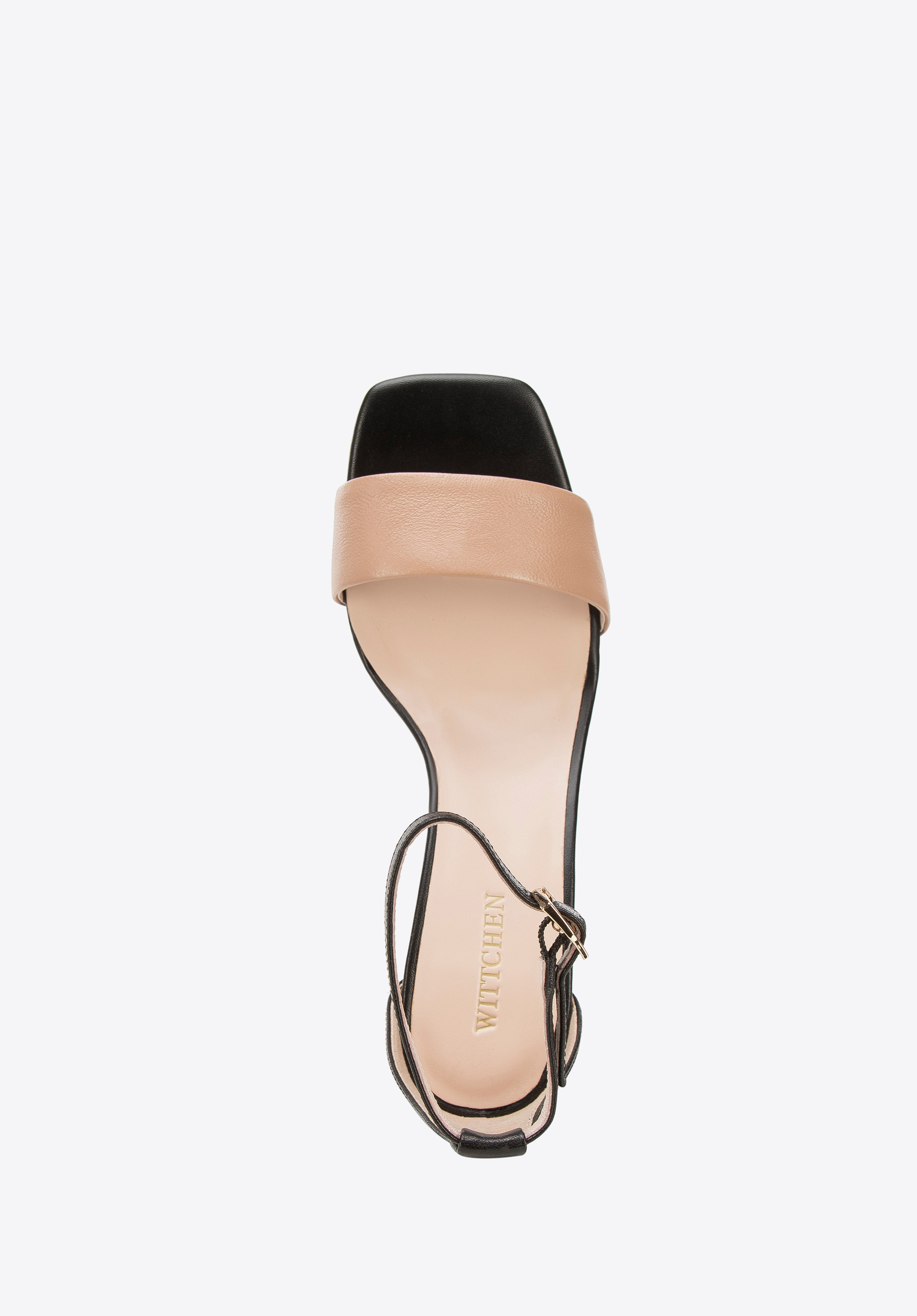 Жіночі двоколірні шкіряні босоніжки на підборах чорно-бежеві
