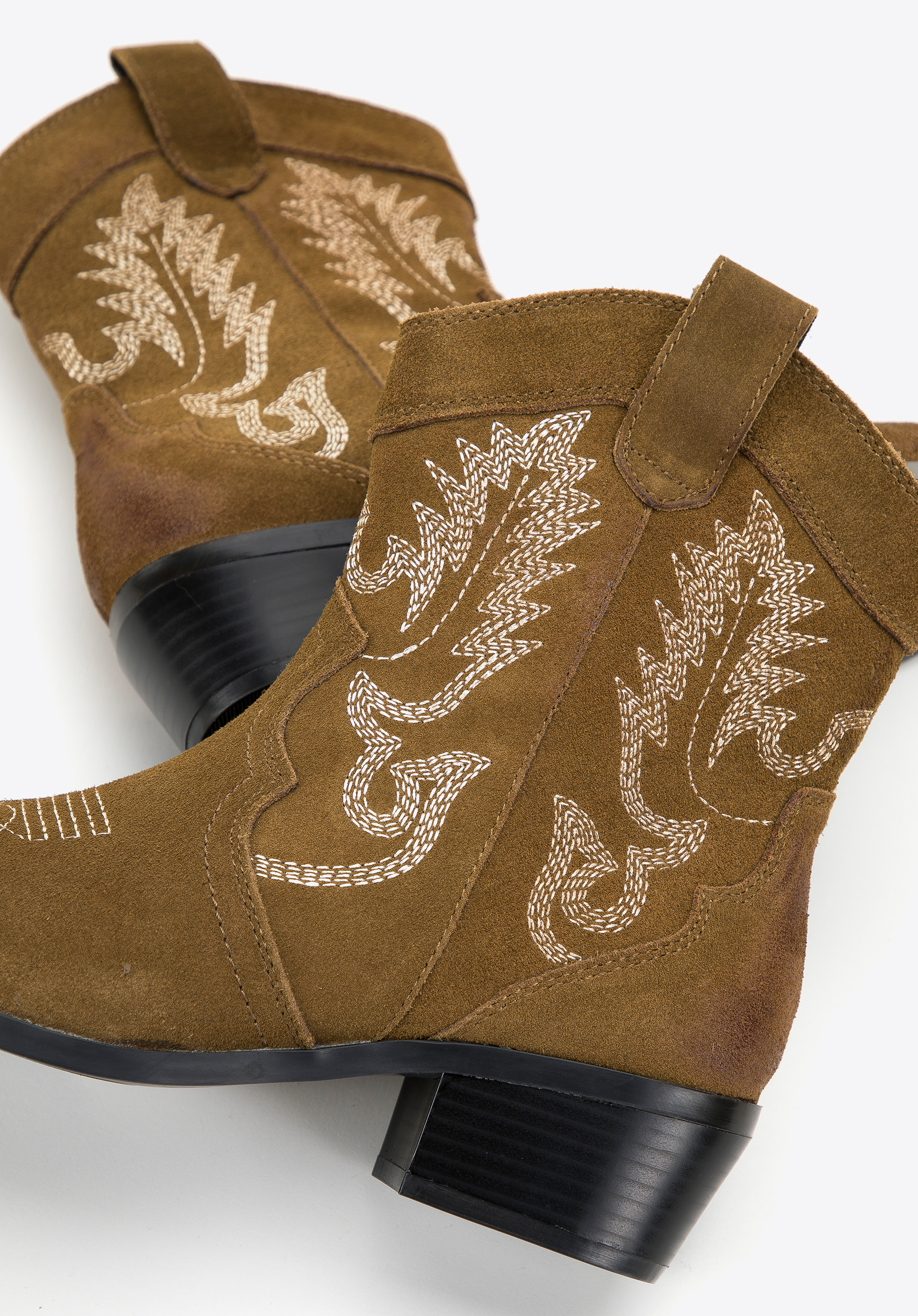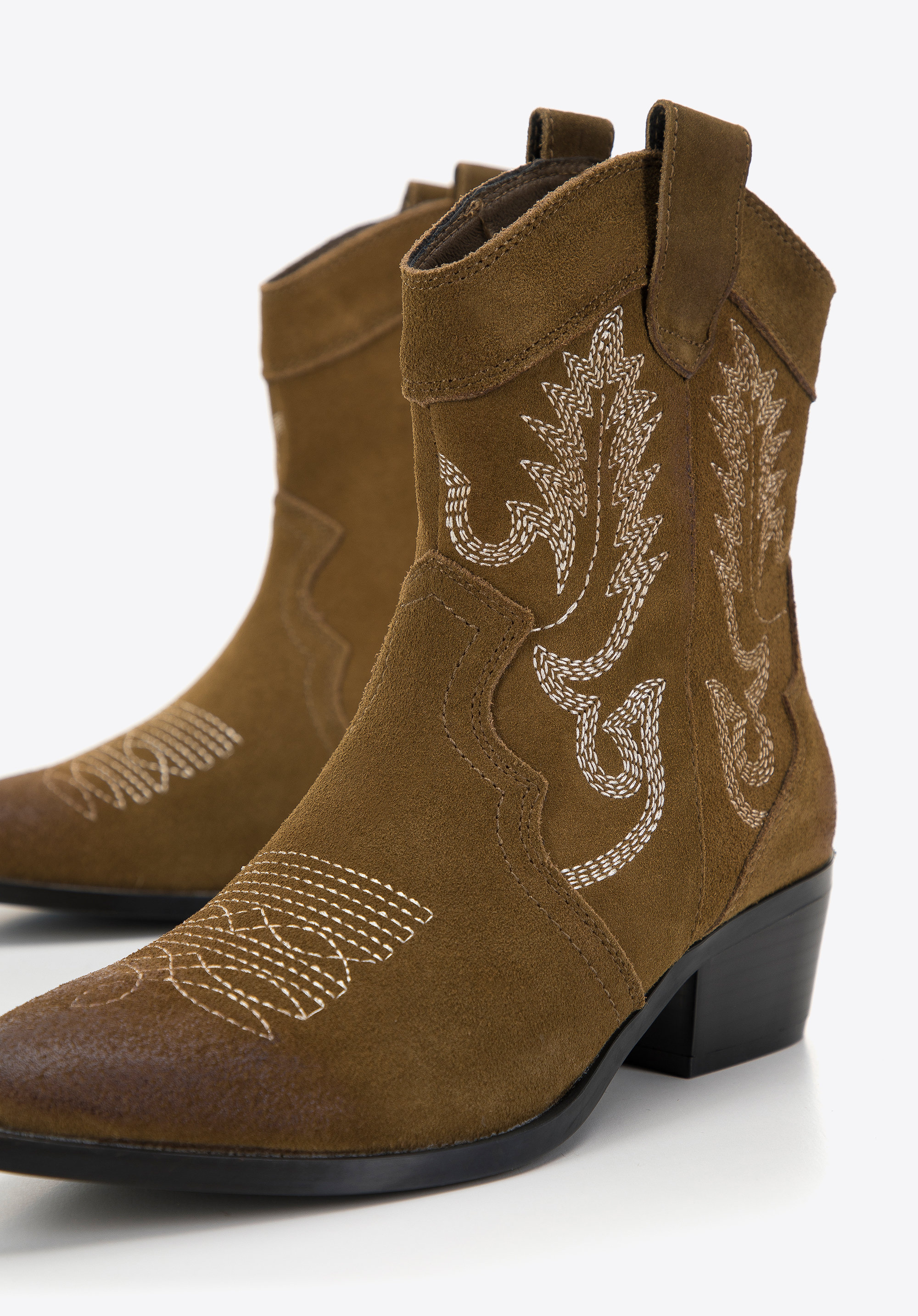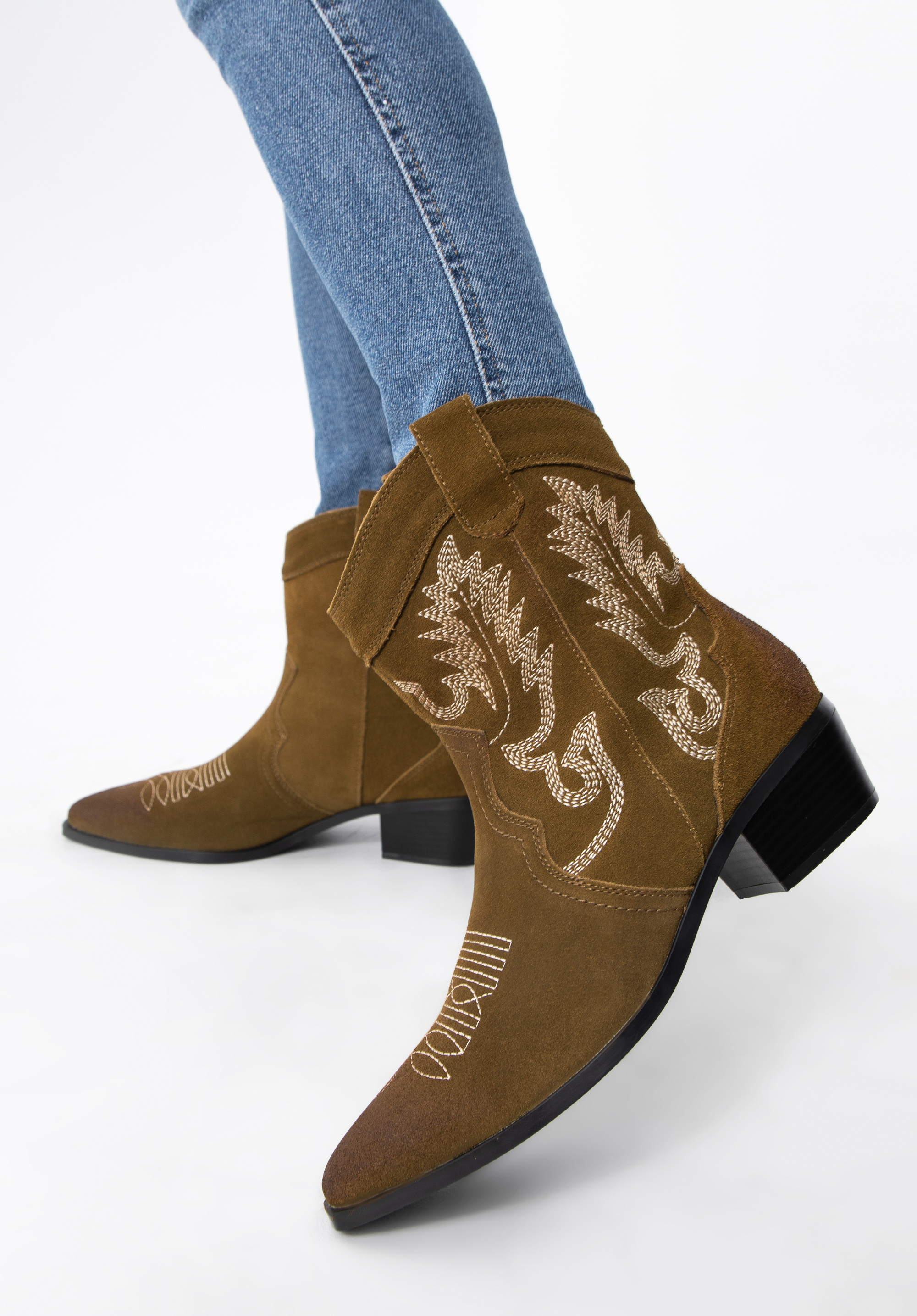 Ці стильні ковбойські чоботи припадуть до смаку любителям класики в сучасному відтінку. Вічний дизайн збагачений оригінальною вишивкою, видимою як на верху, так і на носку взуття. Низький каблук додасть кілька сантиметрів до вашого зросту, а гострий носок зробить вашу ногу стрункішою. Носіть їх під улюблену сукню в стилі бохо або поєднуйте з джинсами та довгим осіннім пальто. Жіночі короткі замшеві ковбойські чоботи з вишивкою можна носити як взаємозамінні з улюбленими ботильйонами, вони додадуть характеру будь-якому вашому стилю.