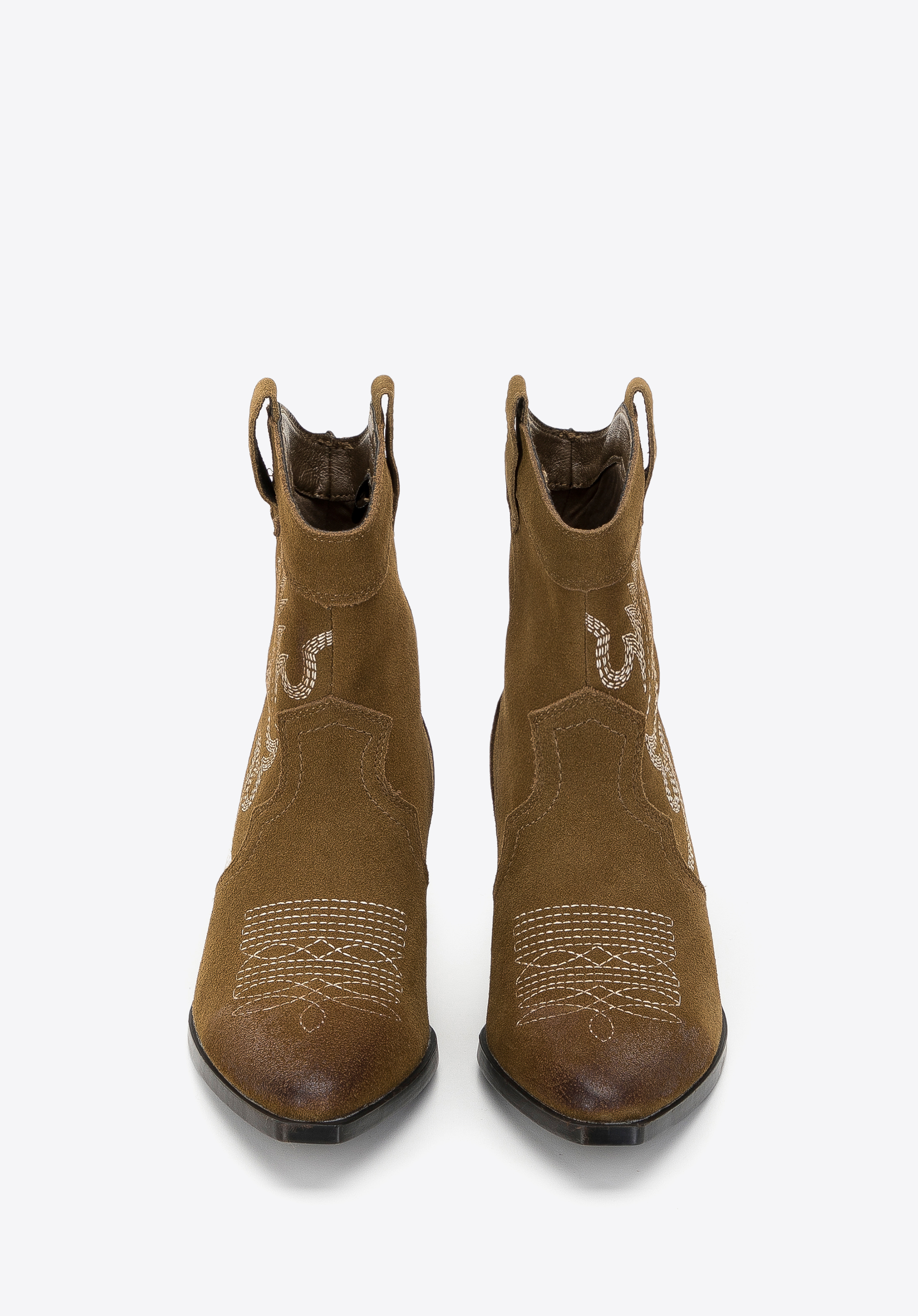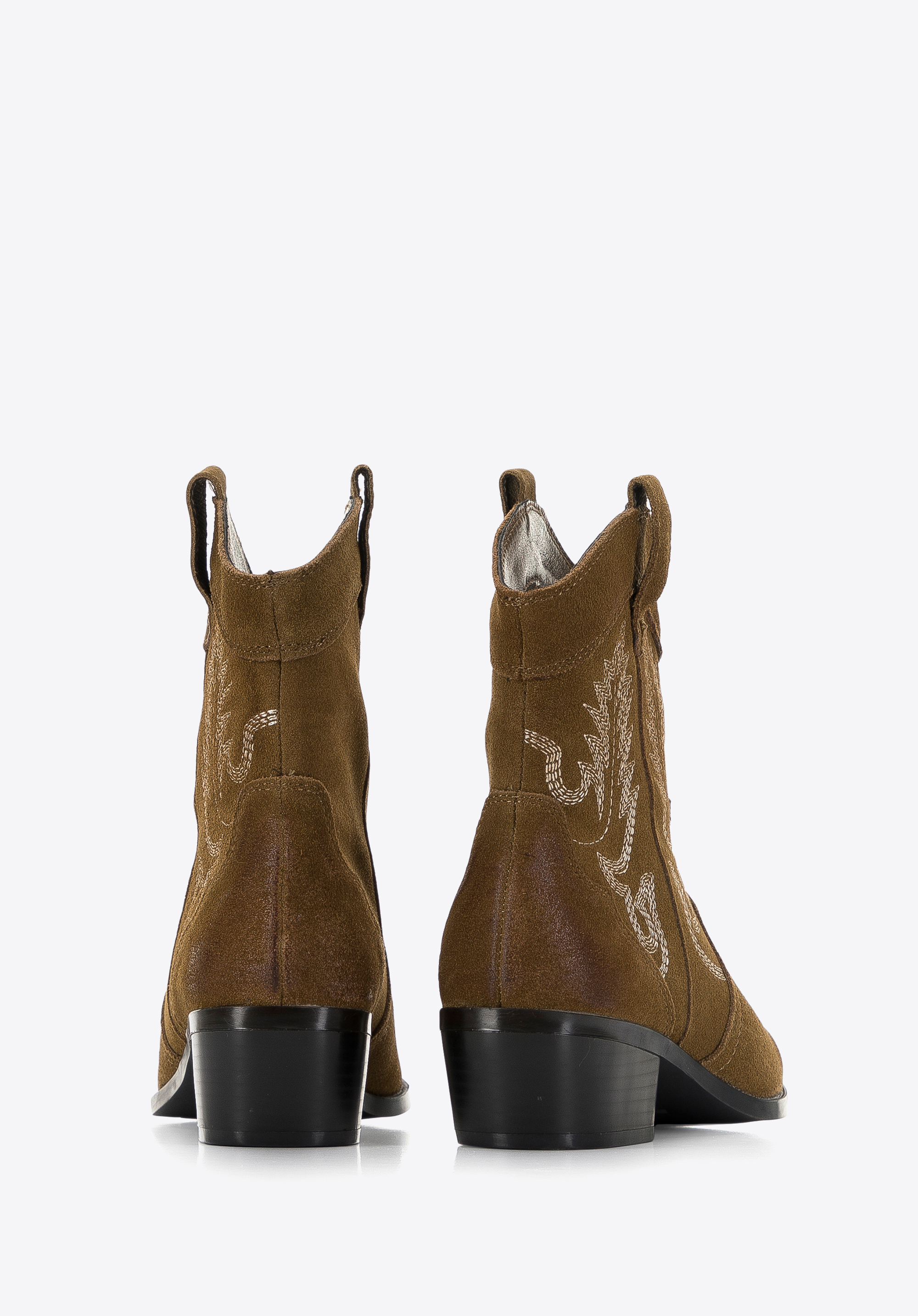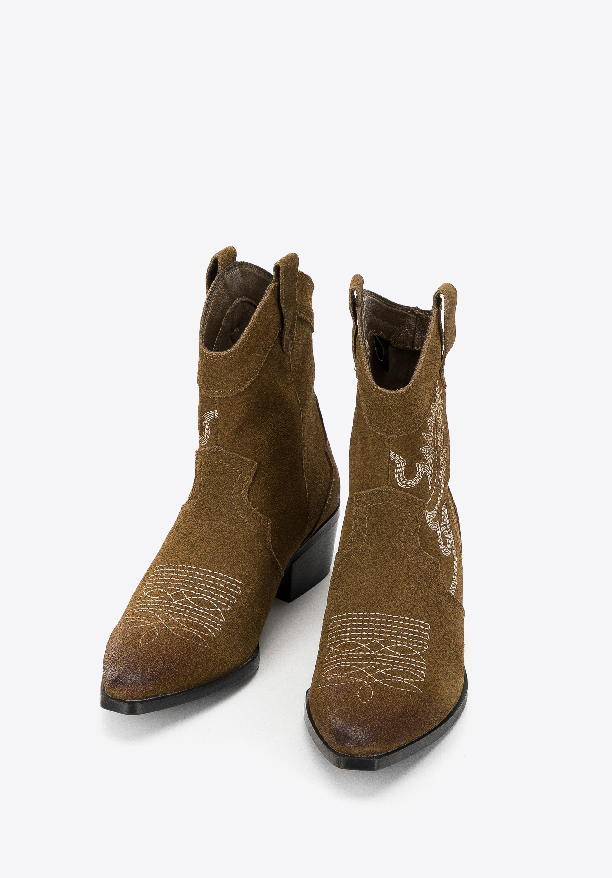 Ці стильні ковбойські чоботи припадуть до смаку любителям класики в сучасному відтінку. Вічний дизайн збагачений оригінальною вишивкою, видимою як на верху, так і на носку взуття. Низький каблук додасть кілька сантиметрів до вашого зросту, а гострий носок зробить вашу ногу стрункішою. Носіть їх під улюблену сукню в стилі бохо або поєднуйте з джинсами та довгим осіннім пальто. Жіночі короткі замшеві ковбойські чоботи з вишивкою можна носити як взаємозамінні з улюбленими ботильйонами, вони додадуть характеру будь-якому вашому стилю.