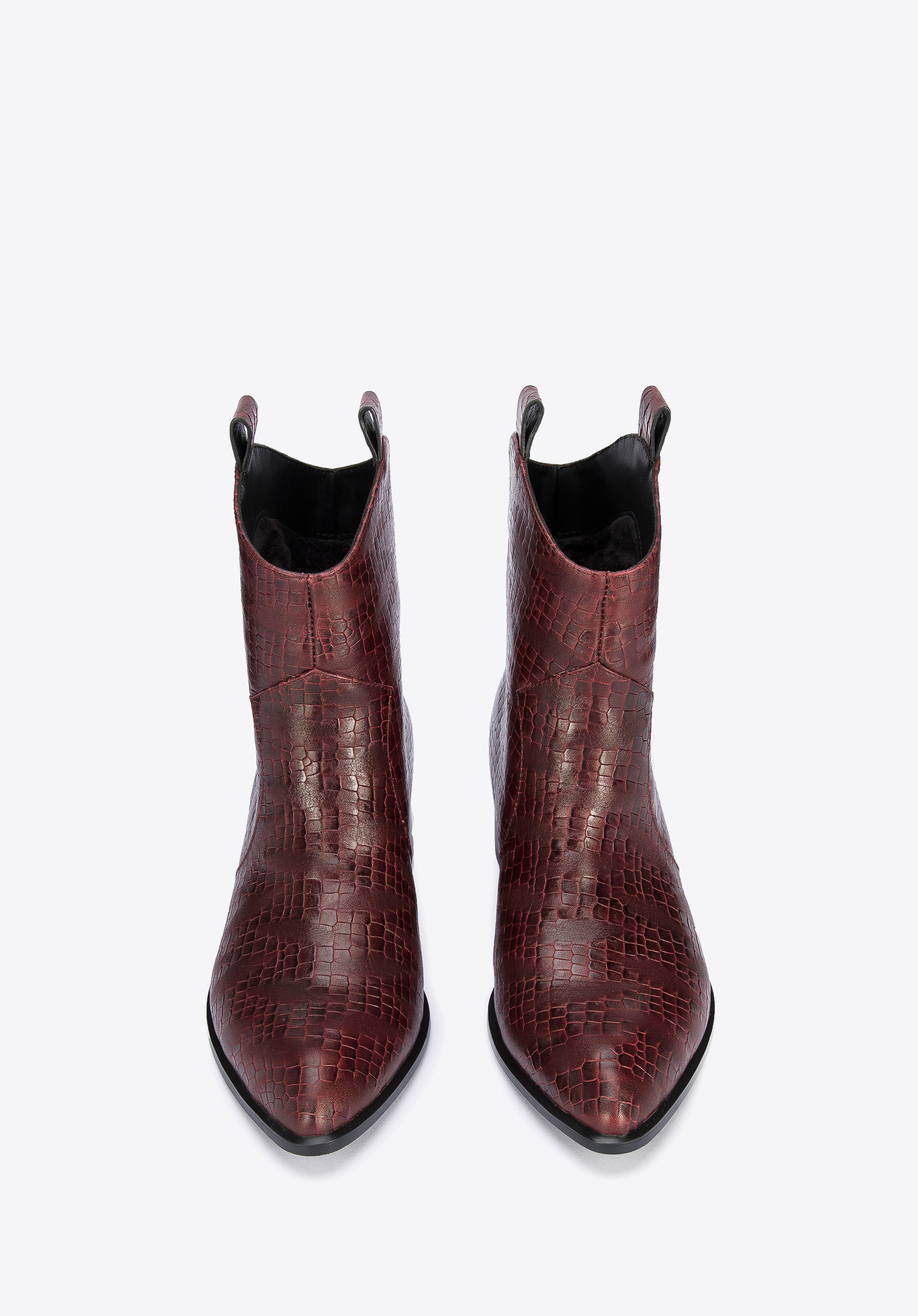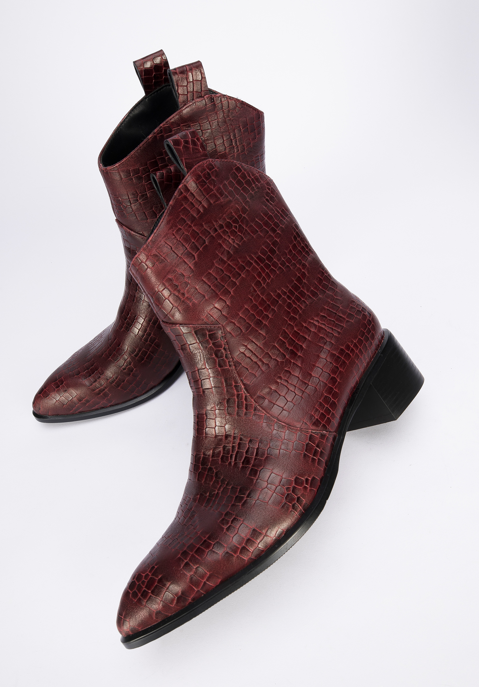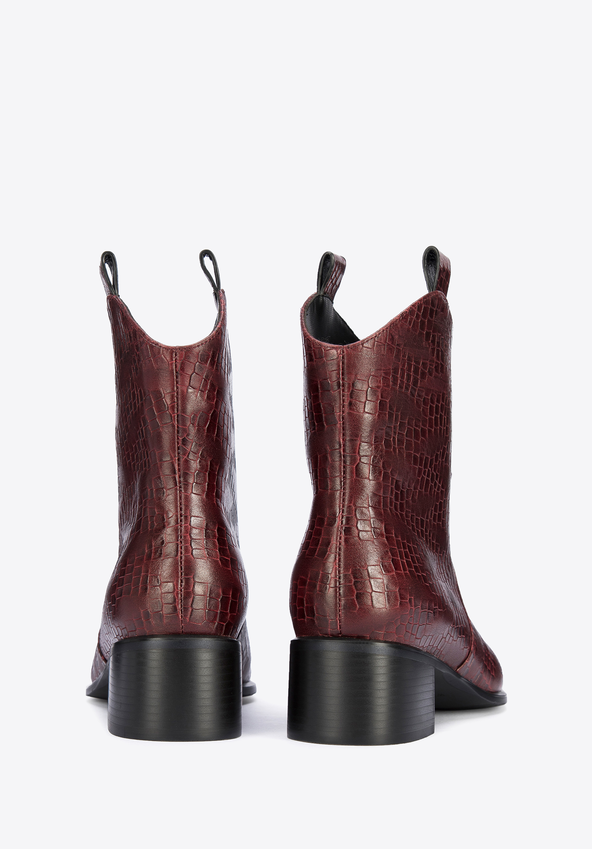 Ці стильні ковбойські чоботи підкреслять багато стилів, як з брюками, так і з сукнями. Вони мають загострений носок і середній каблук, який трохи виступає за контури взуття, тому в них можна комфортно ходити майже весь день. Виготовлені з високоякісної натуральної шкіри з текстурою croco з делікатними потертостями. Вони чудово виглядатимуть як з джинсами, так і з повсякденною сорочкою, а також зі шкіряним міні та футболкою. Жіночі ковбойські чоботи з шкіри croco - це стильний аксесуар, який можна носити кожен день.