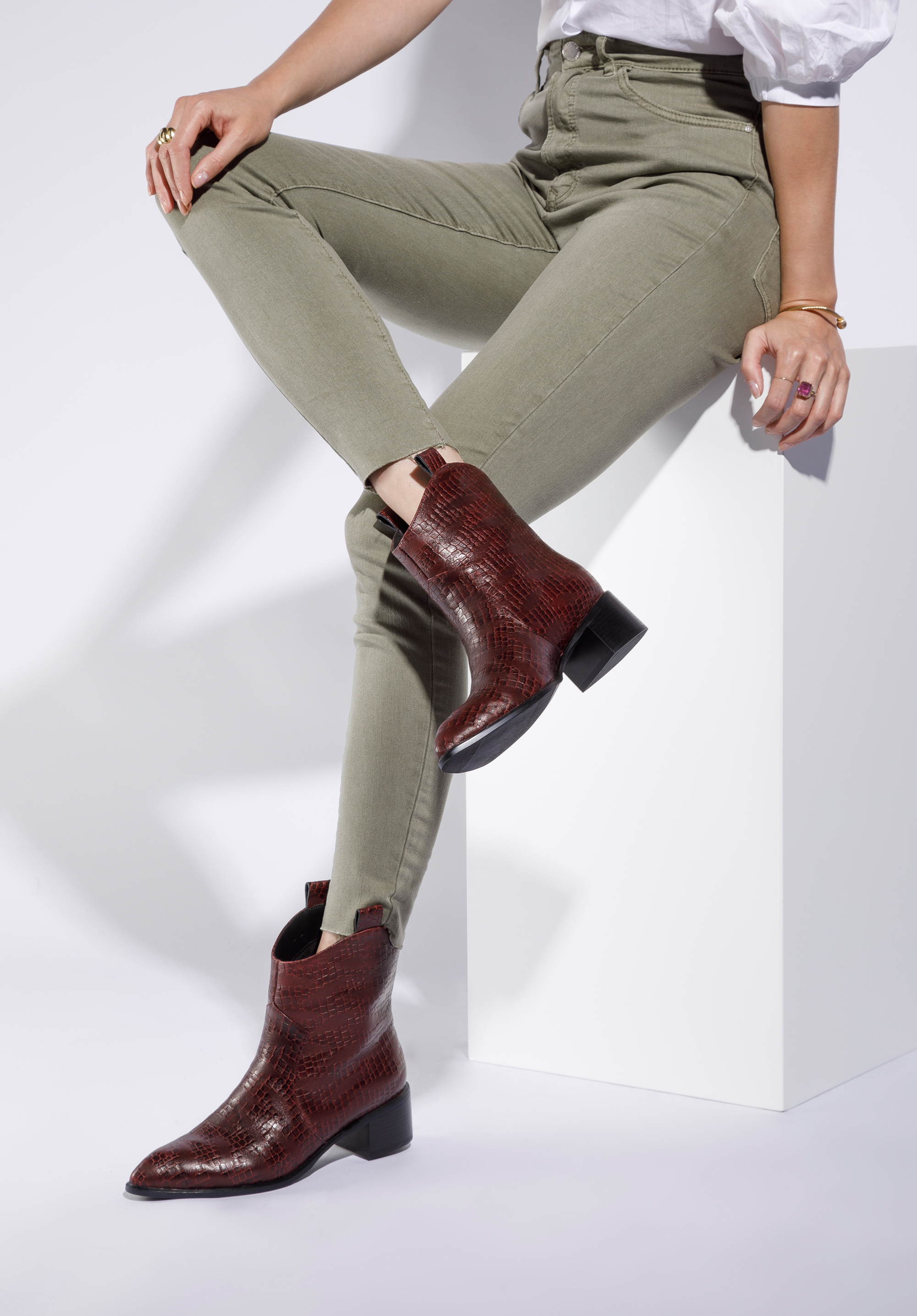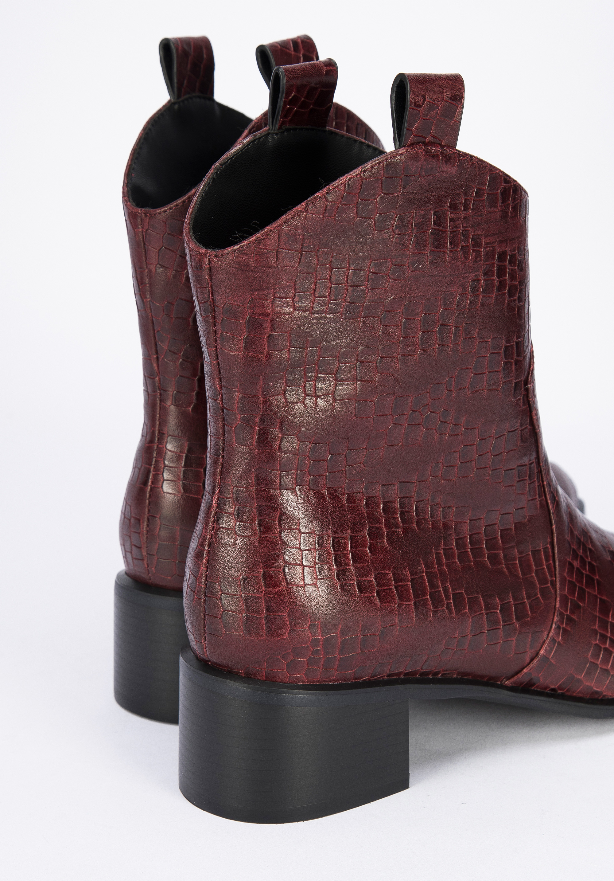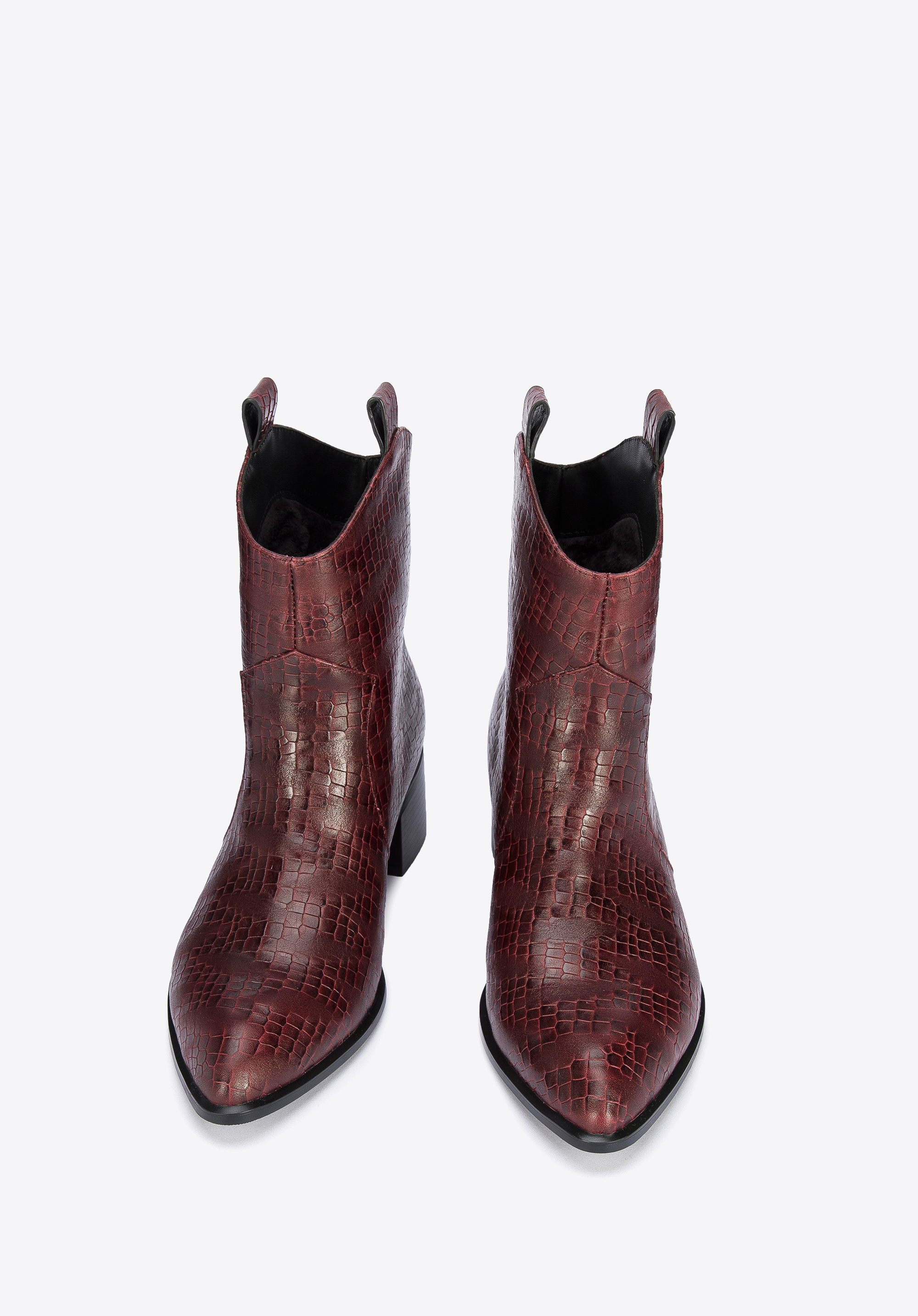 Ці стильні ковбойські чоботи підкреслять багато стилів, як з брюками, так і з сукнями. Вони мають загострений носок і середній каблук, який трохи виступає за контури взуття, тому в них можна комфортно ходити майже весь день. Виготовлені з високоякісної натуральної шкіри з текстурою croco з делікатними потертостями. Вони чудово виглядатимуть як з джинсами, так і з повсякденною сорочкою, а також зі шкіряним міні та футболкою. Жіночі ковбойські чоботи з шкіри croco - це стильний аксесуар, який можна носити кожен день.