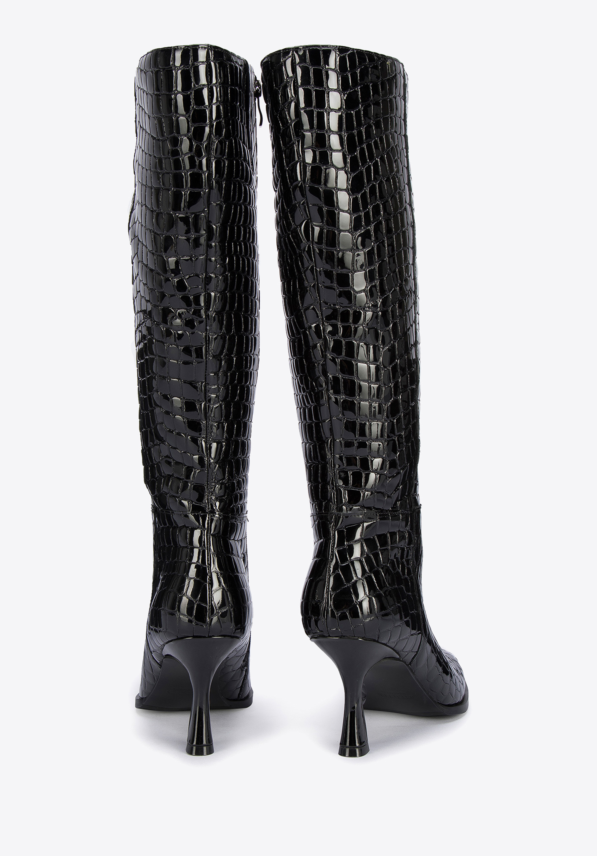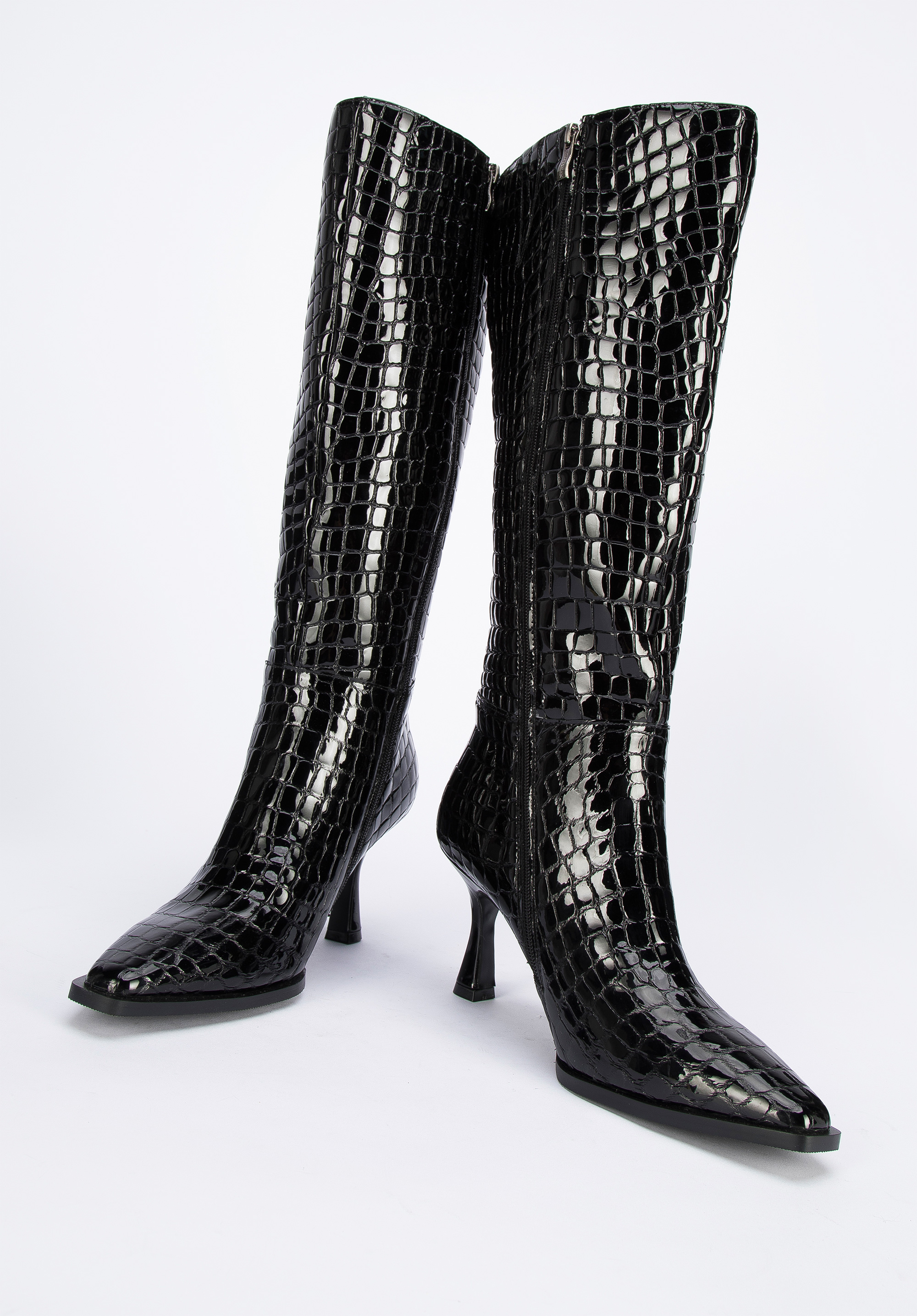 Жіночі козаки з лакованої шкіри croco на шпильці чорні