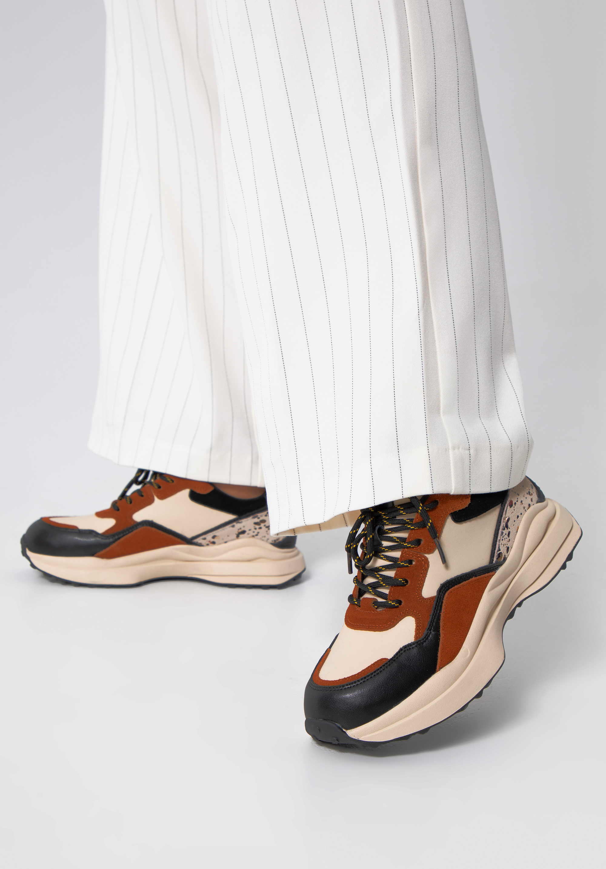 Ці стильні жіночі кросівки можна носити кожен день. Спортивний характер порушує декоративна блискуча вставка ззаду. Досить товста платформа додасть вашому зросту кілька сантиметрів, а завдяки шкіряній устілці ви зможете з комфортом ходити в них багато годин. Це взуття чудово виглядатимуть як зі спортивними фасонами, так і з улюбленою сукнею-кльош - вони модно доповнять ваш образ у будь-якій ситуації. Жіночі кросівки з блискучою вставкою можна одягати неодноразово, як на шопінг, так і на каву з подругою чи у подорож на вихідні.
