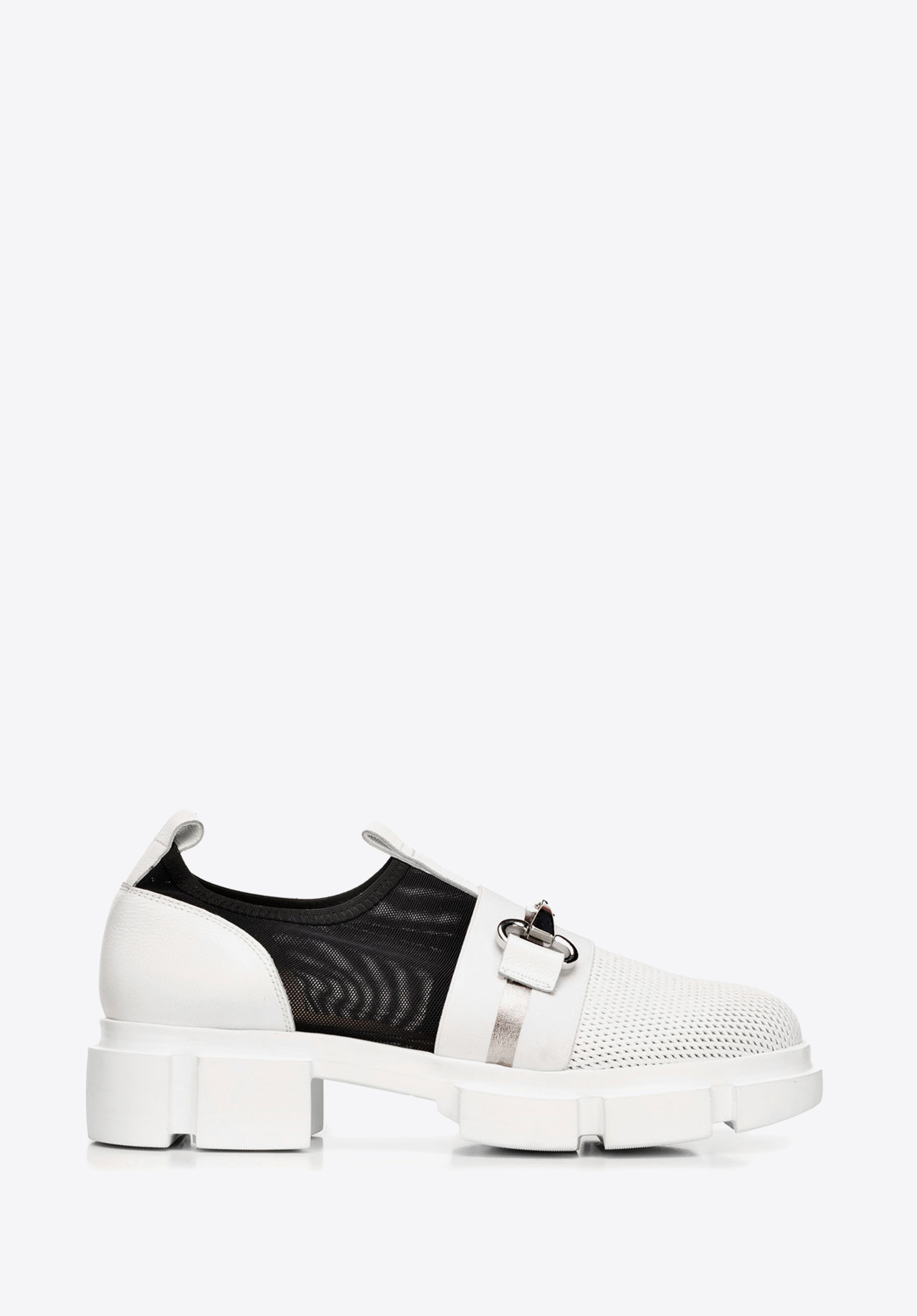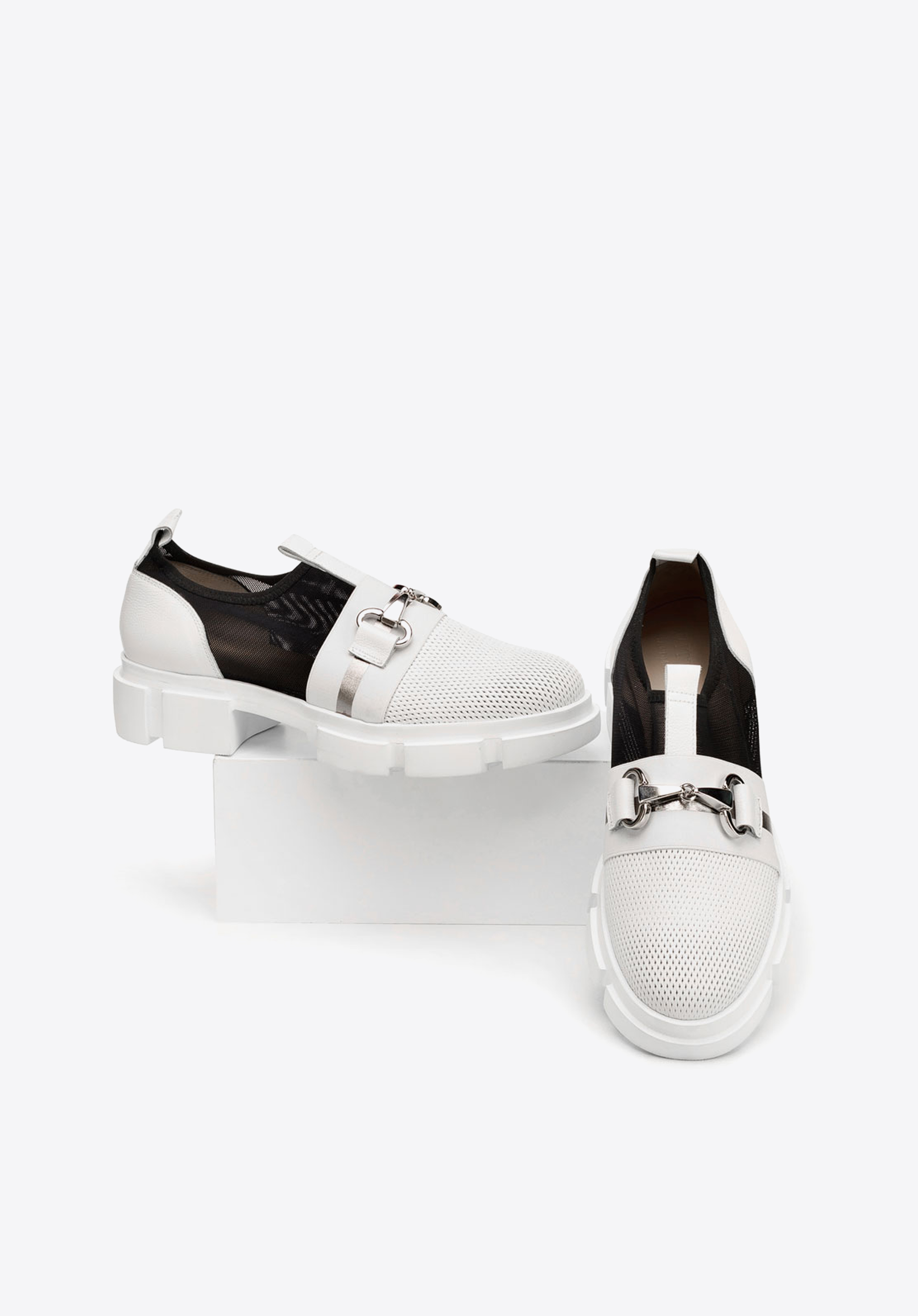 Шкіряні мокасини в абсолютно новому варіанті. Вони відносяться до класичних мокасин з невеликим орнаментом спереду. Тим не менш, у них дуже модна товста, хоча і легка і стійка, кремезна підошва, яка натякає на останні тенденції. Вони були зшиті в Італії з двох типів натуральної шкіри: спереду ажурної, а ззаду гладкої. Вони також мають модну напівпрозору сітку та широку гуму на середній частині стопи, додатково прикрашену срібною смужкою. Ці мокасини були зшиті в Італії з натуральної шкіри і ретельно оброблені вручну. Авангардний стиль взуття також підкреслює контрастні кольори. Поєднання білого, чорного і срібла виглядає дійсно свіжим і буде відповідати більшості кольорів. Шкіряні жіночі мокасини -цікавий аксесуар, який можна носити як з брюками, так і з сорочкою оверсайз, а також з приталеним платтям.