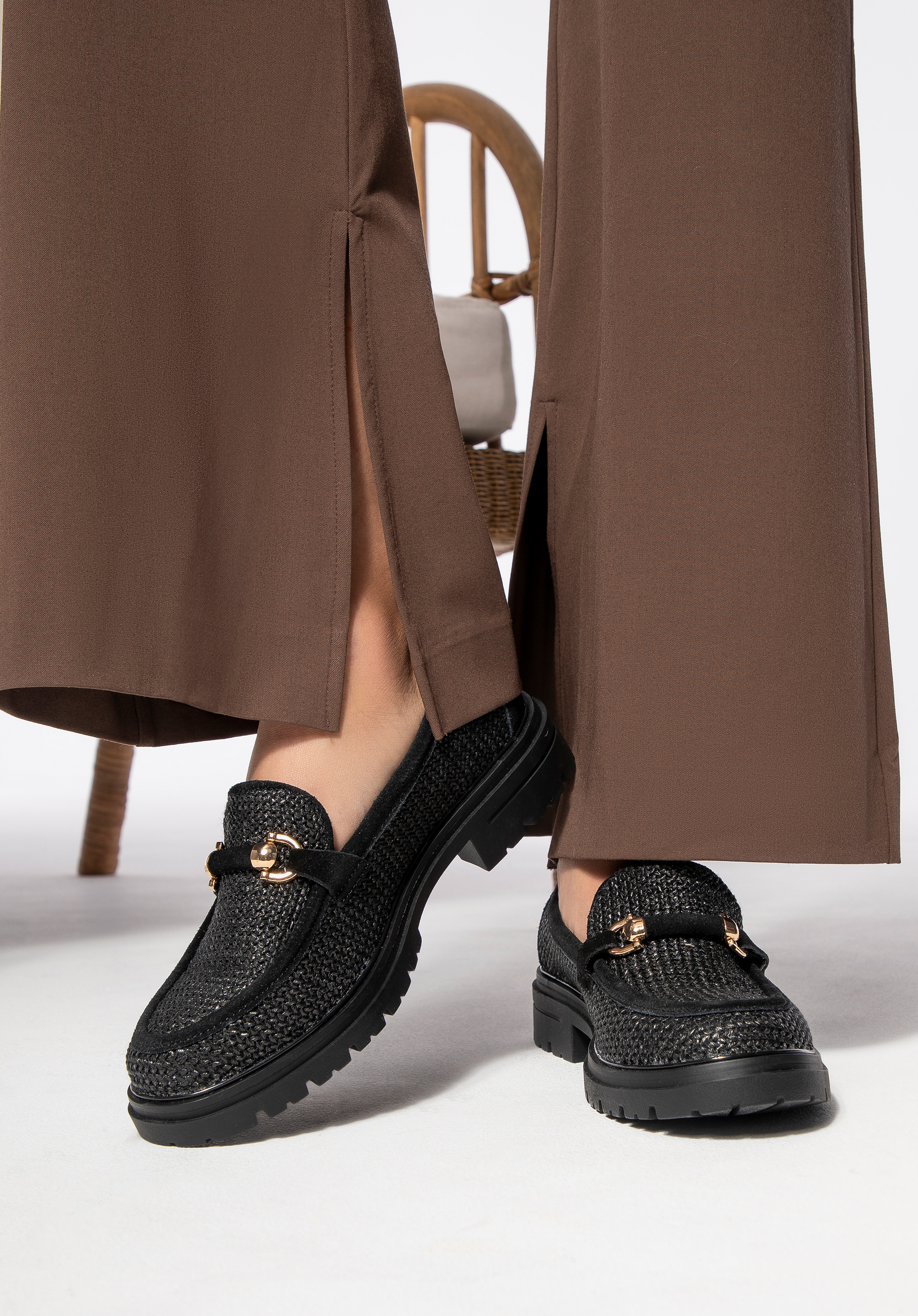 Підкресліть свій стиль мокасинами, що поєднують природну елегантність та сучасний дизайн. Модель, виготовлена зі штучної рафії та витонченої замшевої шкіри, вражає унікальним плетінням та декоративною пряжкою, що надає їй неповторного шикарного вигляду. Модель забезпечує комфорт, а платформа витончено витягує силует, пропонуючи стійкість і зручність.