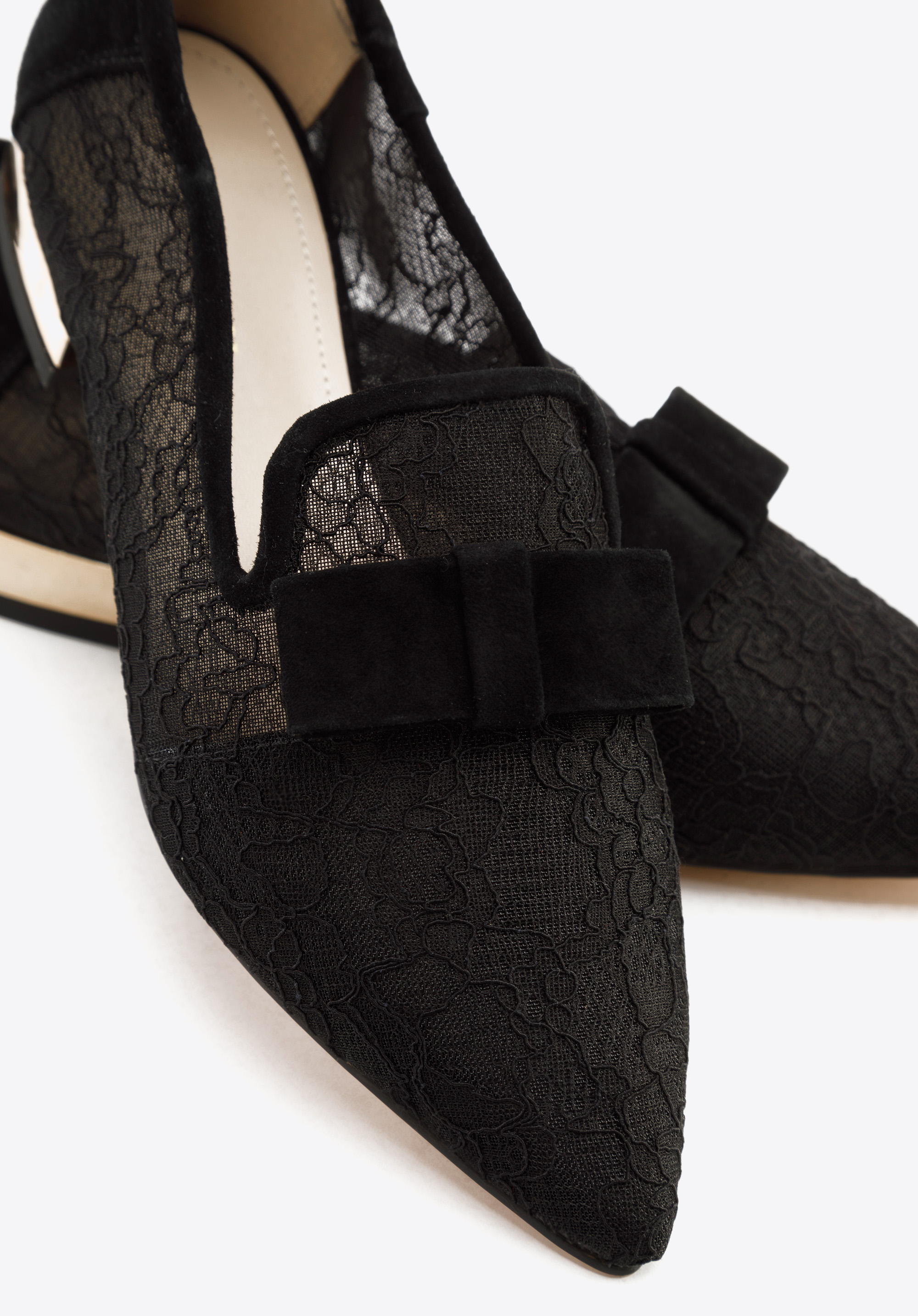 У цьому унікальному взутті ви привернете увагу багатьох. Вони виготовлені з прозорого матеріалу, що нагадує мереживо, а мінімалістичний замшевий бант елегантно доповнює все. Кінчик взуття додатково обшитий шкірою. Гострий носок витончить ногу, а низький зручний каблук золотого кольору додасть всьому гламуру. Носіть їх з улюбленою міні-сукнею або брюками чинос і сорочкою - ви будете виглядати особливо в будь-якій ситуації. Жіночі прозорі мокасини на невисокому каблуці - відмінний вибір для любительок модних аксесуарів.