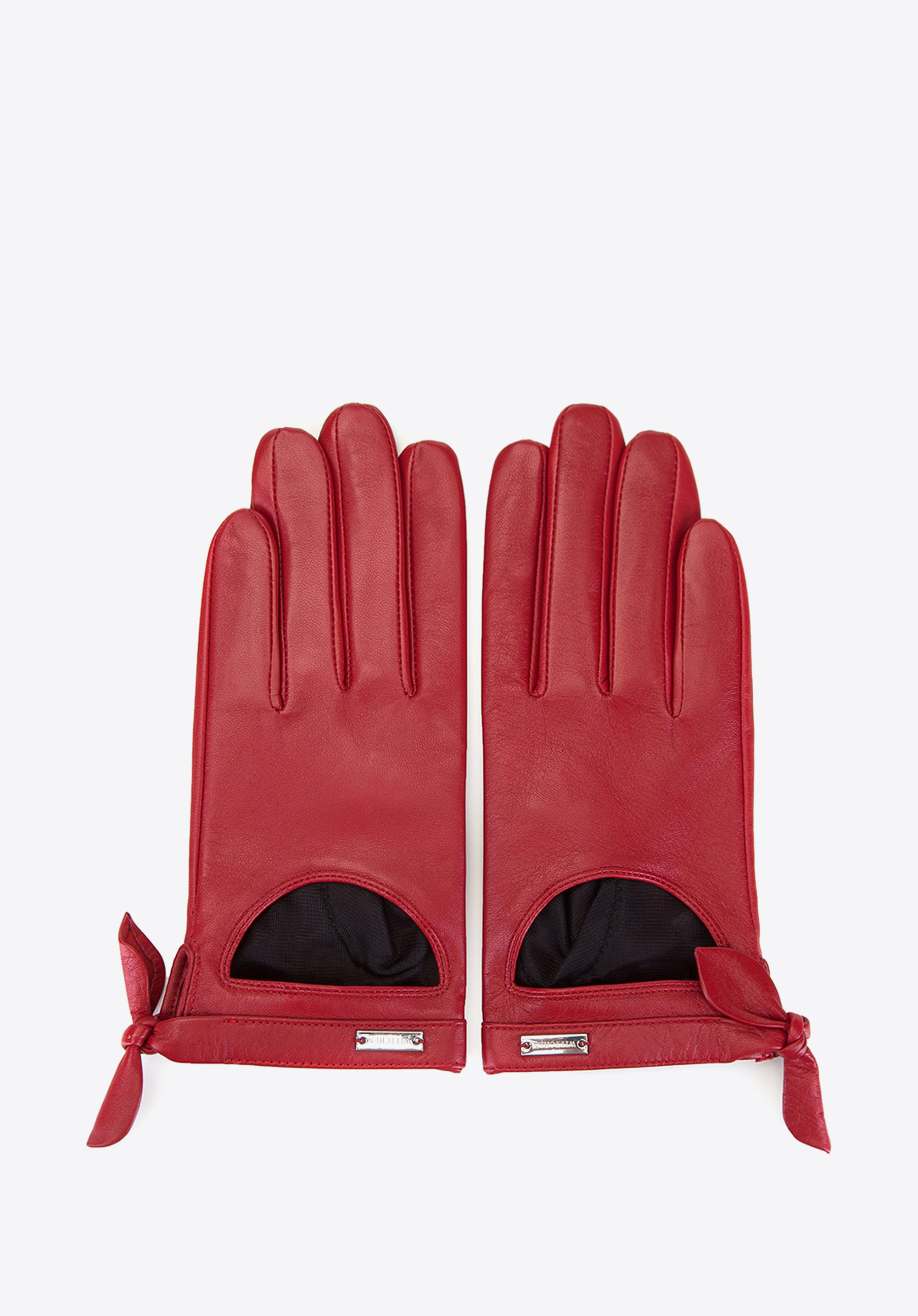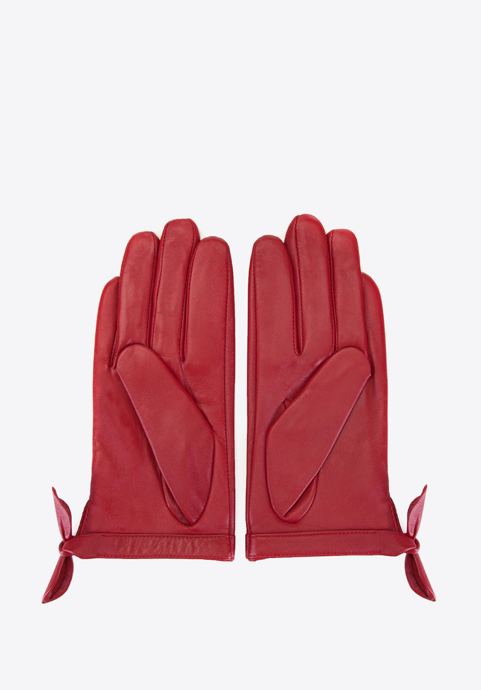 Жіночі рукавички, виконані з особливою ретельністю з овчини. Виріз і бант, зав''язаний на вузлі, надають моделі легкість і вишукану елегантність. Рукавички можна придбати в двох універсальних кольорах: чорному або червоному.