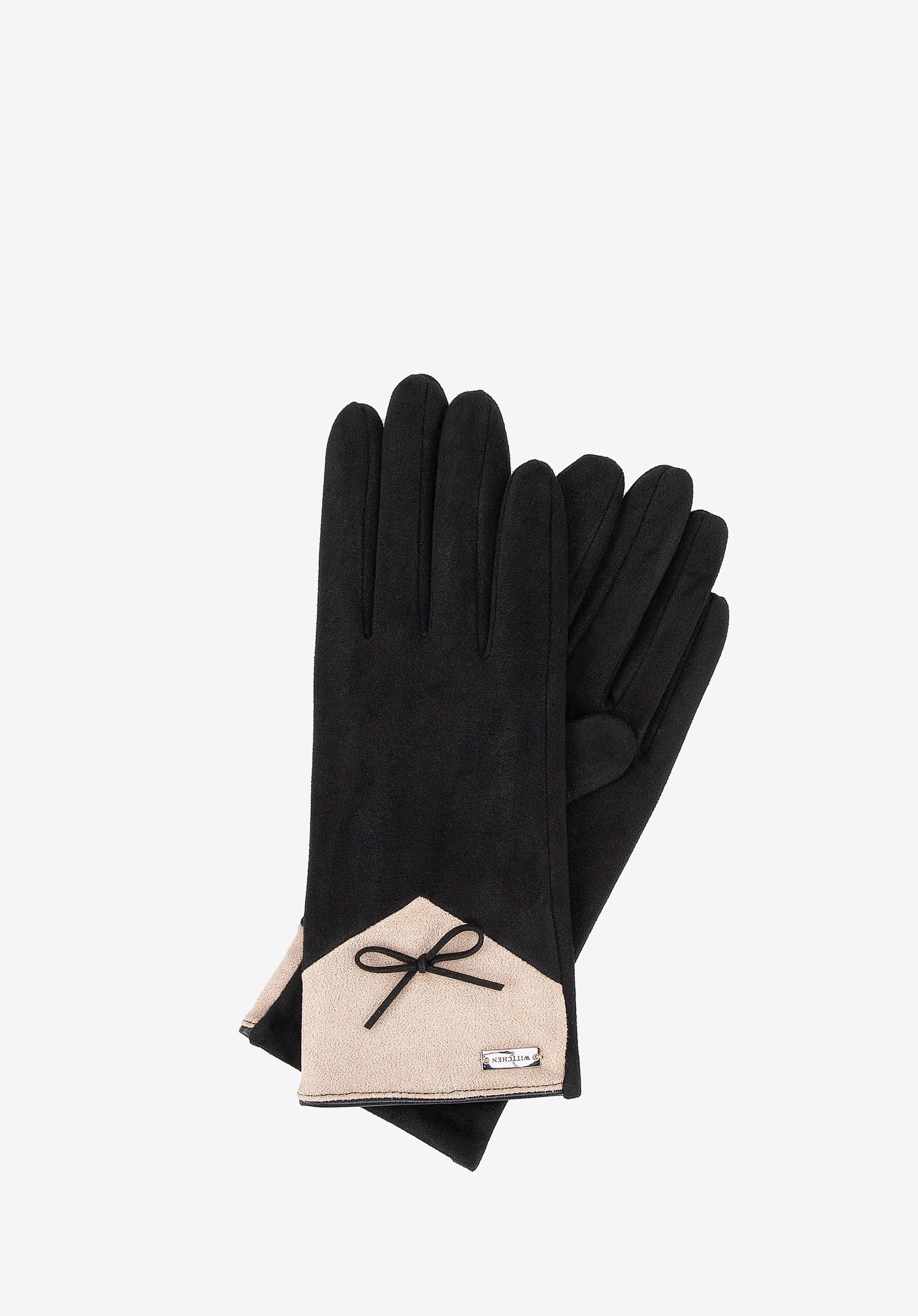 Ці елегантні жіночі рукавички втілюють витончений клас і функціональність. Виготовлені з ніжного, тонкого поліестеру, вони пропонують не тільки естетичний вигляд, але й винятковий комфорт. Гладка поверхня рукавичок приємна на дотик, завдяки чому їх зручно носити цілий день. Вони прикрашені елегантним бантом і контрастними кольорами, що надає їм вишуканий характер.