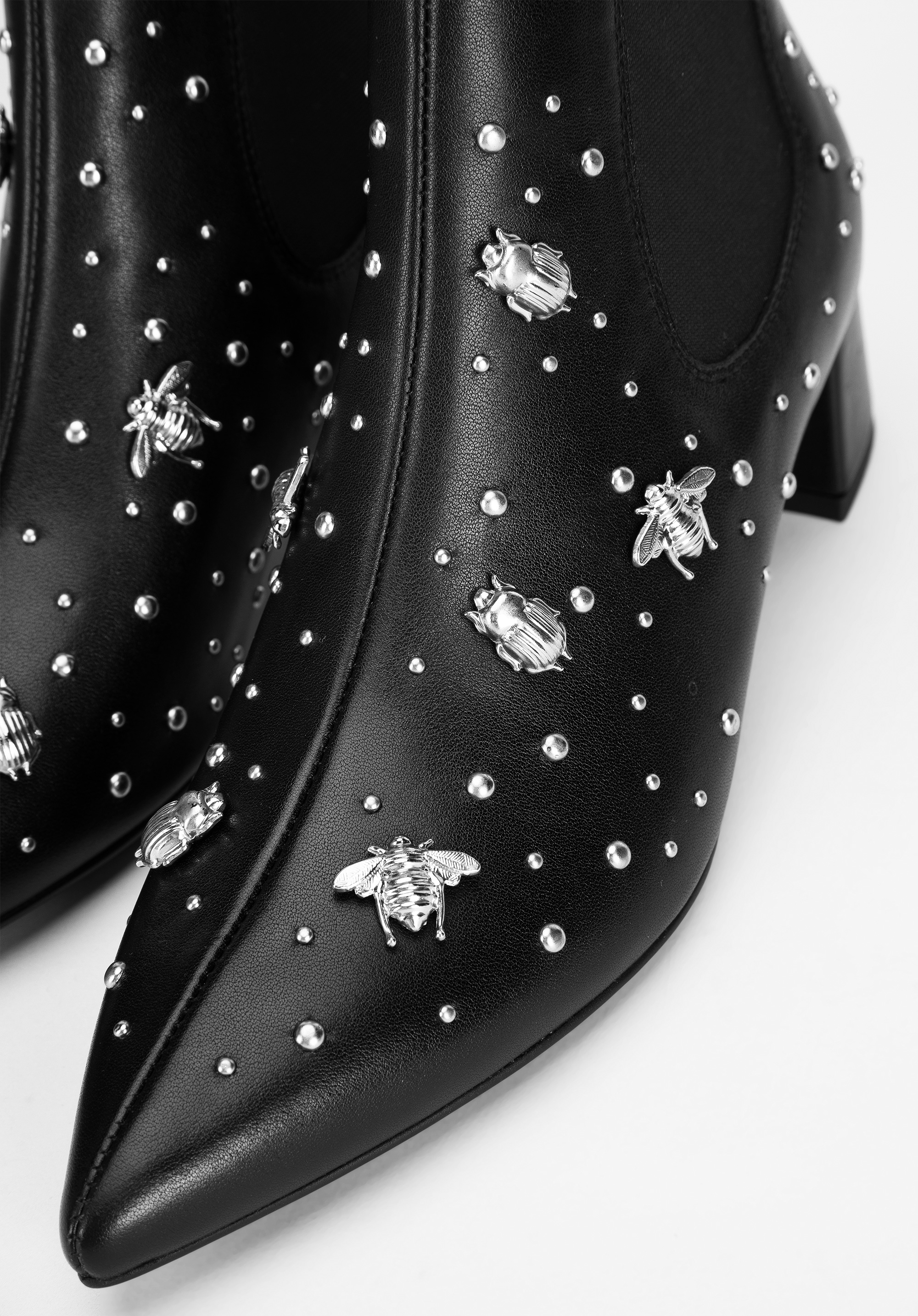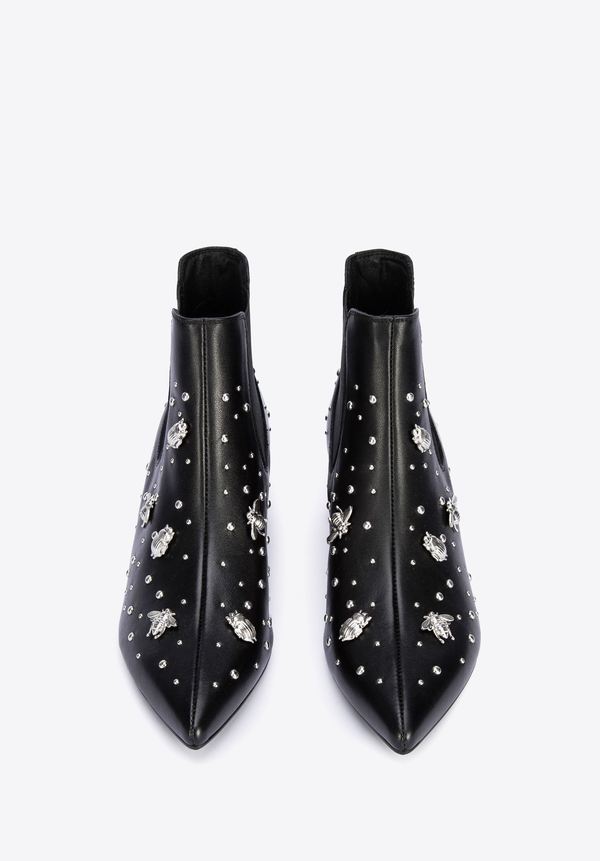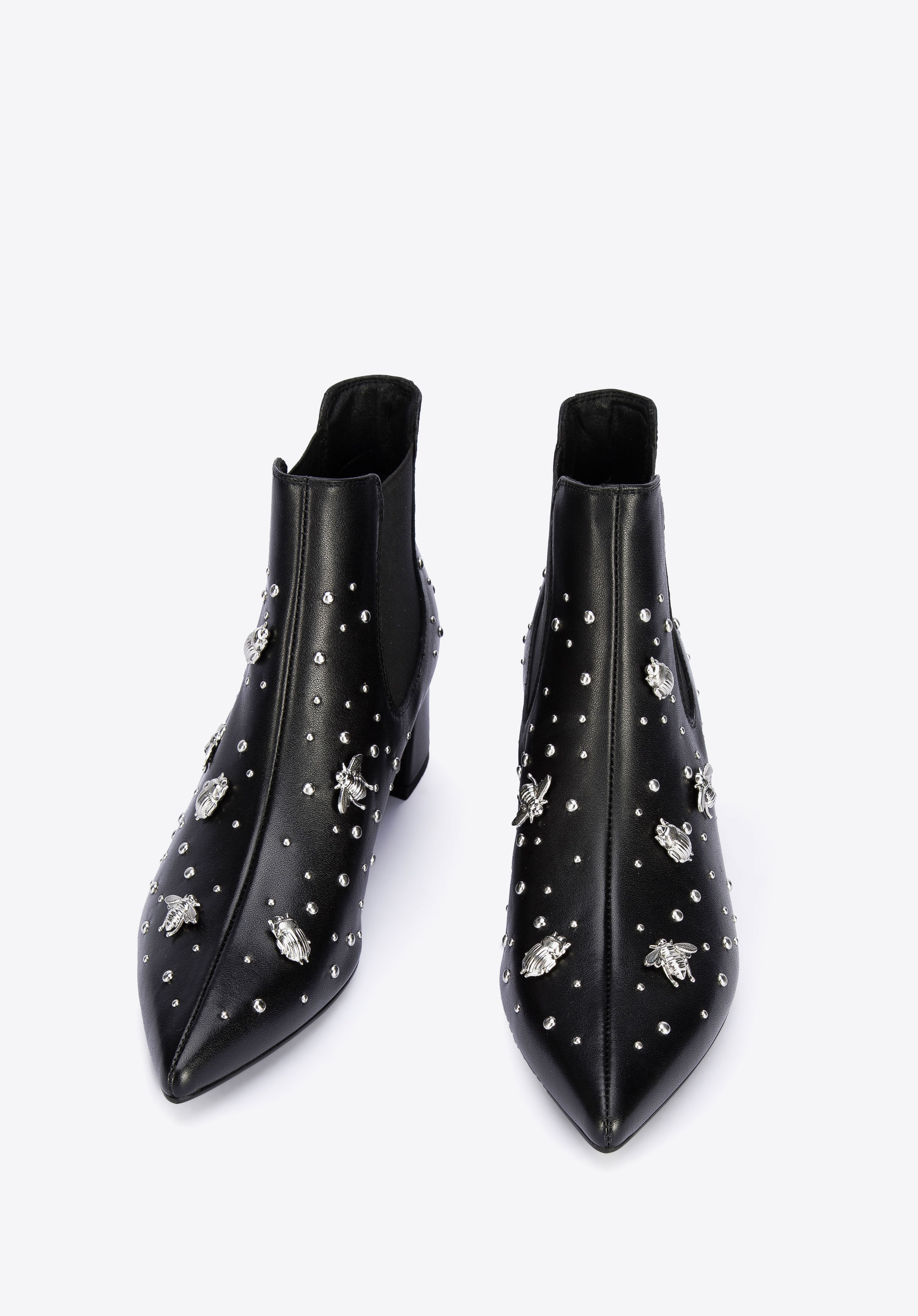 Ці черевики челсі сподобаються кожній жінці, яка любить сучасні аксесуари. Класичний дизайн, прикрашений шпильками у формі комах, приверне увагу багатьох. Взуття виготовлене з натуральної шкіри найвищої якості. Акуратний крій і загострений носок оптично стрункішають стопу. Завдяки еластичним вставкам з боків їх можна швидко і комфортно одягнути. Жіночі шкіряні чоботи з шпильками у вигляді комах - оригінальний аксесуар у гардеробі кожної жінки: їх можна підібрати до вузьких брюк і сорочки, а для особливих випадків підкреслити чорну сукню.