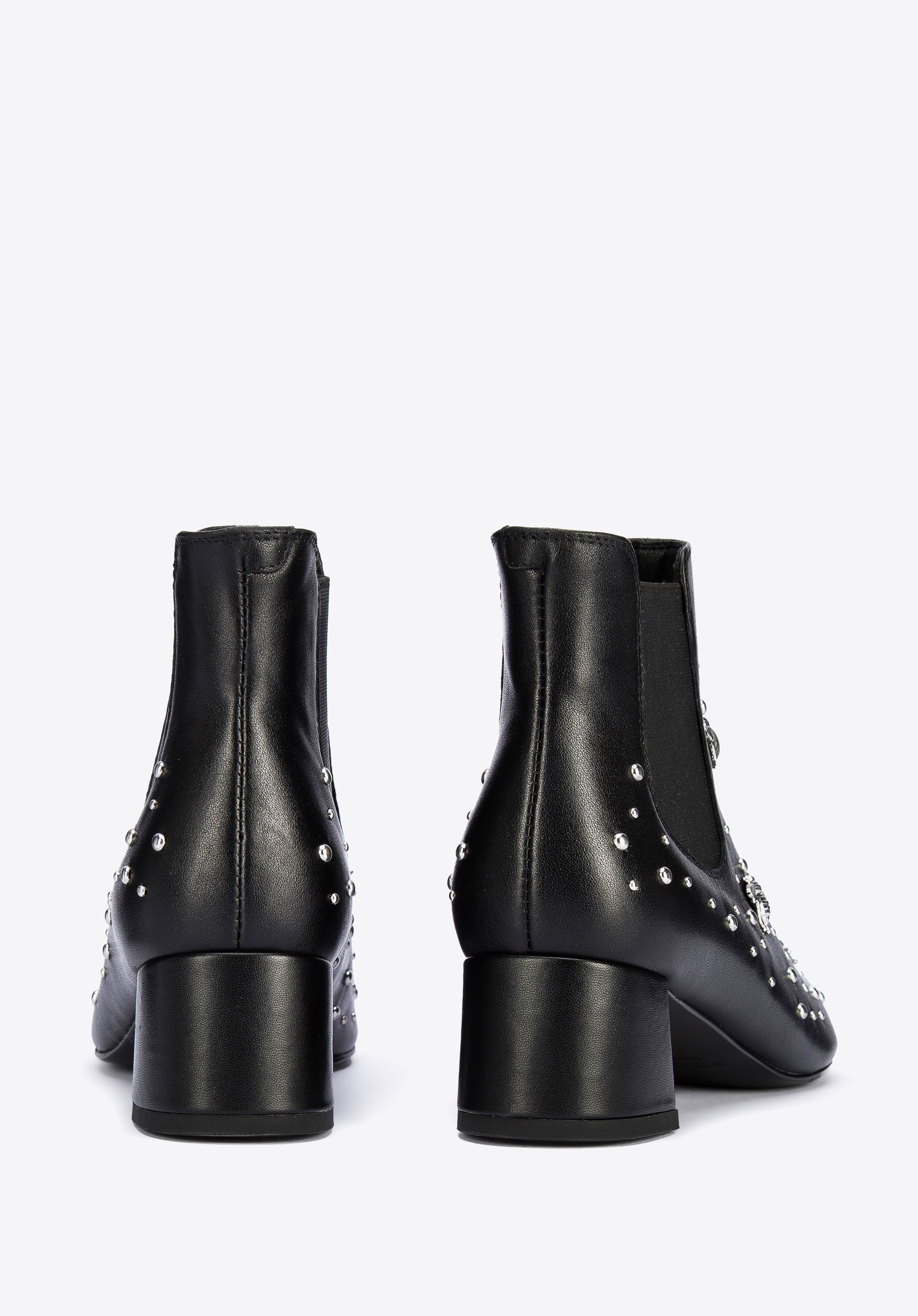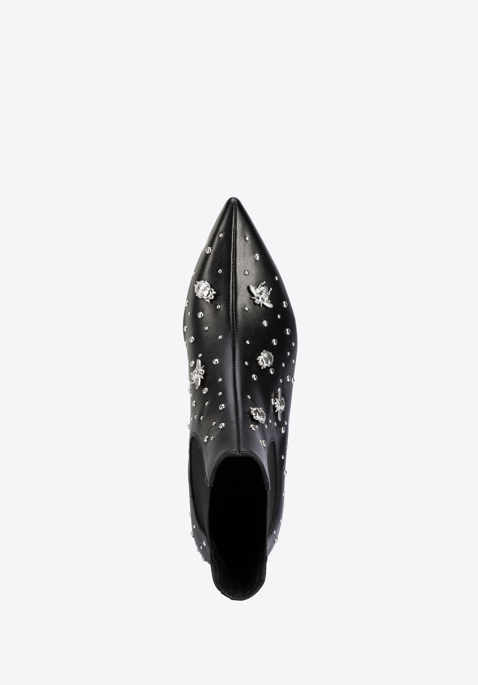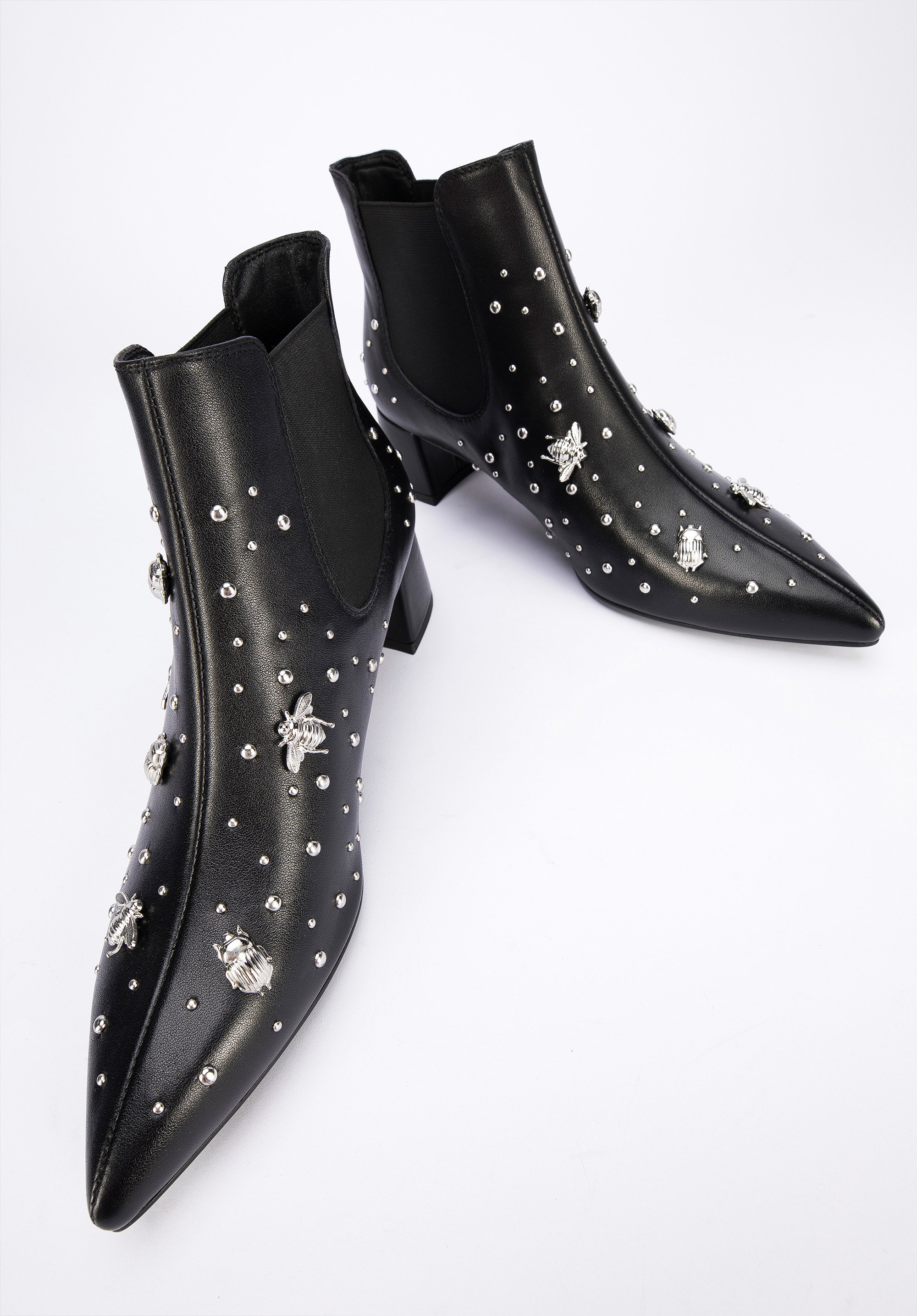 Ці черевики челсі сподобаються кожній жінці, яка любить сучасні аксесуари. Класичний дизайн, прикрашений шпильками у формі комах, приверне увагу багатьох. Взуття виготовлене з натуральної шкіри найвищої якості. Акуратний крій і загострений носок оптично стрункішають стопу. Завдяки еластичним вставкам з боків їх можна швидко і комфортно одягнути. Жіночі шкіряні чоботи з шпильками у вигляді комах - оригінальний аксесуар у гардеробі кожної жінки: їх можна підібрати до вузьких брюк і сорочки, а для особливих випадків підкреслити чорну сукню.