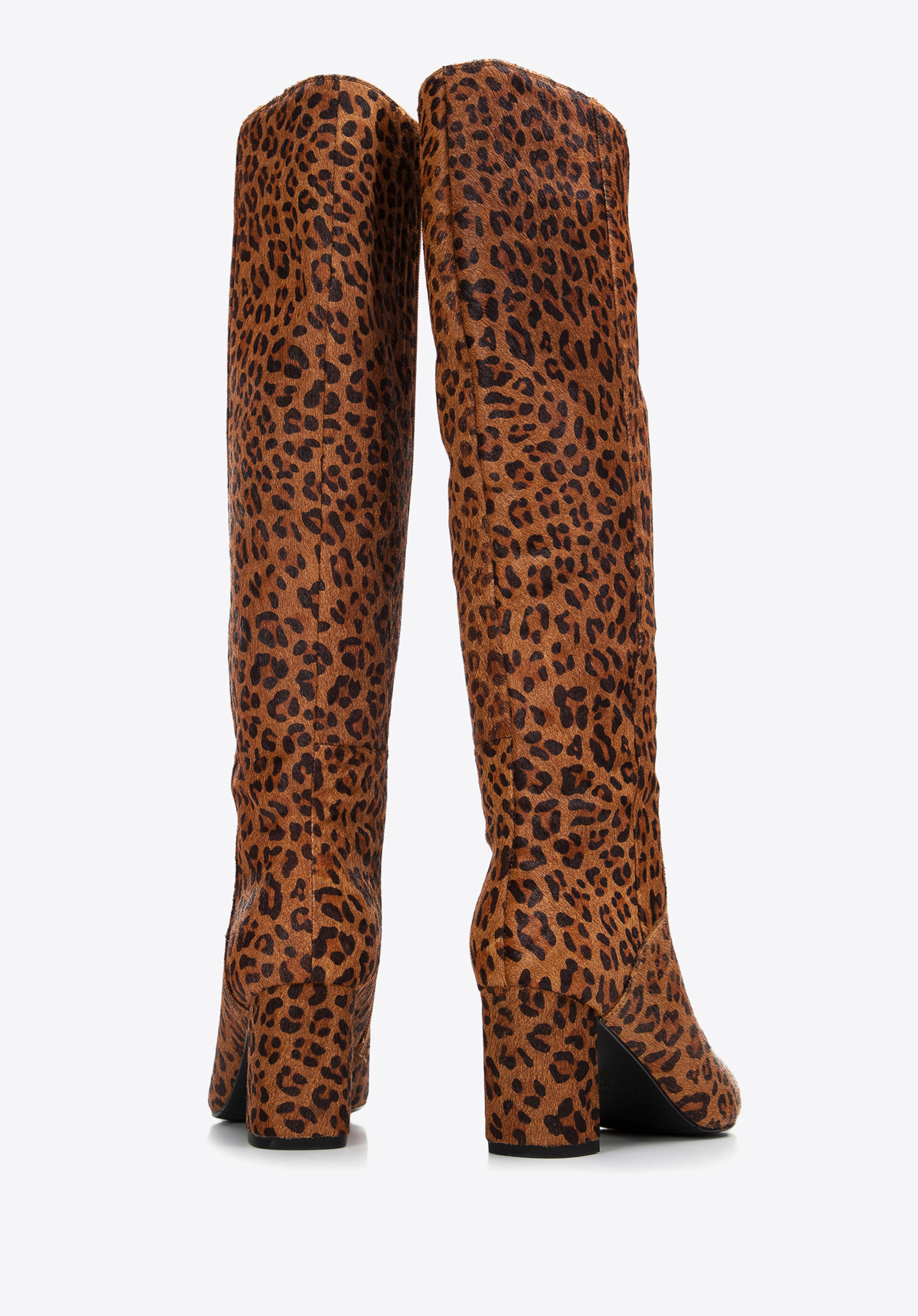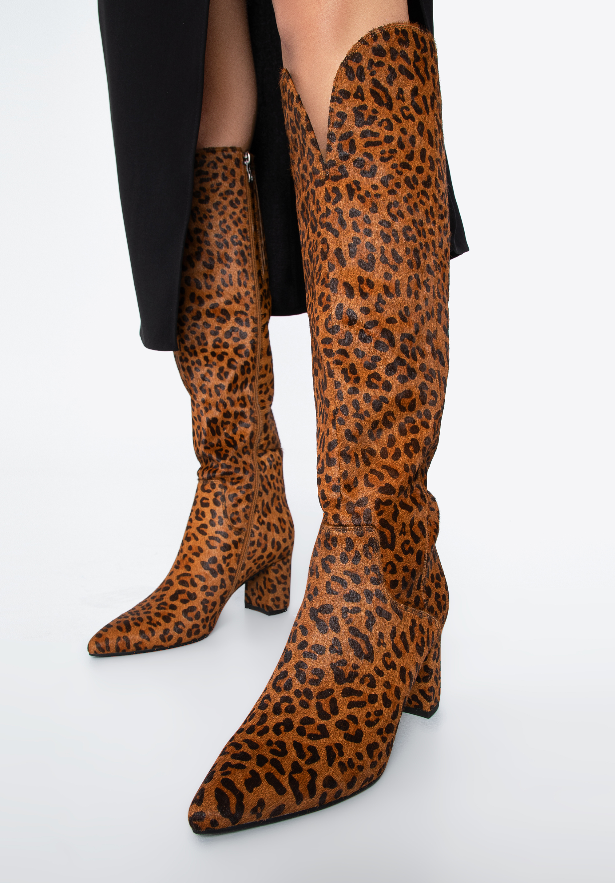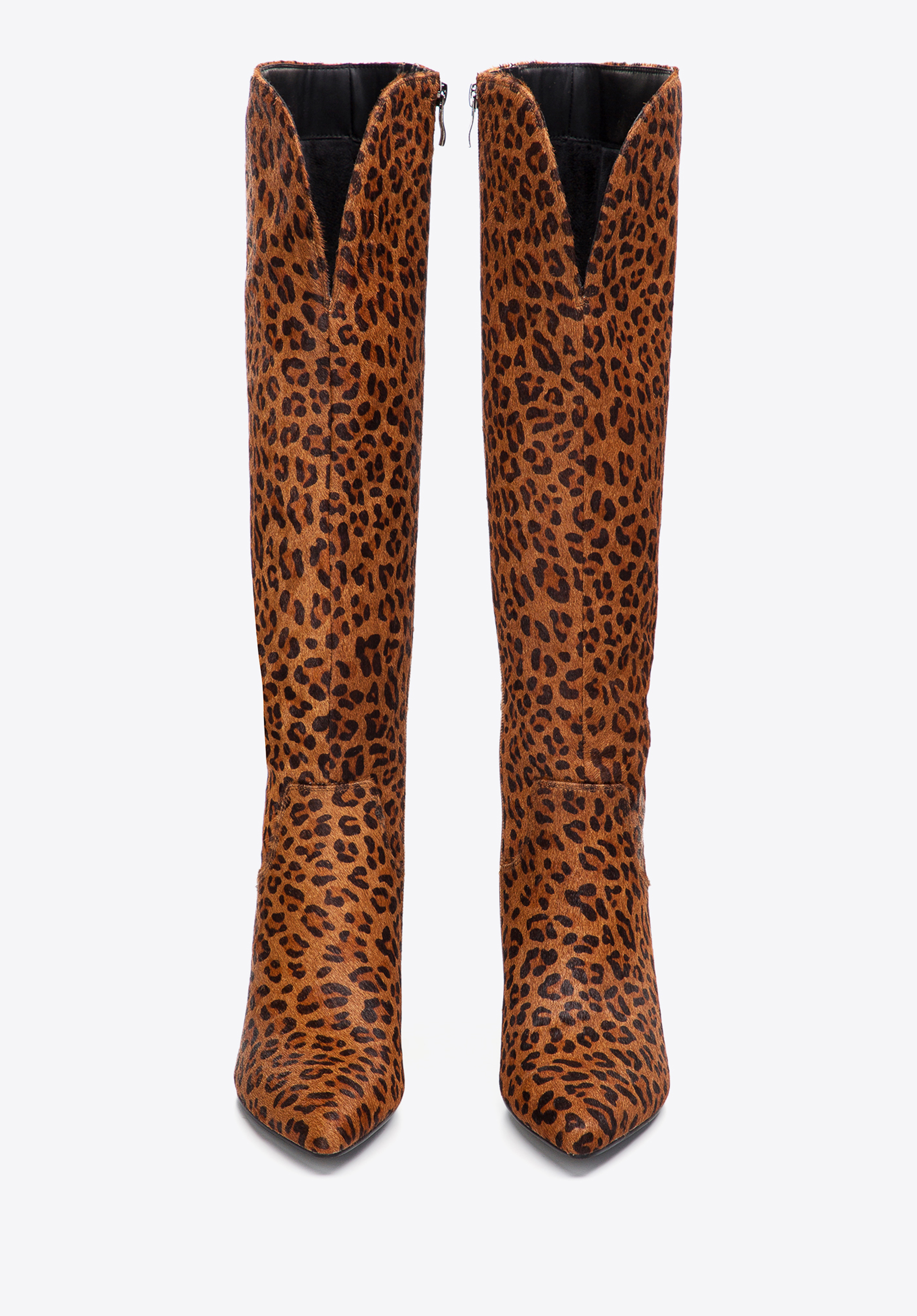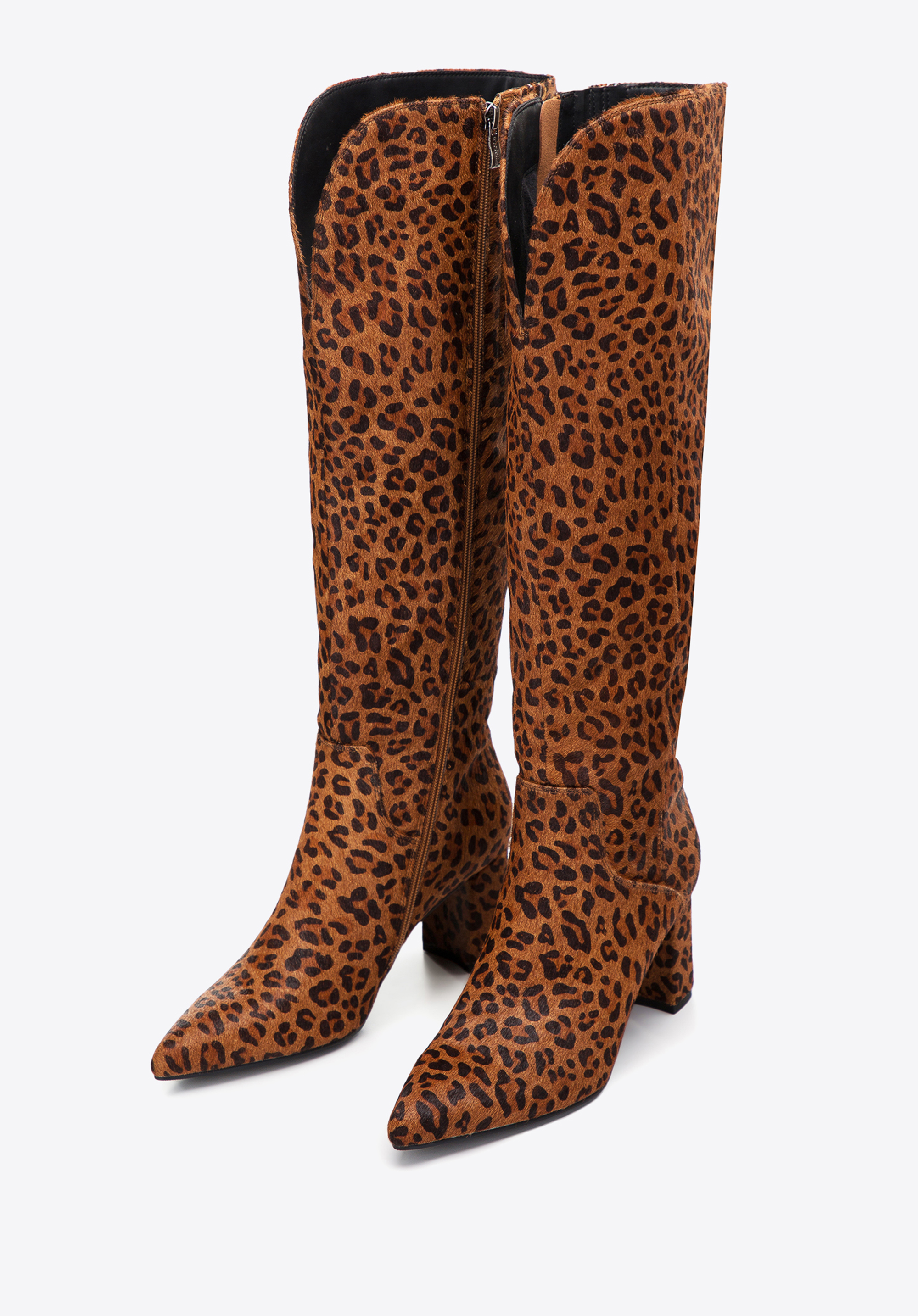 У цьому взутті ви не залишитеся непоміченою. Вони виготовлені з високоякісної шкіри з ворсом у модний тваринний візерунок. Вгорі є V-подібний виріз для підкреслення литки. Чоботи мають акуратний загострений носок і зручний каблук, який додасть кілька сантиметрів до вашого зросту. Зсередини є блискавка, тому їх буде легше одягати і знімати. Ця модель урізноманітнює комплект із класичним тренчем, а жіночій міні-сукні додасть вишуканості. Жіночі шкіряні чоботи зі звіриним візерунком - відмінний вибір для любительок аксесуарів з характером.