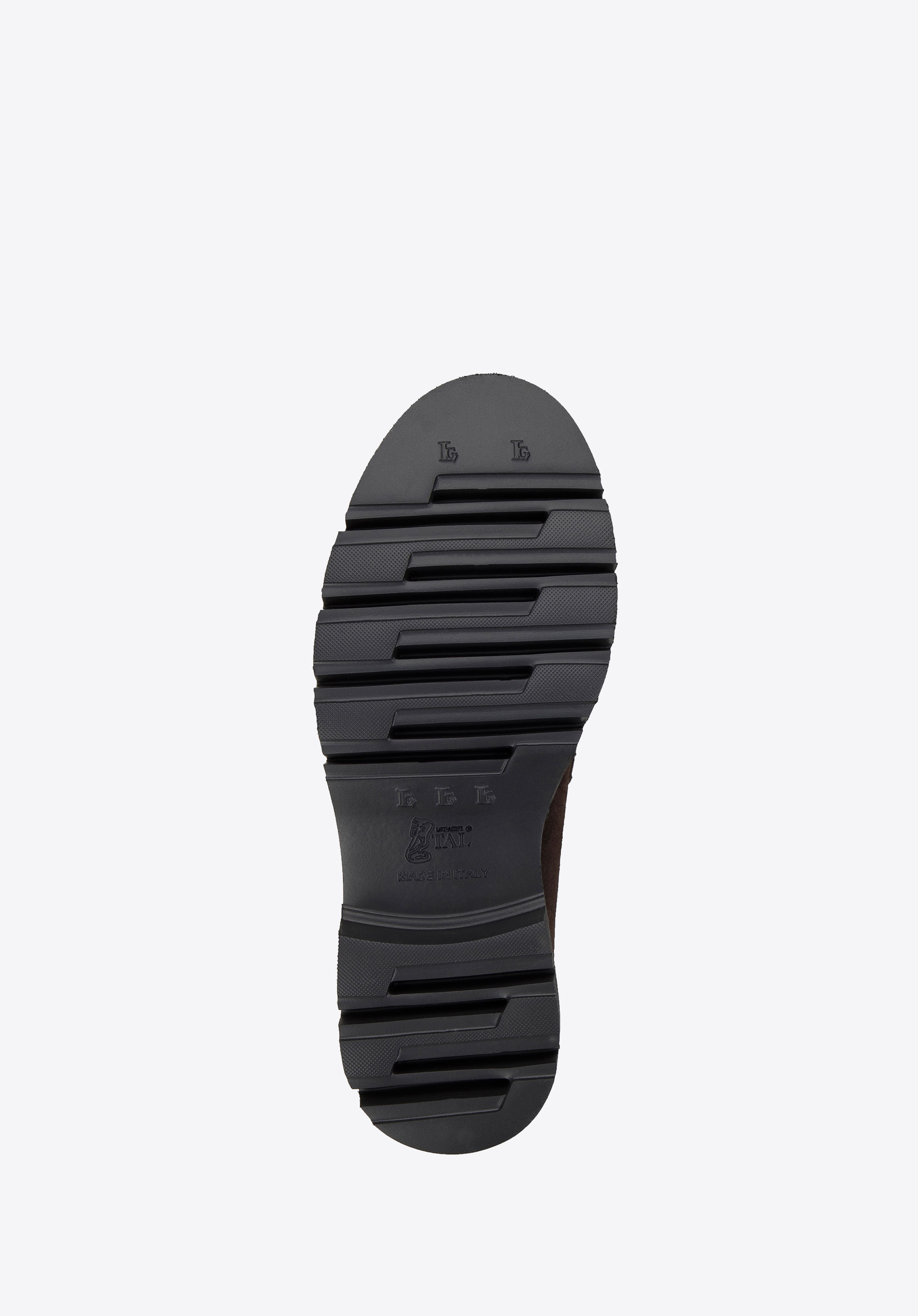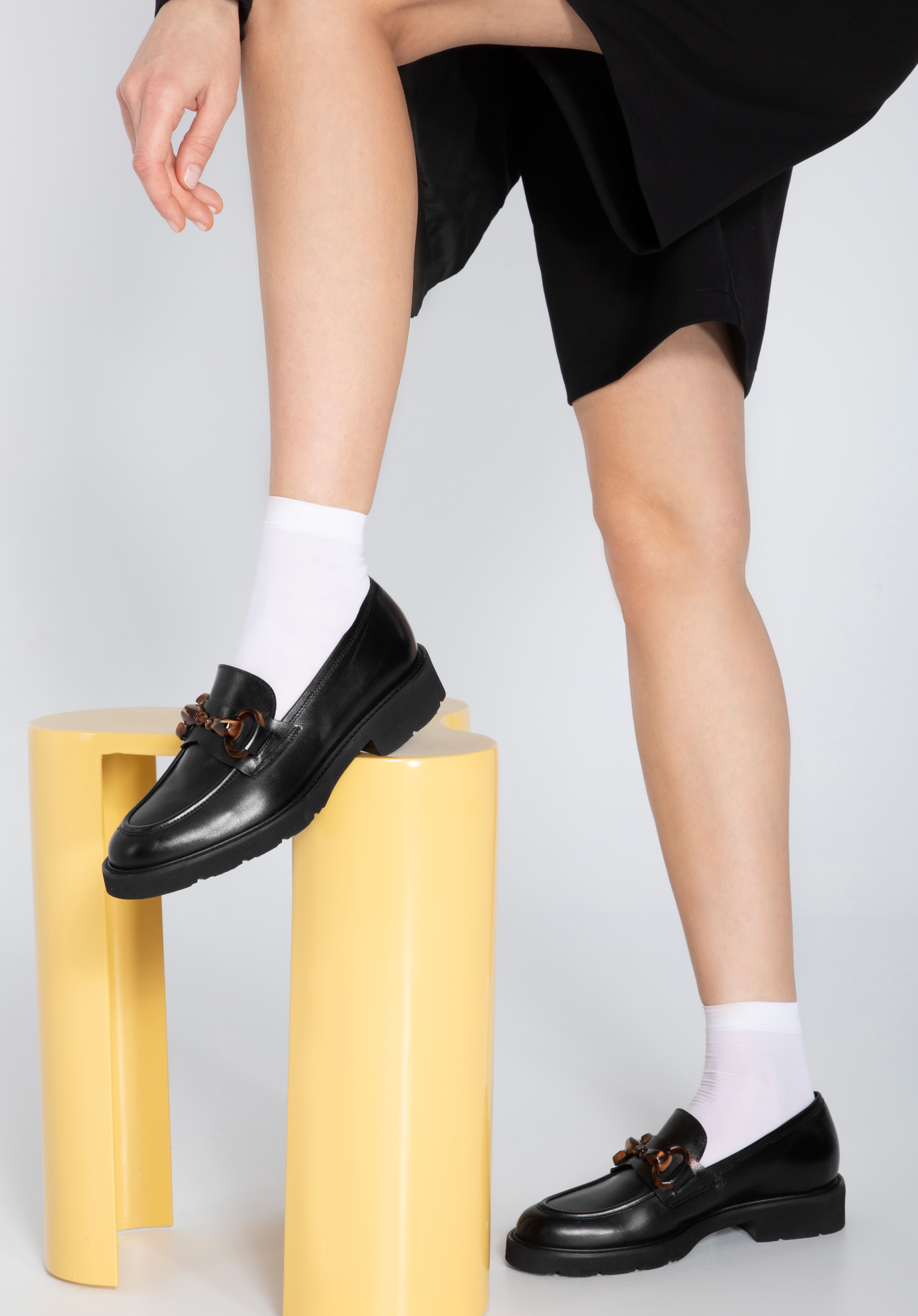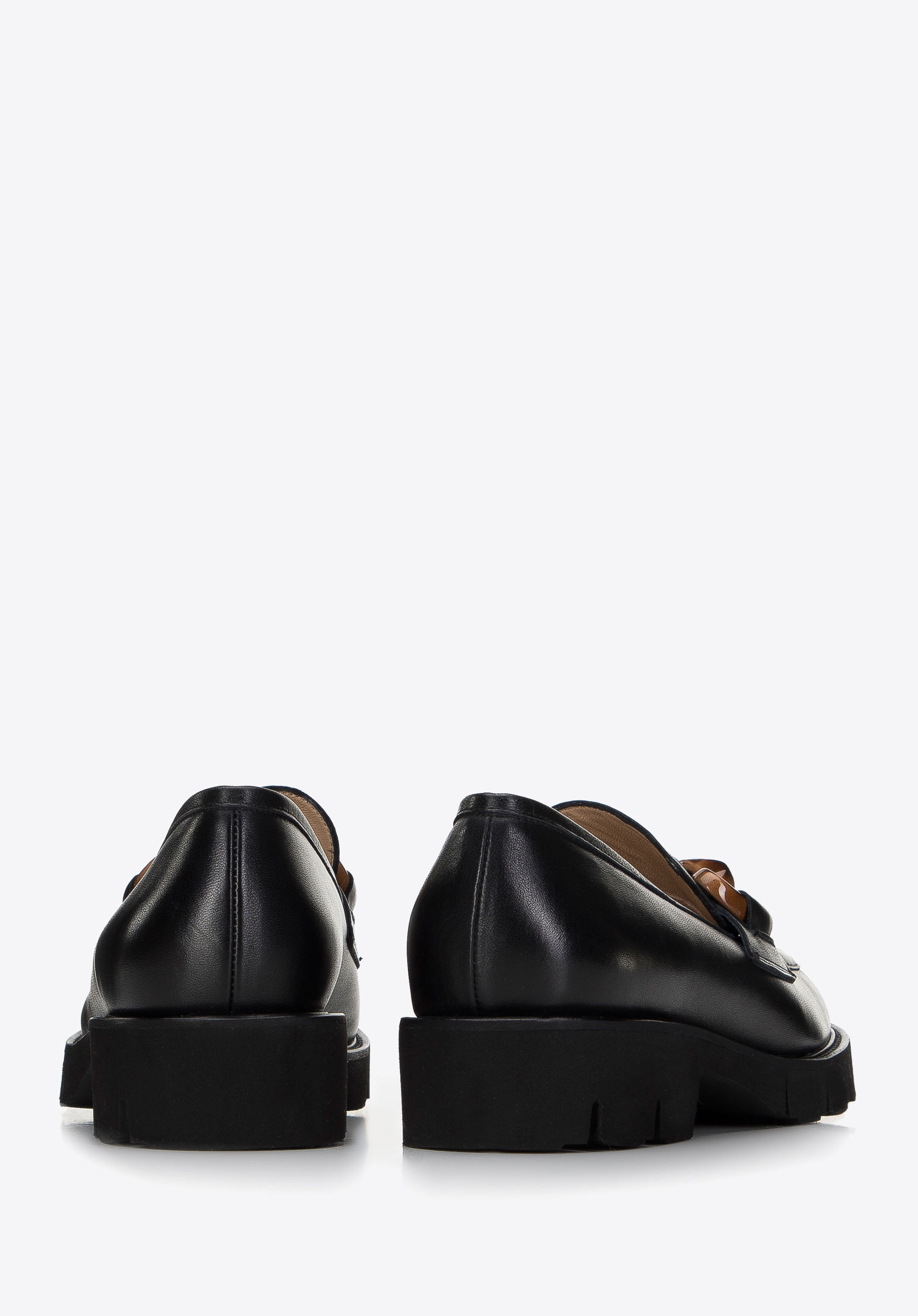 Це взуття стане в нагоді кожній жінці, яка любить класику в сучасній нотці. Вічний дизайн мокасинів з характерно обробленим носком доповнено коричневою пряжкою з ніжним малюнком. Вони виготовлені з високоякісної натуральної шкіри, тому прослужать вам багато сезонів. Товста платформа з рифленням забезпечує хороше зчеплення. Взуття тонке та досить легке, тому це чудовий вибір як для роботи, так і після роботи. Ви можете носити жіночі шкіряні мокасини з пряжкою на платформі з улюбленою міні-сукнею, широкими брюками і сорочкою - ви будете виглядати шикарно в будь-якій ситуації.