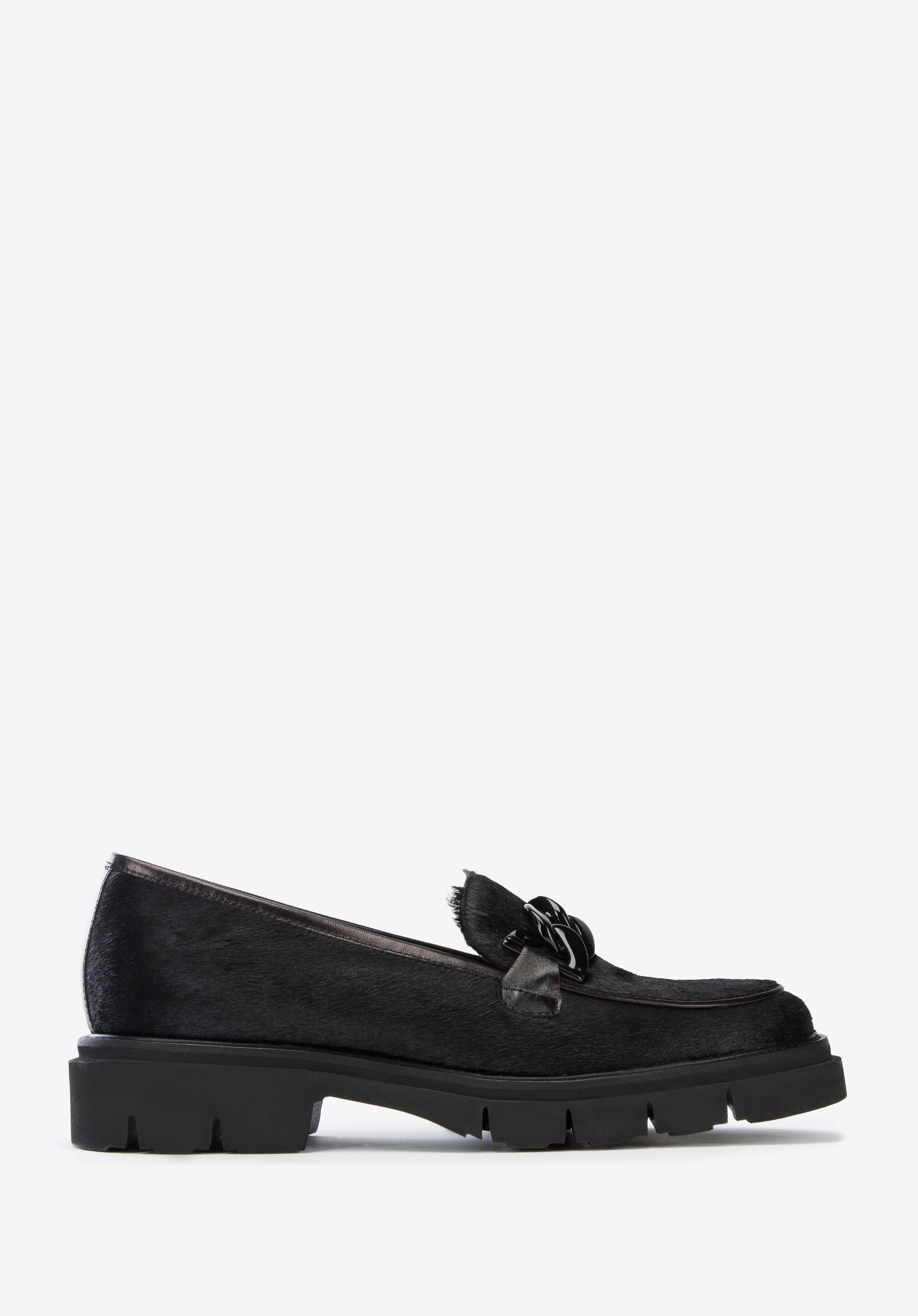 У цьому унікальному взутті ви не залишитеся непоміченою. Вони були виготовлені в Італії зі шкіри з ворсом, що надає всьому цьому унікальний характер. Класичний стиль мокасинів доповнює злегка блискучий чорний ланцюжок. Завдяки товстій платформі в них можна комфортно ходити багато годин. Носіть їх з улюбленою міні-сукнею або поєднуйте з джинсами та сорочкою - ви виглядатимете стильно в будь-якій ситуації. Жіночі шкіряні мокасини з товстим ланцюжком - це модний аксесуар, який можна носити кожен день.