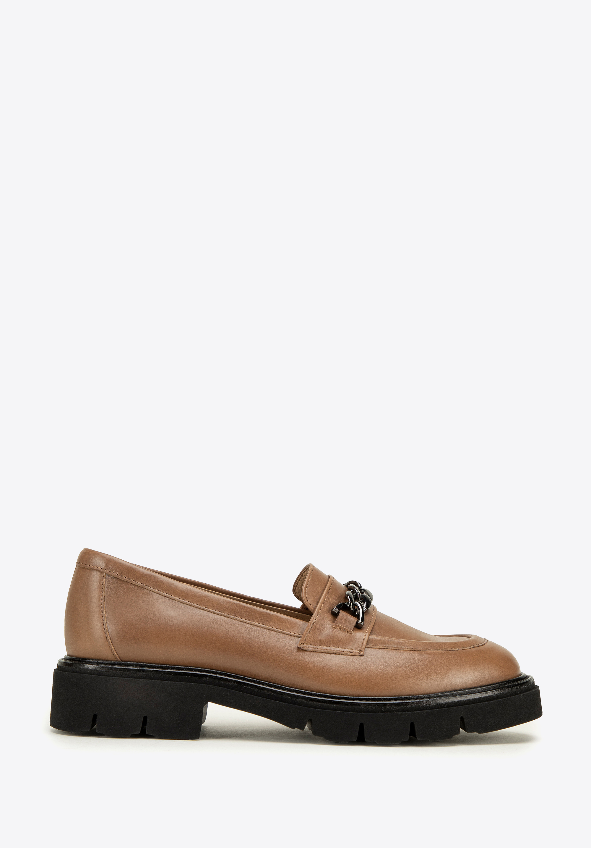 Відкрийте для себе елегантність і комфорт в одному завдяки нашим мокасинам із гладкої шкіри. Оснащені мигдалеподібним носком і декоративним ланцюжком, ці мокасини поєднують сучасний стиль із ноткою розкоші. Плаский каблук забезпечує стабільність і зручність, тож ви можете насолоджуватися кожним кроком без жодного дискомфорту. Мигдалеподібний носок візуально подовжує ноги, додаючи витонченості кожному образу.