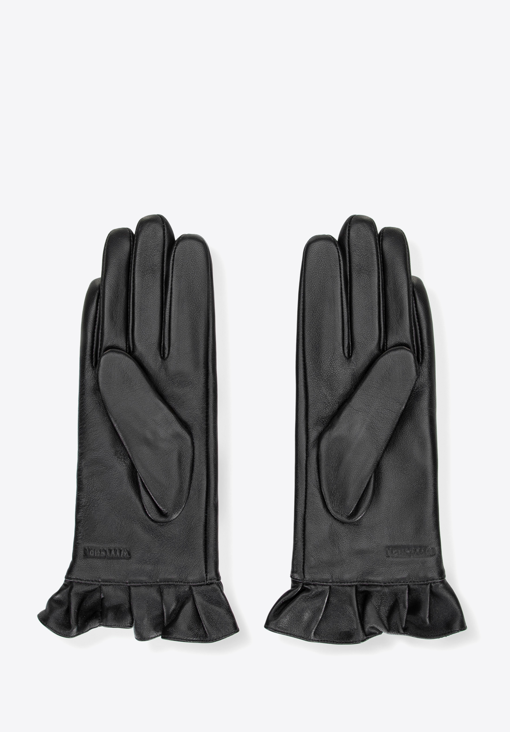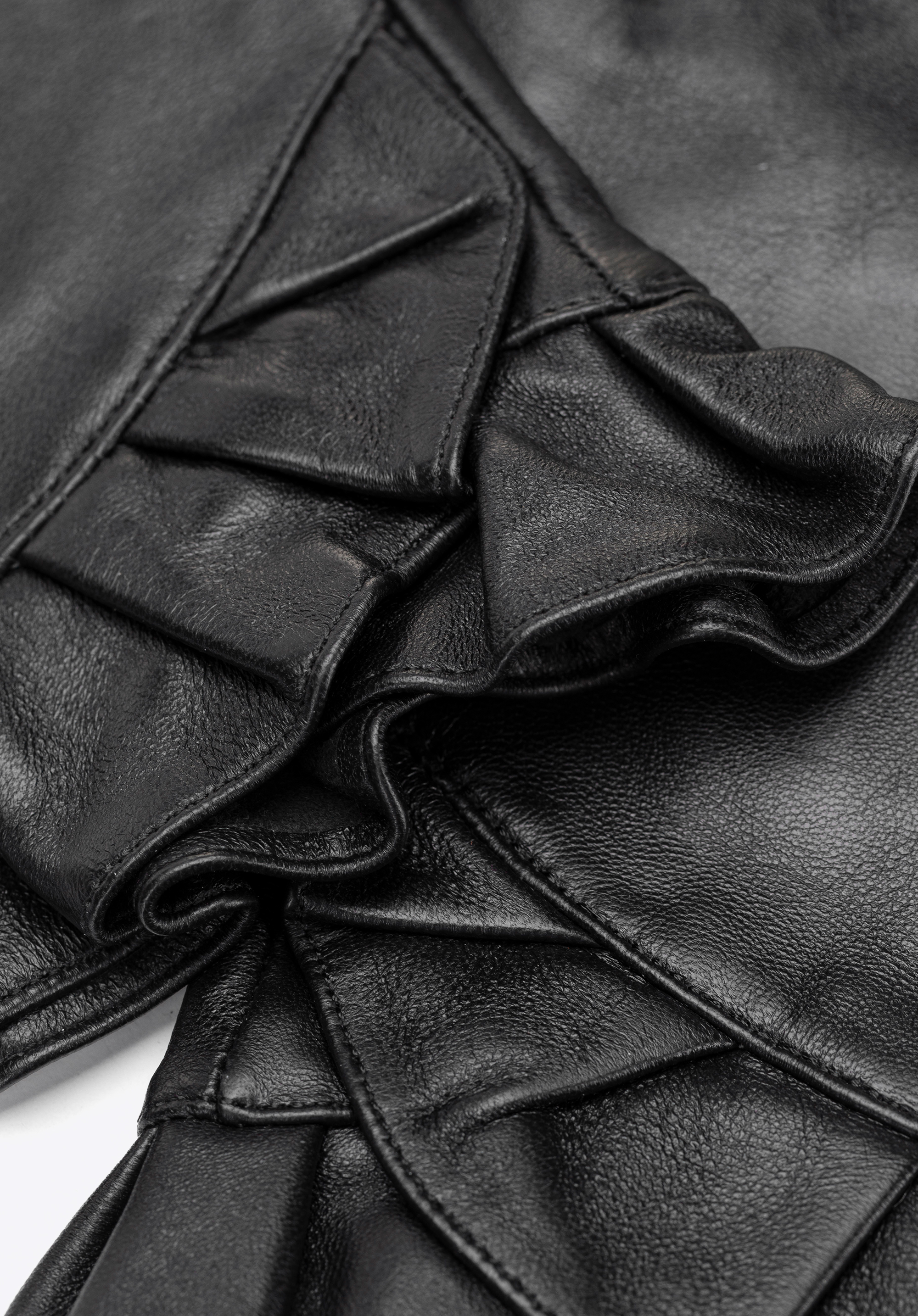 Поповніть свій зимовий гардероб аксесуаром, який поєднує класичний стиль з витонченим, сучасним штрихом. Ці жіночі рукавички виготовлені з м'якої, міцної натуральної шкіри , яка цінується за свою елегантність та стійкість. Внутрішня підкладка з поліестеру ніжно огортає ваші руки теплом, забезпечуючи комфорт навіть у найхолодніші дні. Декоративна рюша на манжеті додає жіночного шарму, а тонкий тиснений логотип бренду підкреслює дизайнерську привабливість.