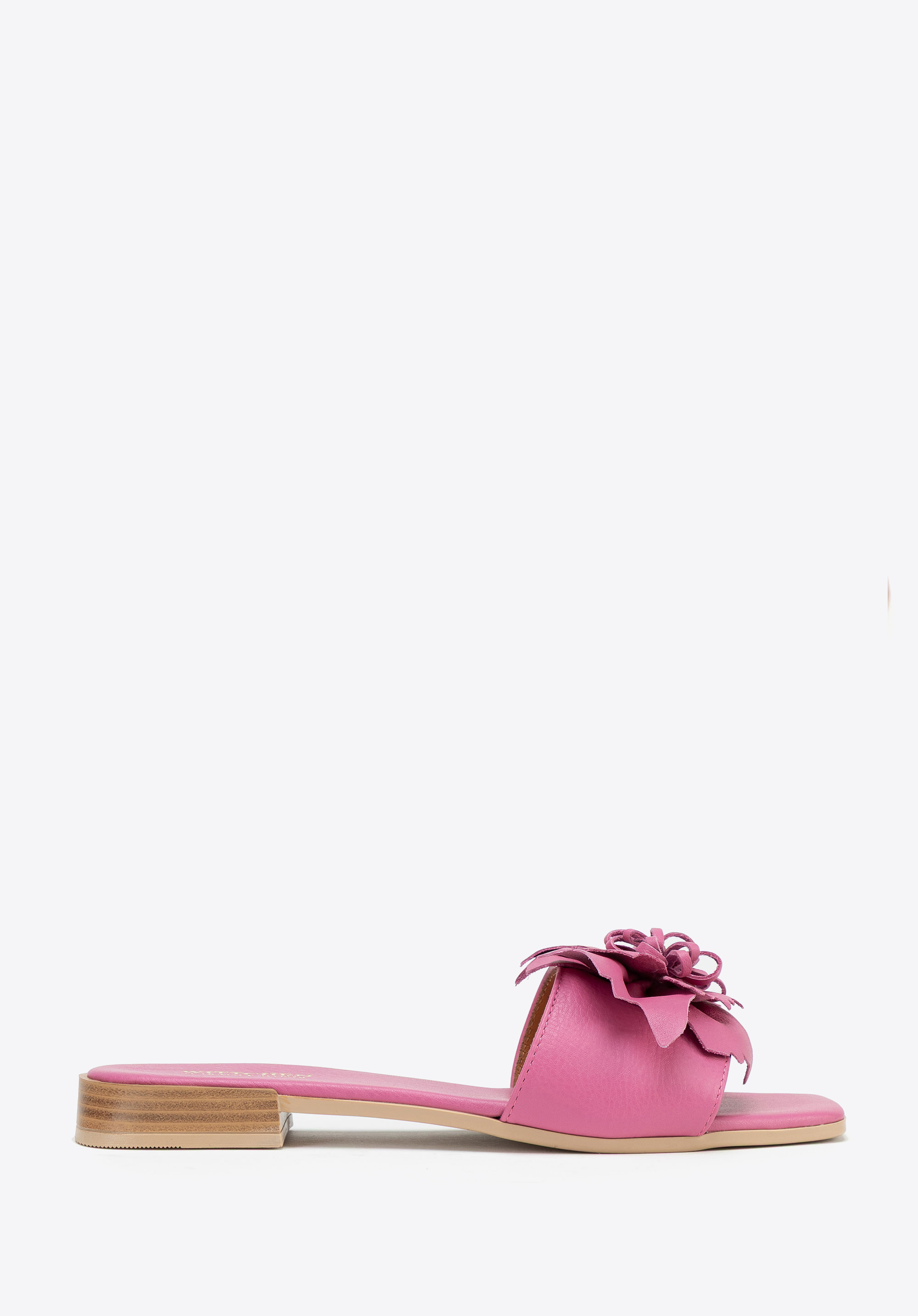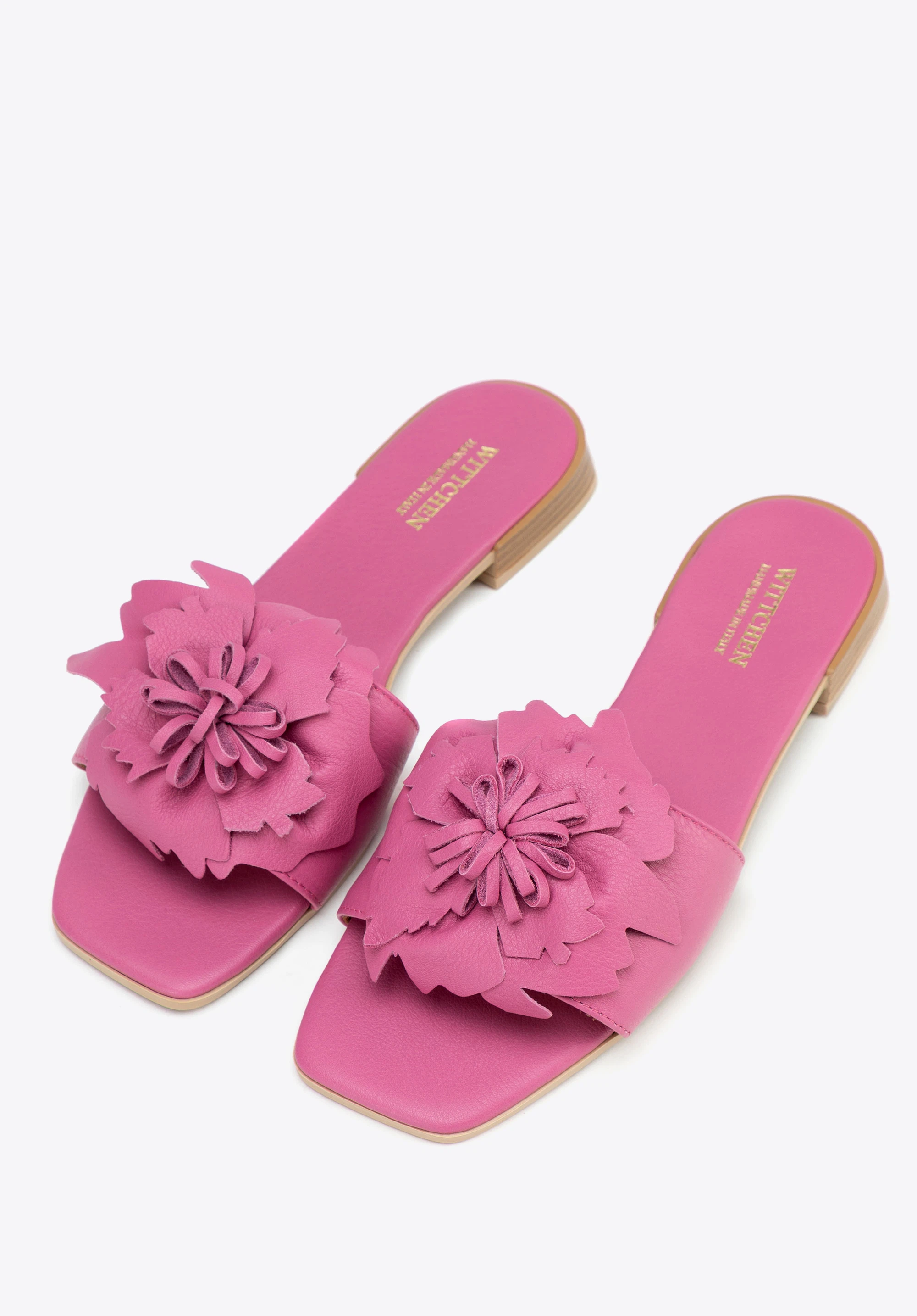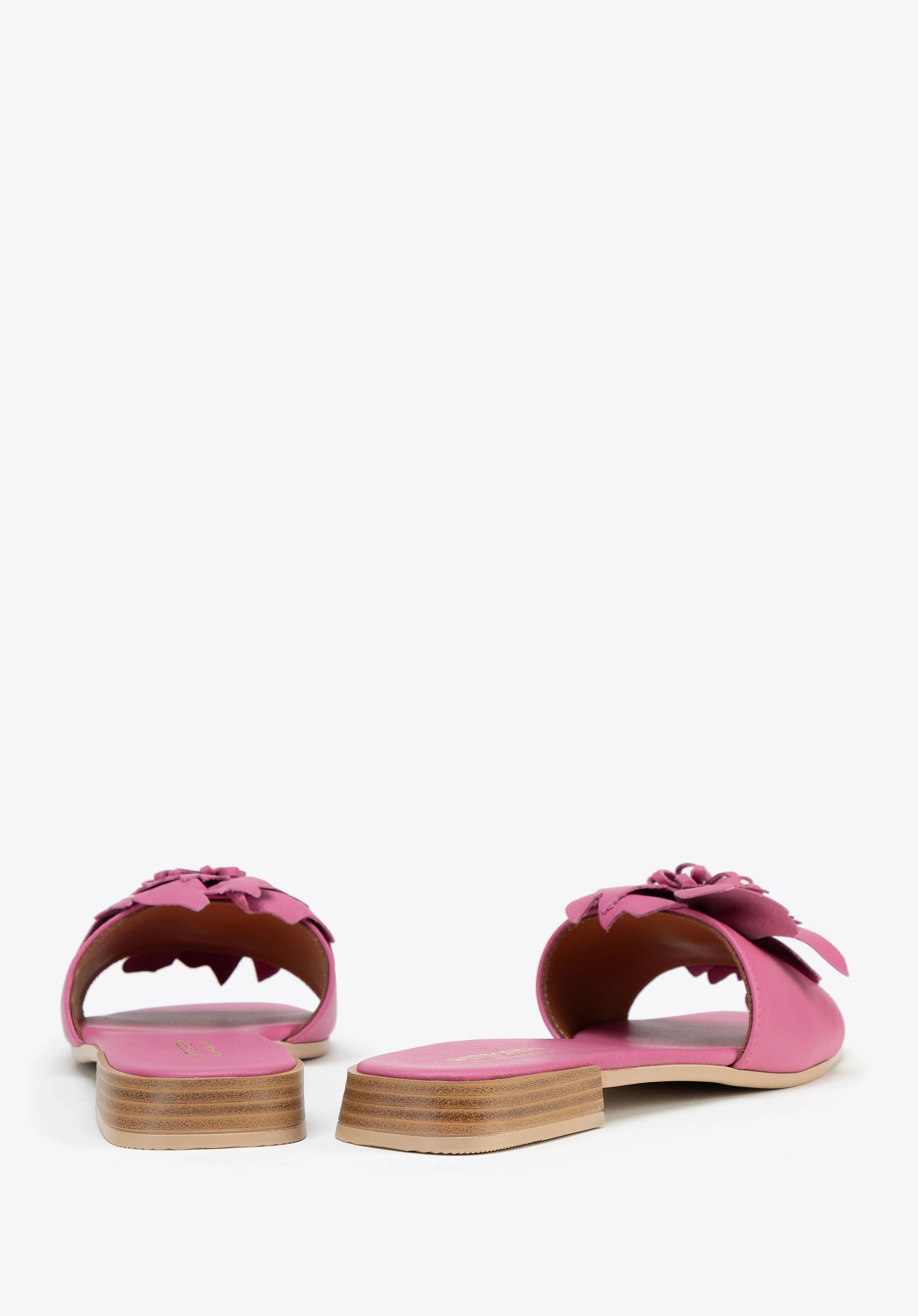 Жіночі шкіряні шльопанці з декоративними квітами рожеві