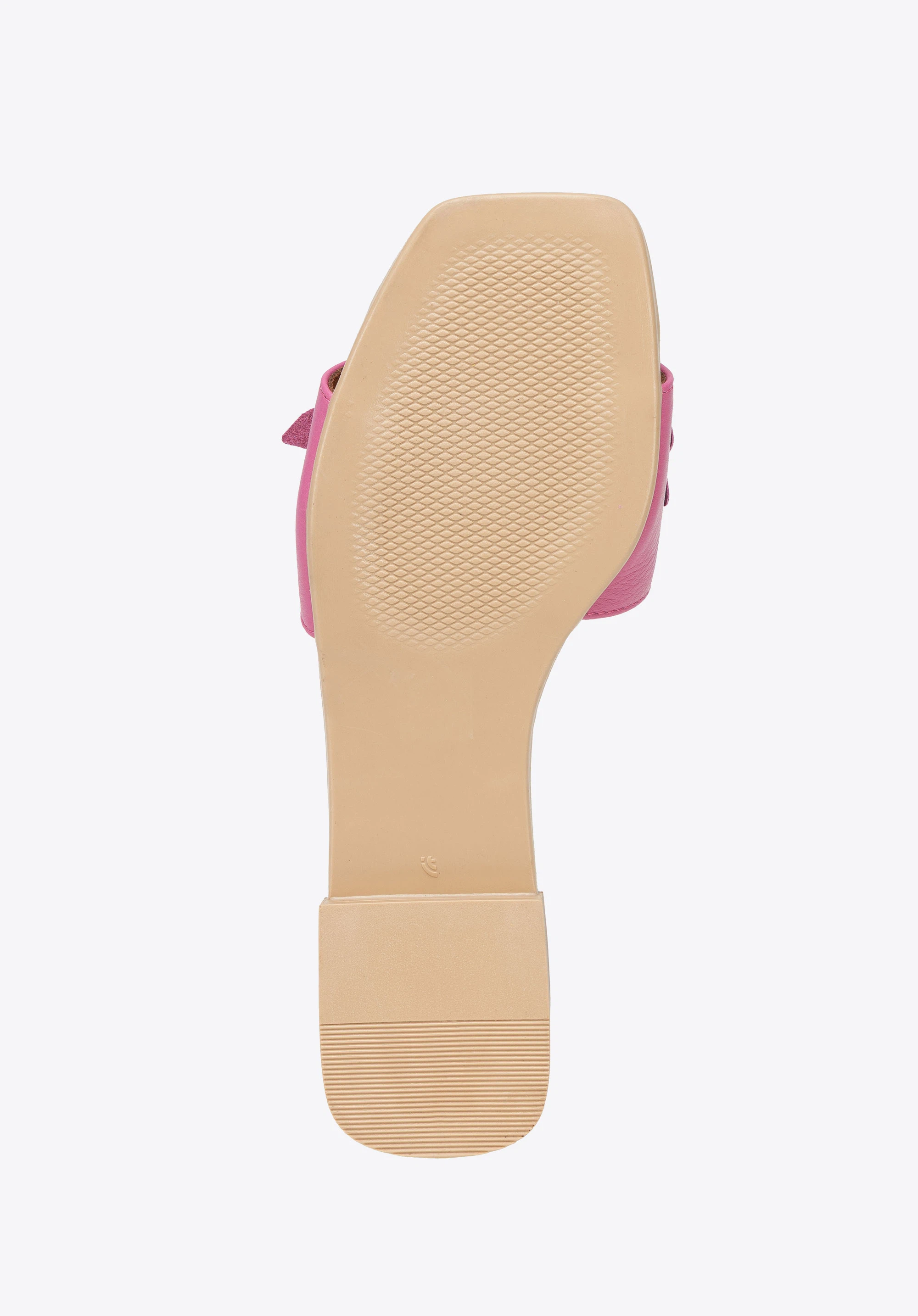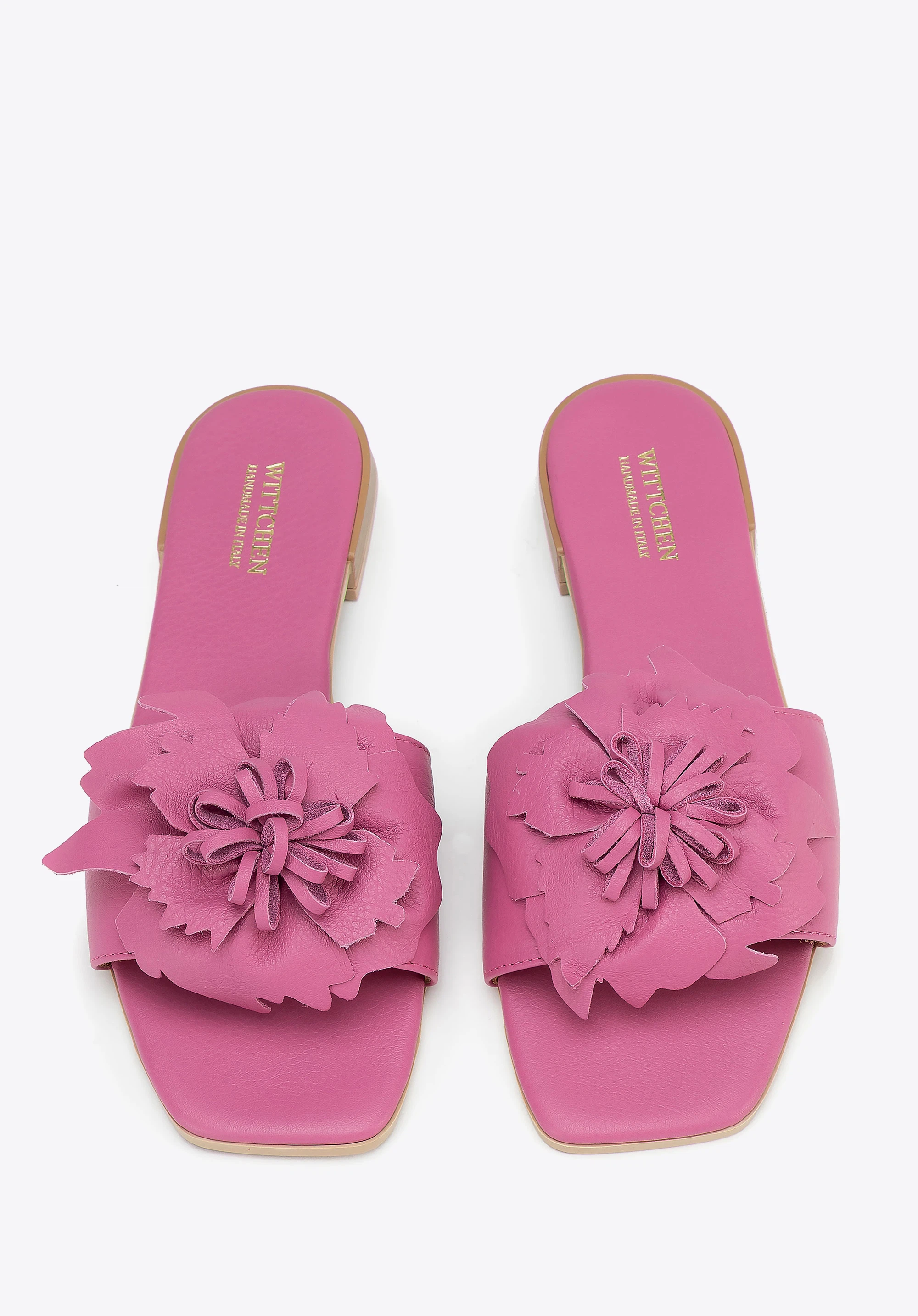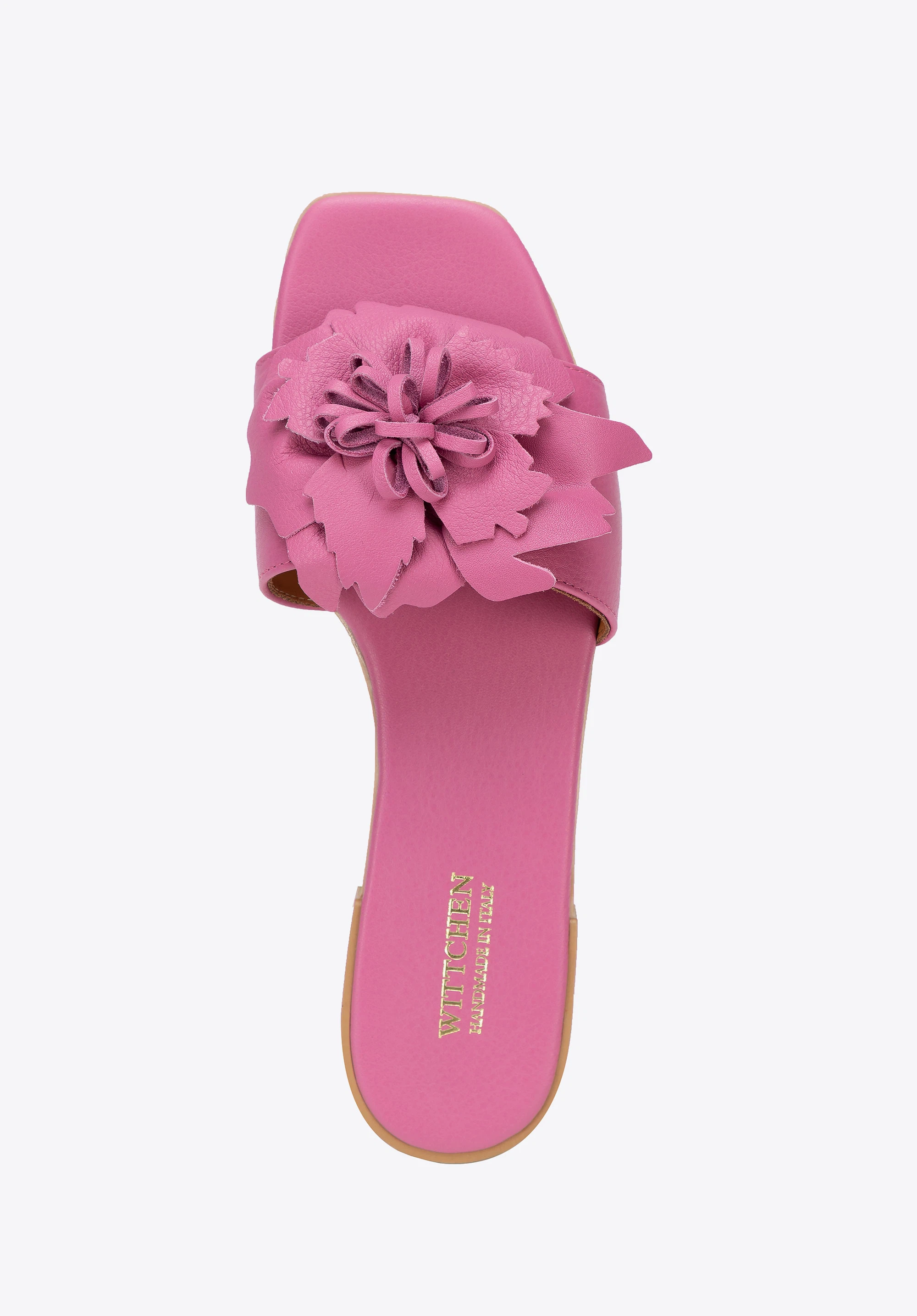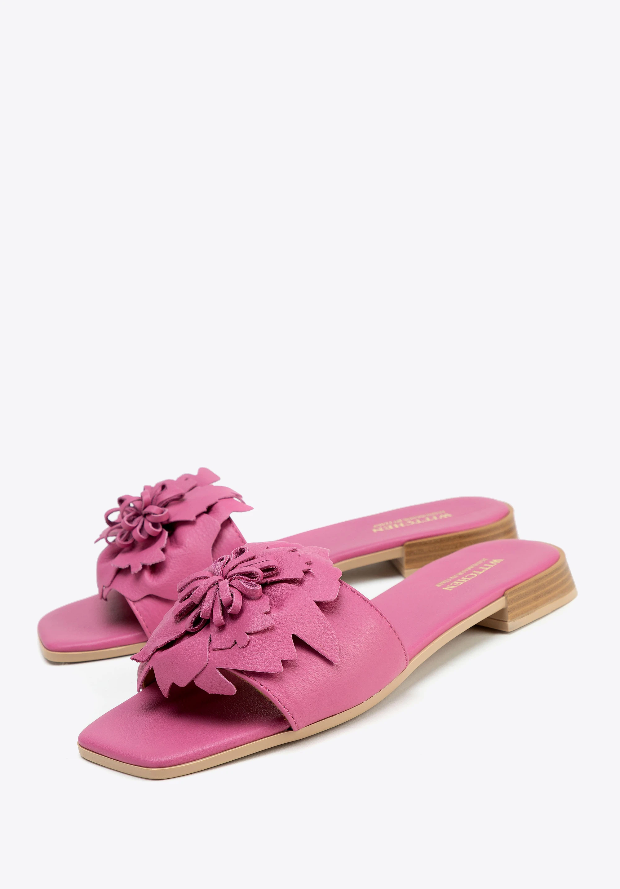 Жіночі шкіряні шльопанці з декоративними квітами рожеві